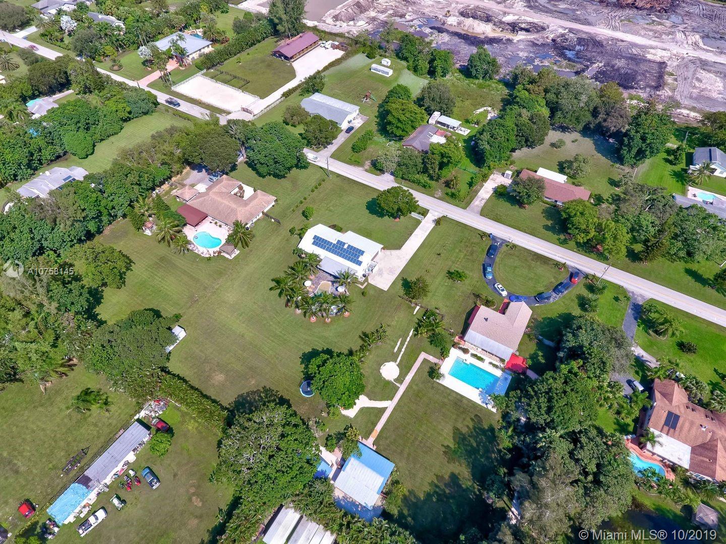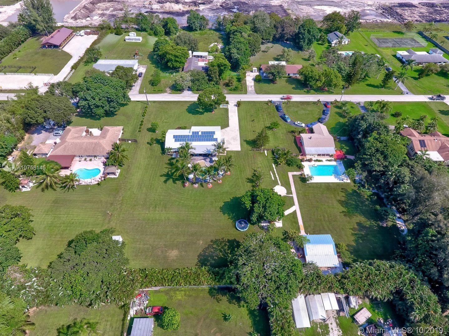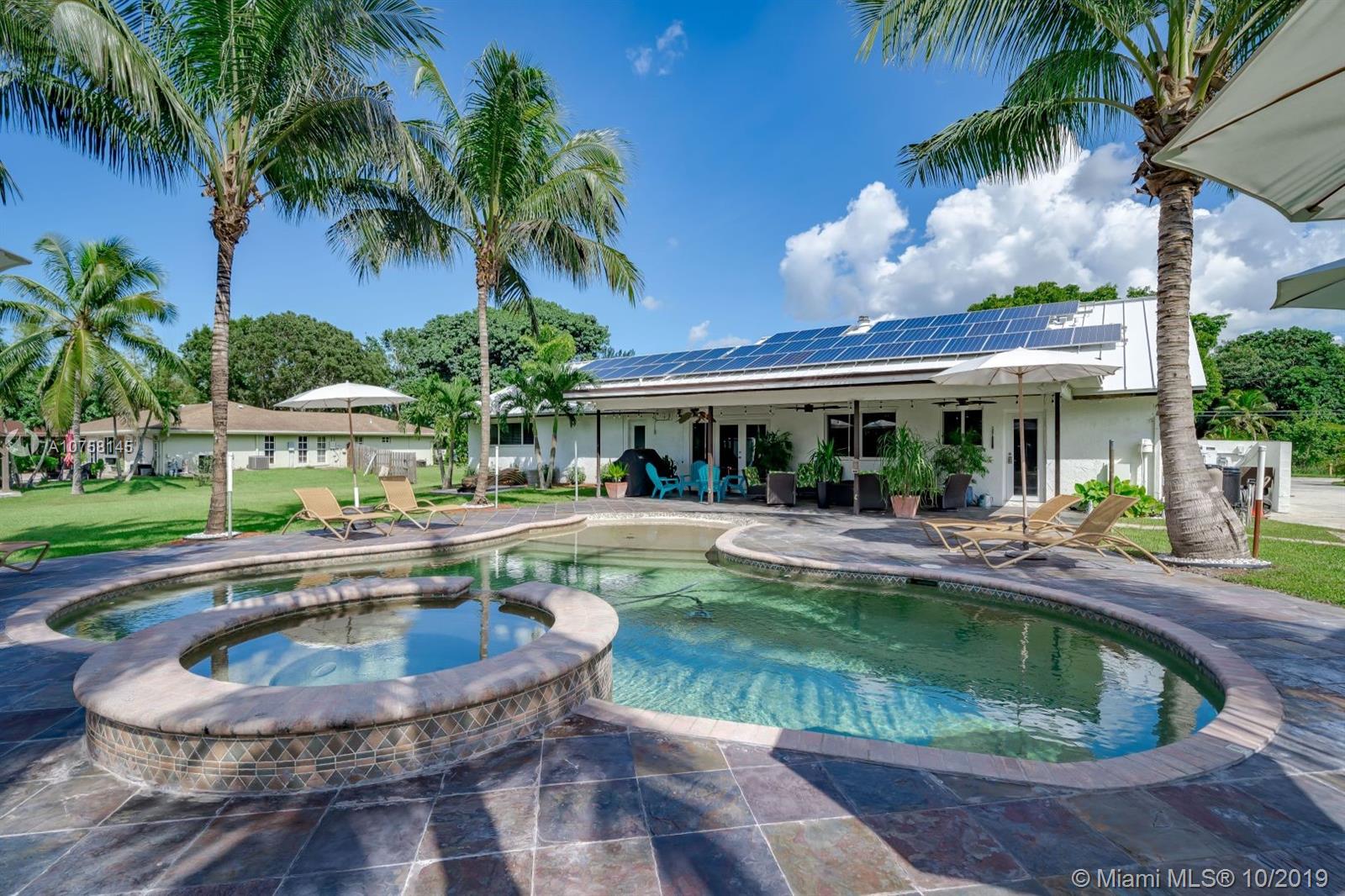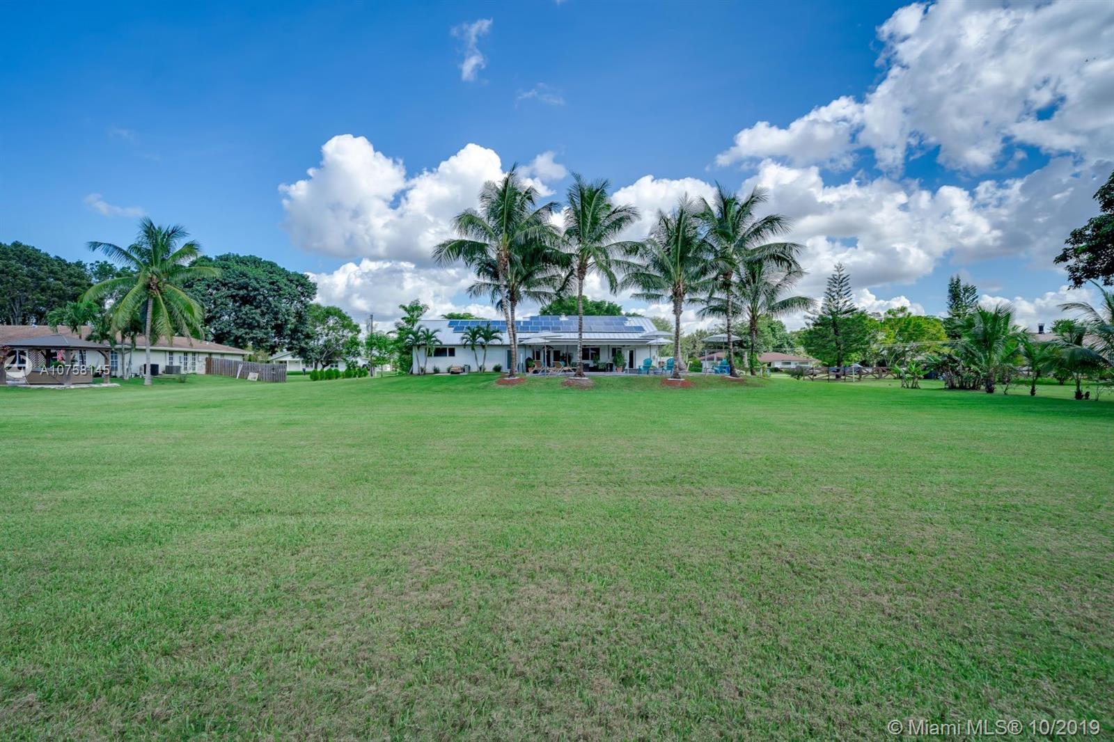 Amazing 1.19 acre 3 bedroom 2 bath home in Southwest Ranches! Completely upgraded, entertain friends and family with custom designed heated pool with salt chlorinator, new 80 year plus Metal roof, new completely renovated master bathroom, home theatre room, impact windows and doors for hurricane protection, Travertine marble floors. If you like working out, this home features a complete commercial grade gym with all the equipment (not included but negotiable). Tons of storage space including storage in attic with subflooring, and 12x24 container/shed. All furniture is negotiable. Don't pay for water, this home includes deep well water pump with water softener, also a shallow well for possible irrigation system. Save electricity with 44 solar panels, and much more, come see it now!