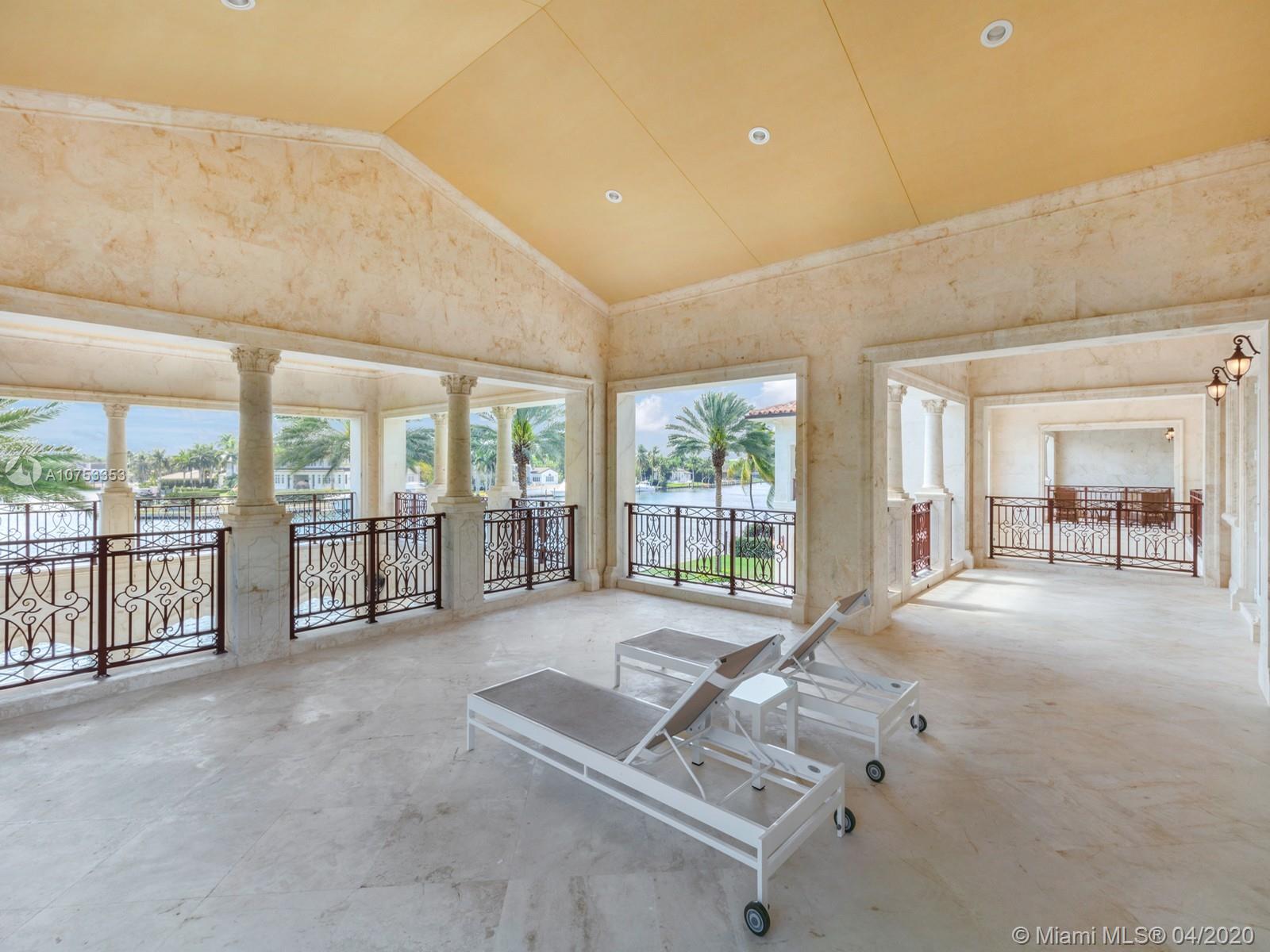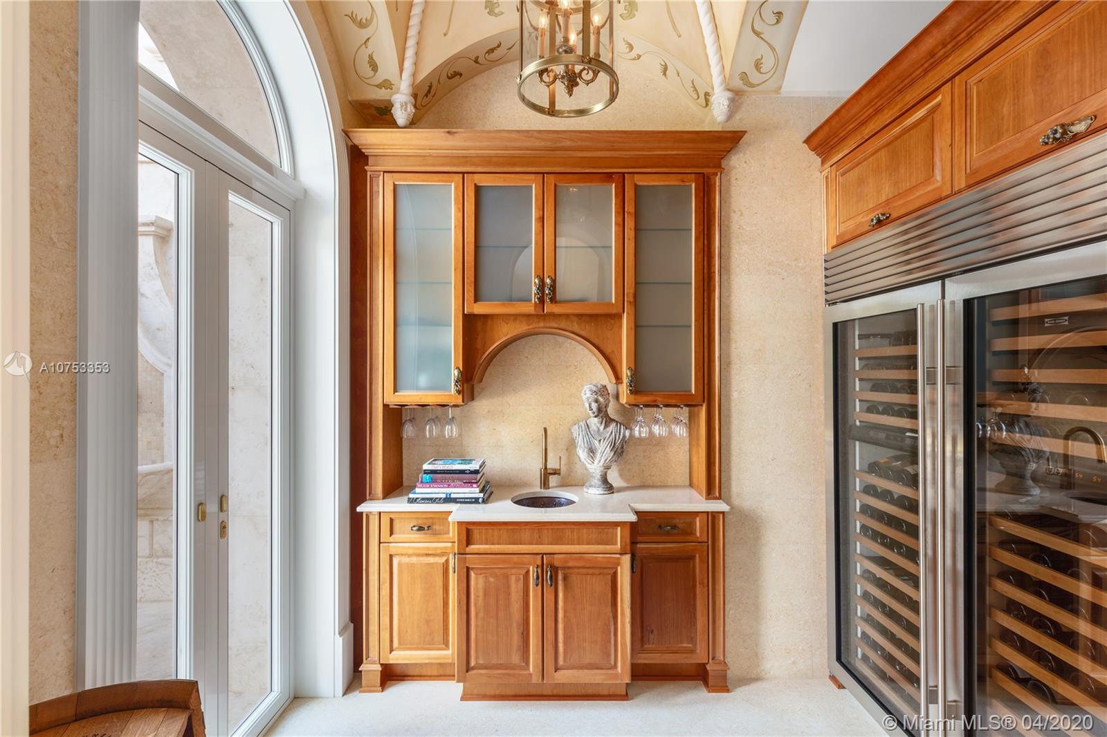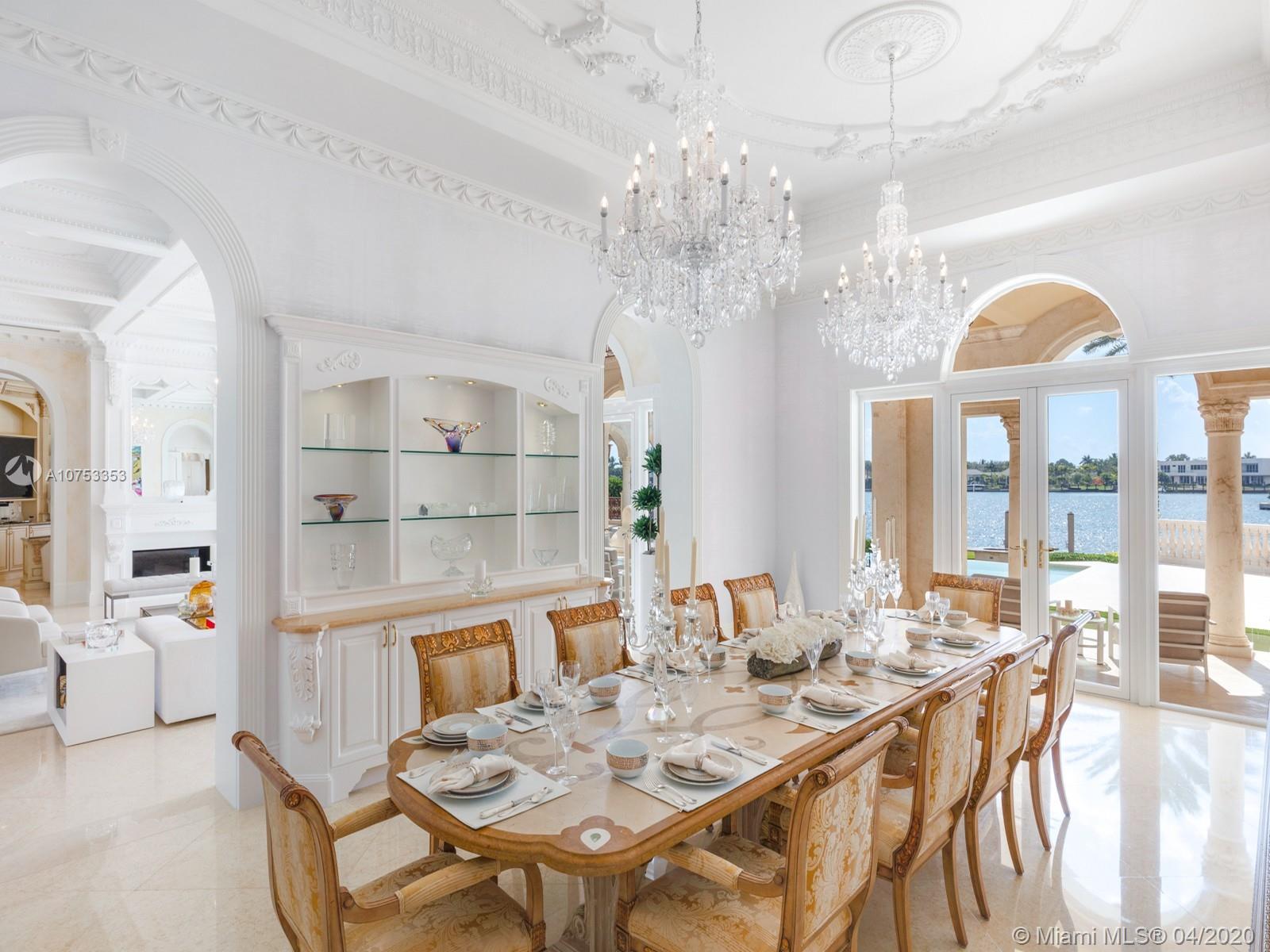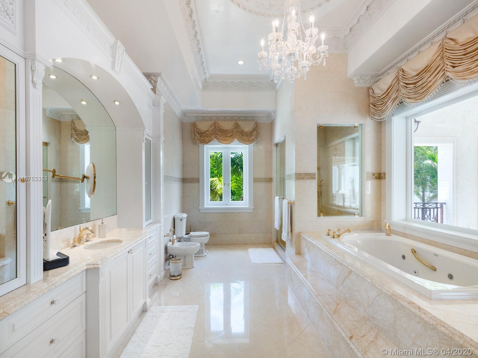 Two story Palatial/Neo-Classical Italian style villa designed by renowned architect Ramon Pacheco. This Dream home is 18,073 total sq feet, w/14,443 adjusted living area, facing south on wide Gables Estates lagoon with marble veneer walls & custom carved stone elements throughout. 200 feet of new seawall with 140 foot dock. 2,888 sq feet first floor covered terrace & 1,222 sq feet second floor covered terrace area. Huge Master suite with his/her bath with huge walk in closets, 5 additional En suite bedrooms & 2 bedroom staff quarter. Exquisite Venetian Plaster with carved plaster moldings throughout, 2 story foyer with crystal chandeliers. Custom crafted kitchen with butlers pantry, 600 bottle custom wood wine cellar. Library/Office with fireplace, private side entry. Huge Gym w/full bath.
