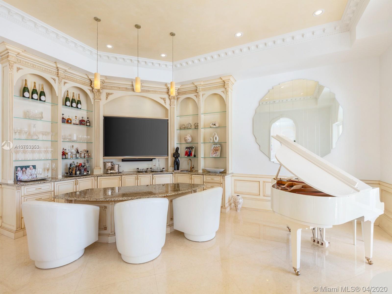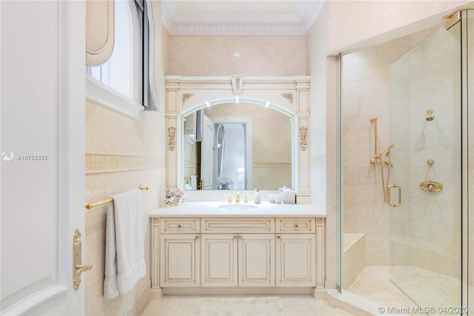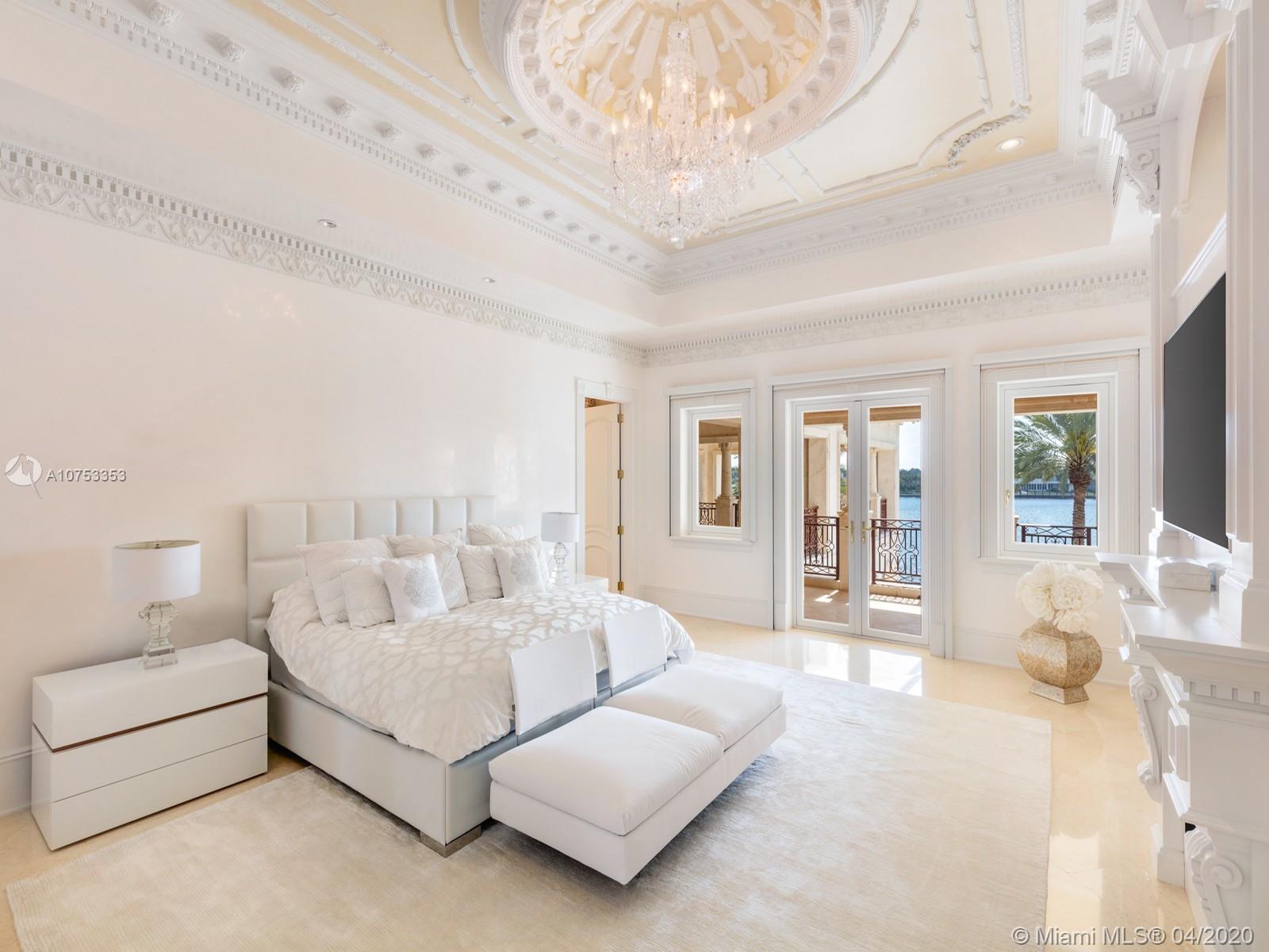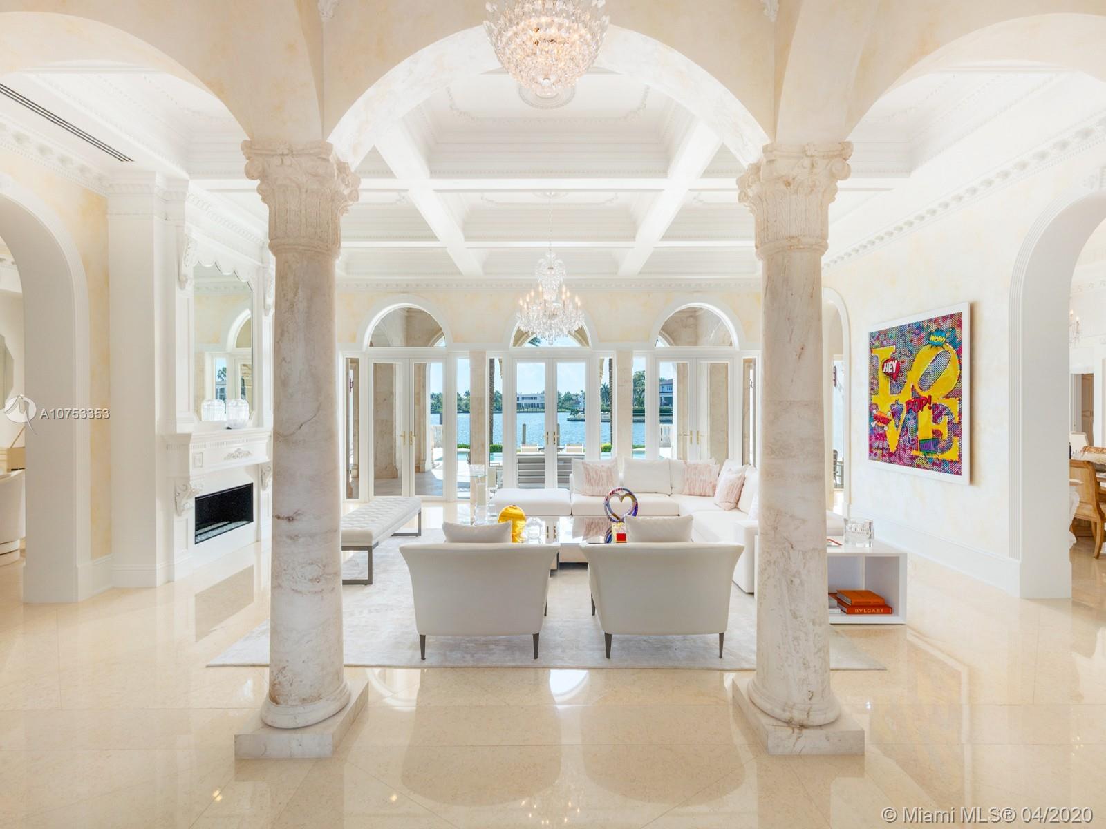 Two story Palatial/Neo-Classical Italian style villa designed by renowned architect Ramon Pacheco. This Dream home is 18,073 total sq feet, w/14,443 adjusted living area, facing south on wide Gables Estates lagoon with marble veneer walls & custom carved stone elements throughout. 200 feet of new seawall with 140 foot dock. 2,888 sq feet first floor covered terrace & 1,222 sq feet second floor covered terrace area. Huge Master suite with his/her bath with huge walk in closets, 5 additional En suite bedrooms & 2 bedroom staff quarter. Exquisite Venetian Plaster with carved plaster moldings throughout, 2 story foyer with crystal chandeliers. Custom crafted kitchen with butlers pantry, 600 bottle custom wood wine cellar. Library/Office with fireplace, private side entry. Huge Gym w/full bath.