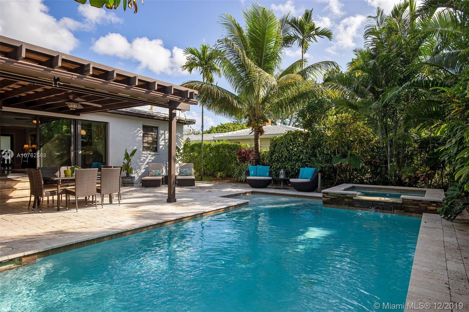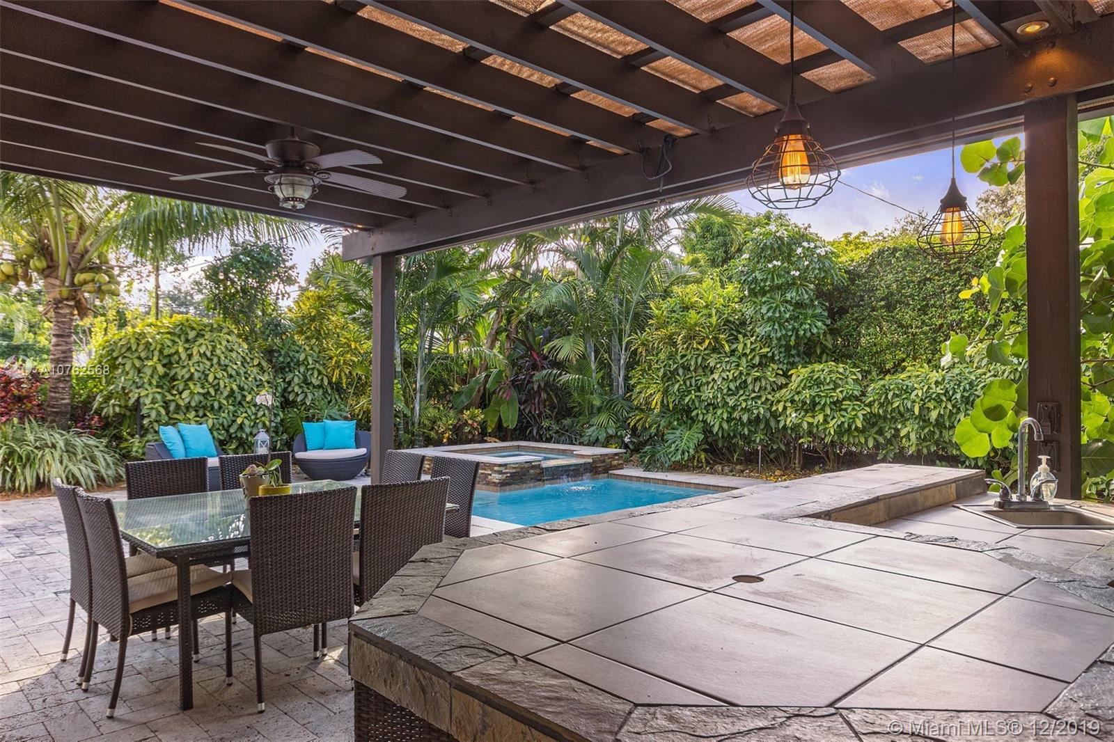BEAUTIFUL 4 BEDROOM + DEN WITH 3 FULL BATHS IN THE HEART OF MIAMI SHORES. SPACIOUS DINING AND LIVING AREAS OPEN TO PRIVATE FENCED YARD WITH RESORT STYLE POOL, JACUZZI, OUTDOOR KITCHEN AND PERGOLA - PERFECT FOR YEAR ROUND ENTERTAINING. LARGE KITCHEN WITH EATING BAR, MARBLE COUNTERTOPS AND GOURMET APPLIANCES. SPLIT BEDROOM LAYOUT WITH ORIGINAL MASTER-ENSUITE BATH AS WELL AS GARAGE CONVERSION THAT INCLUDES NEW MASTER BEDROOM, BATH AND DEN/OFFICE. UPDATED ELECTRICAL, PLUMBING, A/C, SEPTIC, ALARM AND BUILT IN AUDIO SYSTEM. TREE-LINED STREET, WALKING DISTANCE TO SHOPS, PARK AND MORE.