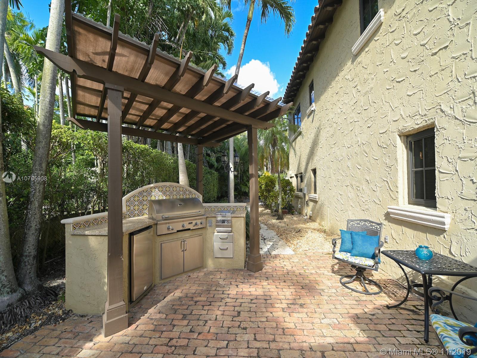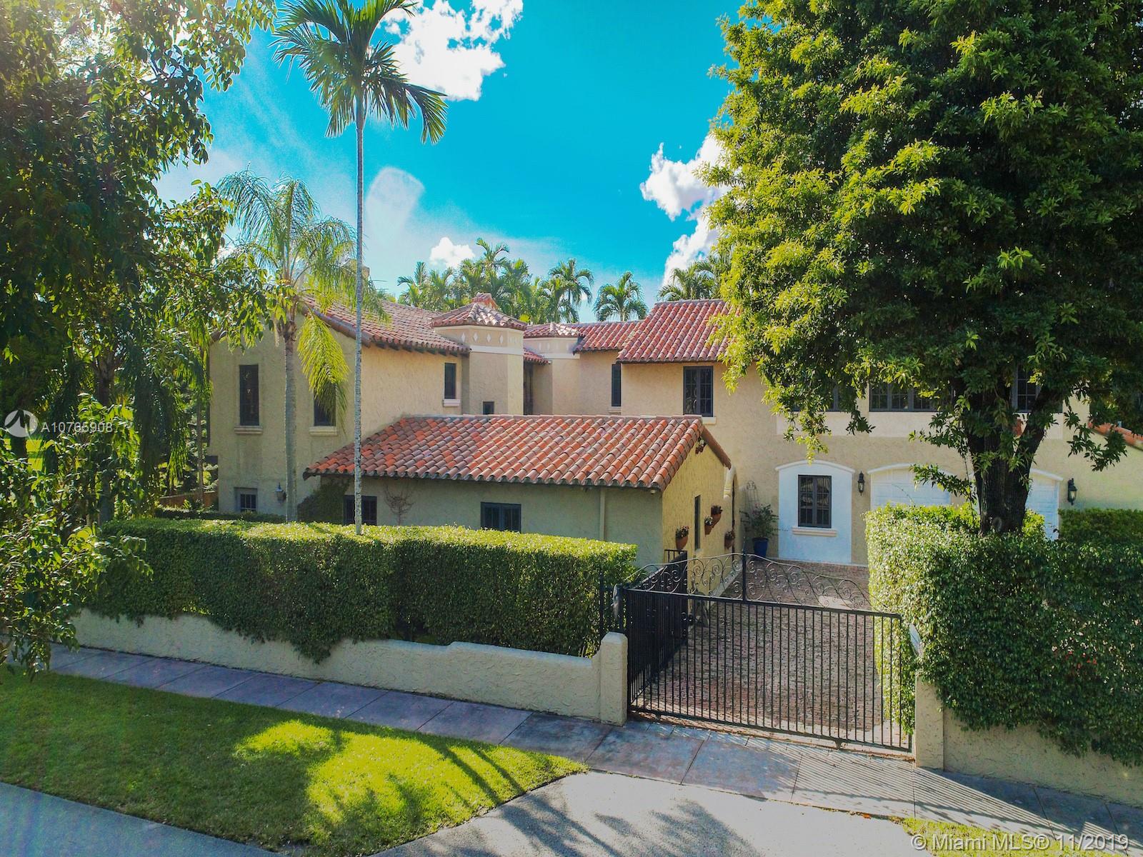 Stunning Mediterranean estate on coveted N. Greenway overlooking the Granada golf course oozes appeal from the very moment you enter the stenciled foyer. Well-appointed, spacious eat-in kitchen opens to a patio w/outdoor kitchen & to additional courtyards connecting to the pool area w/wet bar & outdoor bath. Downstairs boasts formal dining room w/fireplace, living room w/exposed wood beams & fireplace, library, expansive family rm w/wet bar (original master bd), guest wing & 2.5 baths. 2nd level offers master bd wing w/fireplace & sitting area, two generous size bds w/en-suite bath. Home also features tiled 2-car garage with double w/d, 6 a/c zones, video camera system. 3 fountains grace this fully walled & gated corner property. Enjoy your private oasis minutes frm downtown Coral Gables.