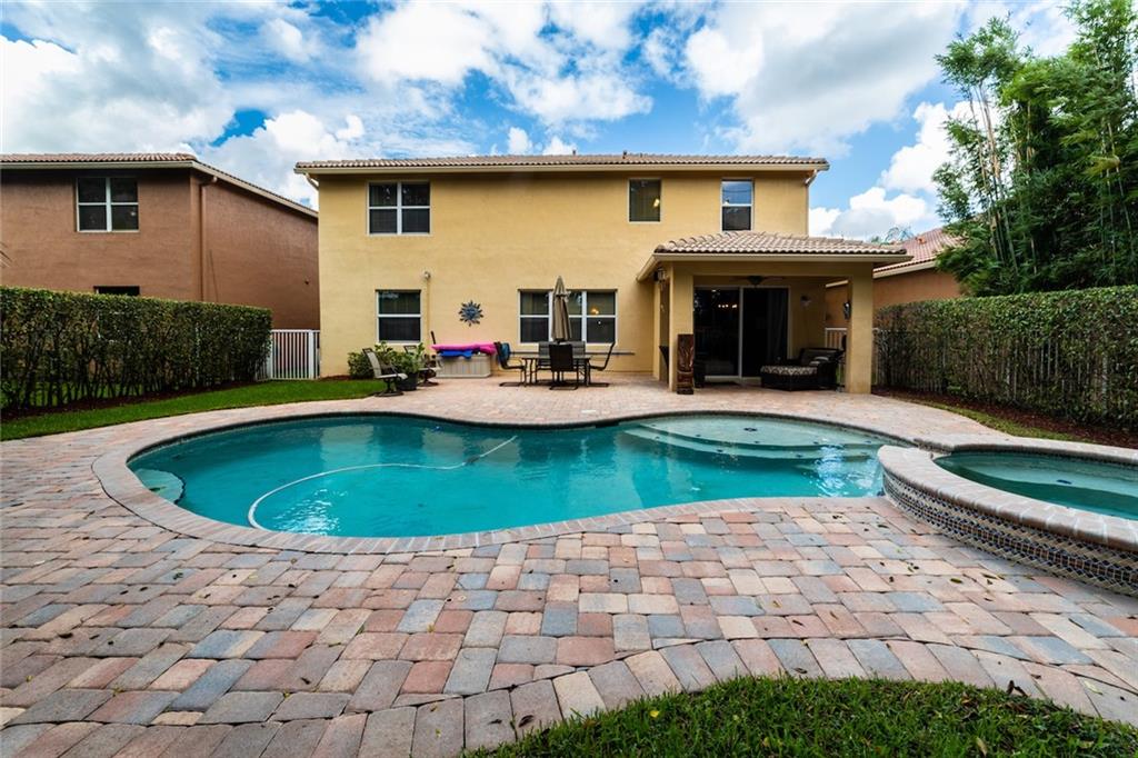 STUNNING 2 STORY CRYSTAL MODEL 5/4 HOME, LOFT AND 2 CAR GARAGE IN GATED ISLES AT WESTON COMMUNITY. UPGRADED KITCHEN WITH LESS THAN 1 YR OLD STAINLESS STEEL APPLIANCES AND GRANITE COUNTER. HARDWOOD FLOORING DOWSTAIRS, STAIRS AND 2ND STORY HALLWAY WITH TILE IN KITCHEN AND BATHS. MASTER BEDROOM WITH DUAL CUSTOM CLOSETS. ONE BEDROOM AND FULL BATH ON FIRST FLOOR. EXTRA STORAGE UNDER THE STAIRS FROM INSIDE THE GARAGE. STEP OUTSIDE INTO YOUR PRIVATE OASIS WITH POOL/SPA AND TIKI HUT WITH BAR STOOLS (5 INCLUDED) READY FOR ENTERTAINING. A+ SCHOOLS NEARBY. HOA dues include alarm monitoring, cable/internet and access to community pool, gym, tot lot, volleyball and basketball court all secure gated community.