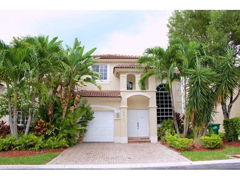 Coach model corner with 3 bed/2.5 bath in prestigious Doral Isles. Features double door entrance, high ceiling, mezzanine, large open kitchen w/nice artistic stonewall & SS appliances. Enjoy the upgraded huge master bathroom w/separate whirlpool tub. Til e flooring downstairs, dark wood laminate upstairs. Fenced backyard, extra storage. Upgraded patio with pavers. Gated, 24/7 security; resort style, huge gym, 2 pools, soccer field, baseball & basketball courts. Plenty of guest parking. Easy to show.