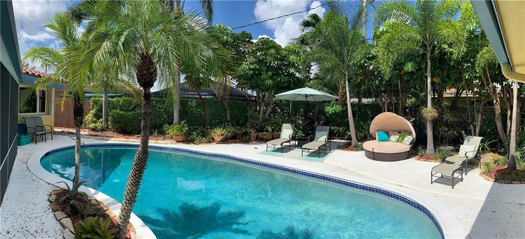 Tropical paradise in desirable Imperial Point. Beautifully, updated home w/ private backyard, pool & mature landscape setting. Move in ready! Home features tile throughout, master suite has beautiful pool view & access, custom closets, plantation shutters throughout, updated master bathroom with custom sea glass and shells tile and custom vanity w/ glass sink. Magnificent gourmet kitchen with "Blue Louise" granite from Brazil, Custom maple cabinets, Pantry, SS GE appliances, Gas Range, Wine Cooler, Kitchen Island with Murano Glass Lights, Breakfast area. Enjoy a Pool with lush landscaping, covered Patio perfect for entertaining. Family Room, Large bedrooms, wood floors, updated bathrooms. High Impact windows & doors. Excellent Public and Private Schools, Pine Crest, Westminster Academy.