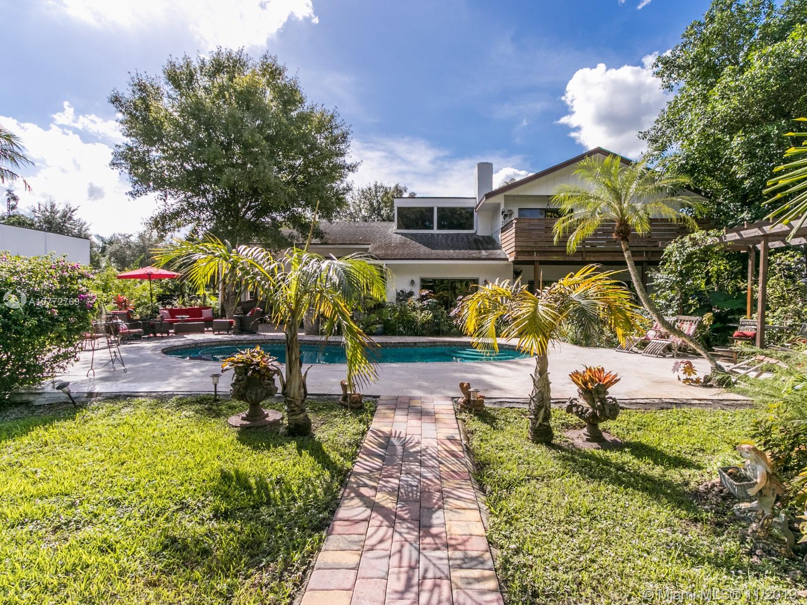 A magical property in every sense. Recently updated 4BR, 3BA pool home on an acre of land. Soaring ceilings with skylight windows and exposed beams in the living room and an exposed brick double fireplace shared with the family room. Wander the extensively landscaped paver paths to gazebos, pergolas, decks, water features and restful areas scattered through the lush property. Rear wall is lined with windows and glass sliding doors to let in maximum light and a view of the grounds. Modern white kitchen with gas range and stainless appliances. Master bedroom has a huge deck overlooking the pool and backyard areas. One bedroom and bath downstairs. Large laundry room and garage. Must be seen to be fully appreciated. Nestled among million-dollar estate homes in lovely Plantation Acres. No HOA.