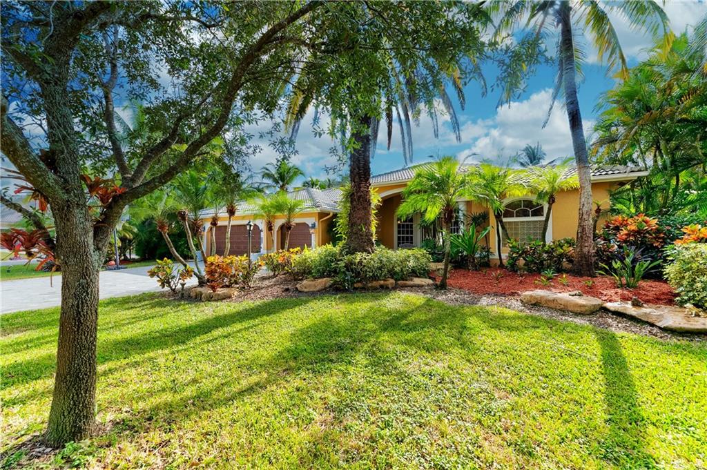WOW!! The best value in Parkland's quietest, estate neighborhood. Walk or bike to Broward Counties Top A+ rated Elementary, Middle, and High Schools. Less than a mile from Pine Trails Park where soccer, flag football, and basketball rec sports run continuously. This is Fox Ridge, with community tennis courts, children's playground, lakes for fishing, 24 hr manned guard gate, and the lowest of HOA fees. Our offering is a fabulous 5 bedroom plus an office, 3 full bath, triple split floor plan with 3 car garage on an over-sized corner lot that is tropically landscaped. Extra large covered patio with free formed pool and spa provides a wonderful outdoor entertainment area. As you enter under the towering vaulted ceilings and a world of natural light, you will find yourself at home.
