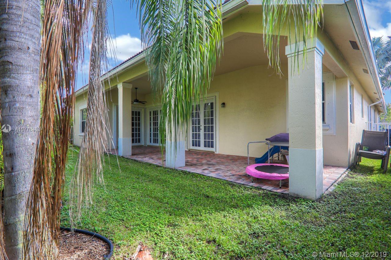 Popular Dove model tucked on a royal palm tree lined street, walking distance to the Hunters Pointe Community park. Great curb appeal with side entry garage and paver driveway. Enjoy soaring ceilings and neutral tones. Fully fenced yard with overhang and paver patio. Triple french doors lead to yard. Renovated baths with quartz countertops and decorator light fixtures and hardware. Stainless Steel appliances in spacious kitchen. new granite and under-mount sink. All wood floors in bedrooms. 4th bedroom (with closet) being used as a den.