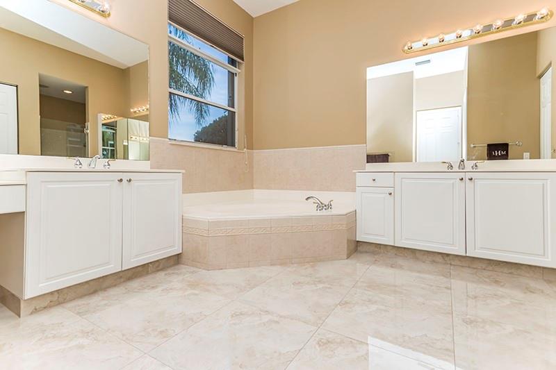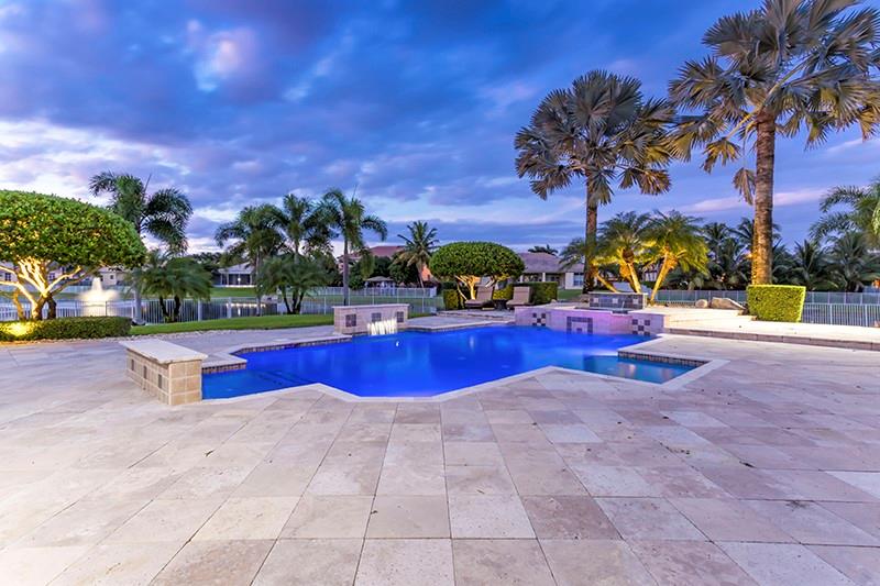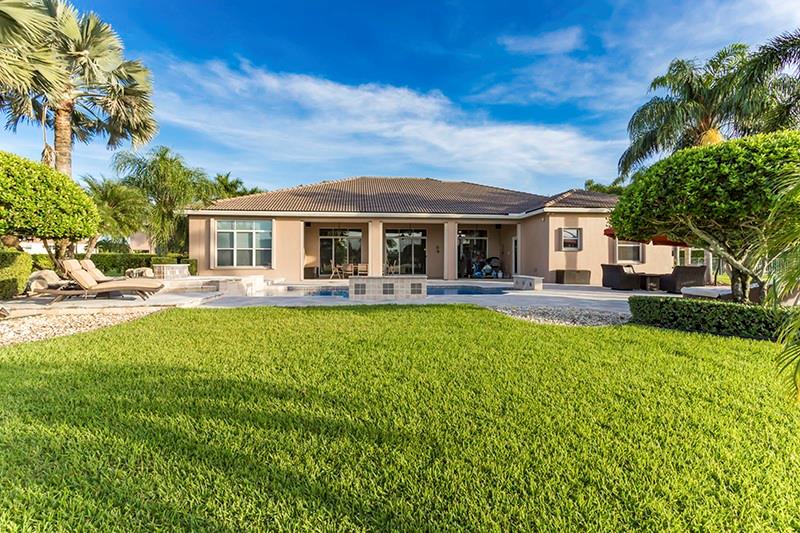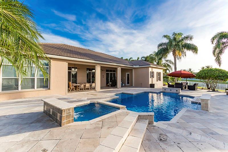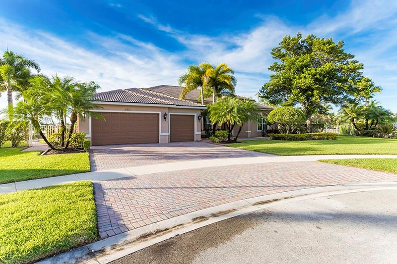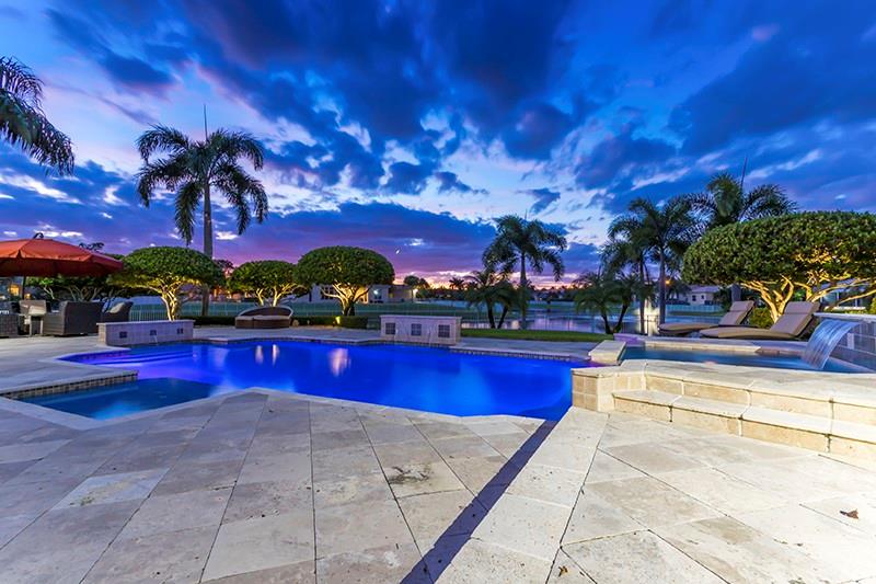 Gorgeous waterfront home on largest lot in the neighborhood at 1.2 acres on a quiet cul-de-sac. Impeccable landscaping creates a resort style feel around the expansive custom salt pool with waterfalls, & LED color lighting and marble pool deck. The home features a triple split layout. Those who love to cook will relish in the gourmet kitchen w/island, granite counter tops, custom granite table, and stainless steel appliances. Through out the home you will find crown moldings, indoor/outdoor surround sound, upgraded alarm system, accordion storm shutters. All new porcelain floors in common areas and master bedroom, secondary bedrooms and game room have engineered wood or laminate floors, and new baseboards throughout. 2 New ACs.