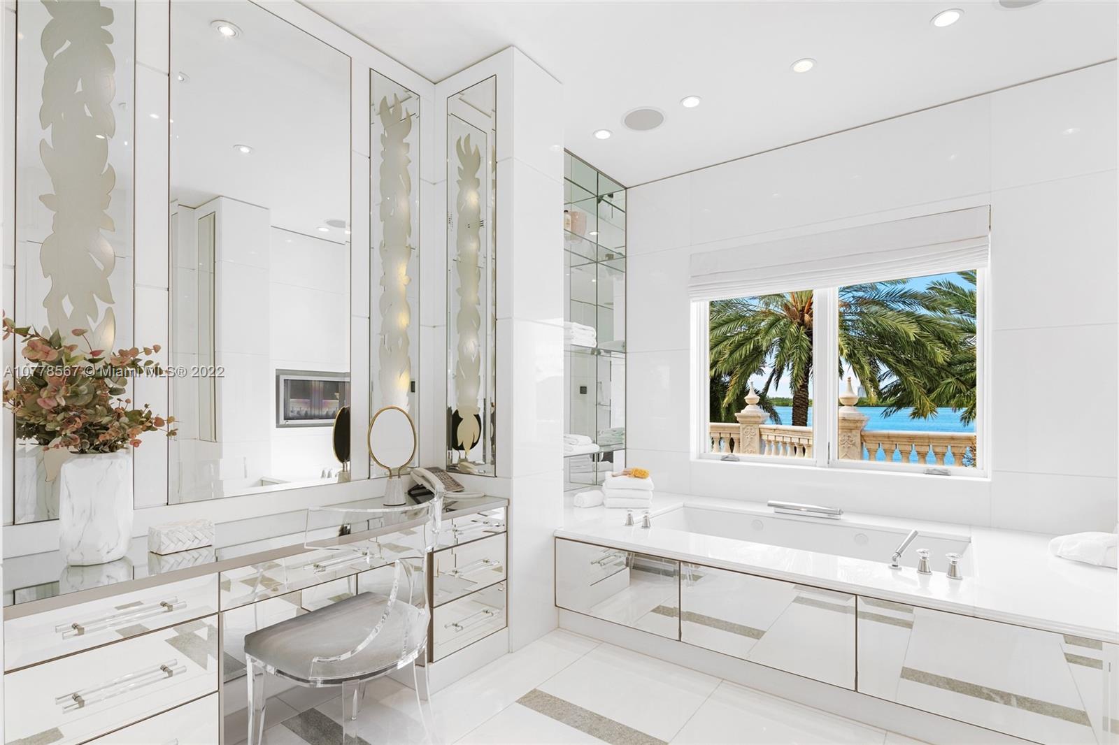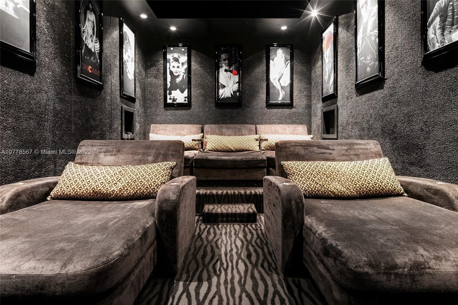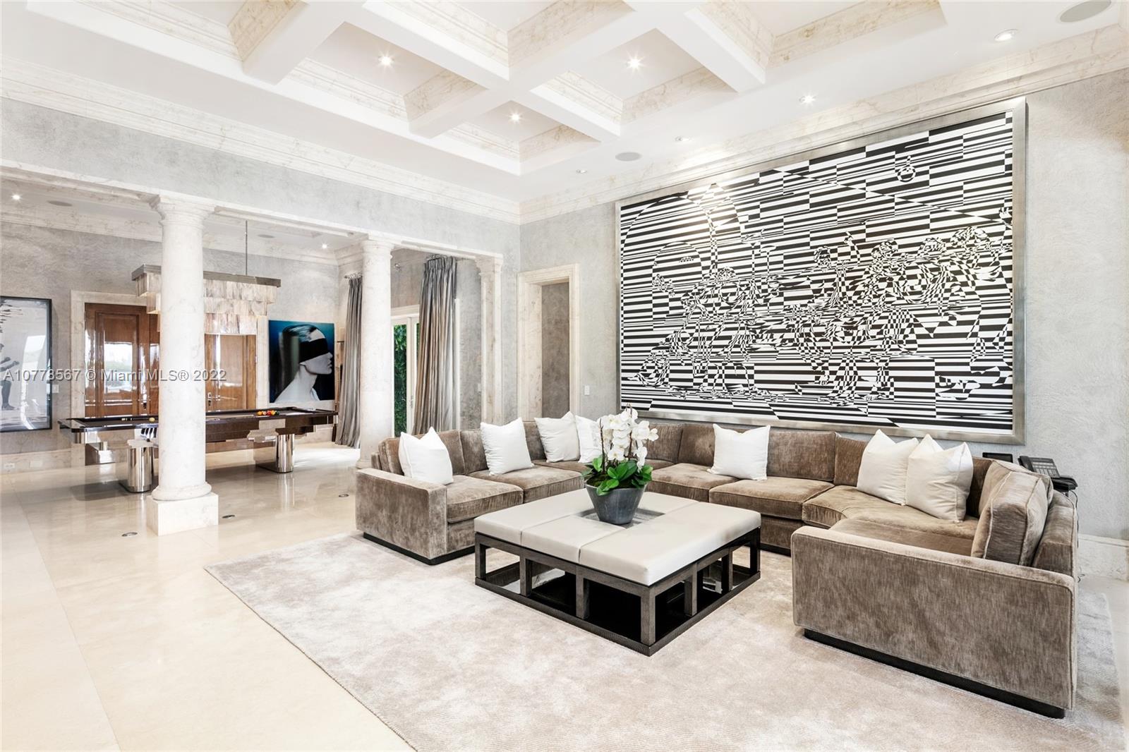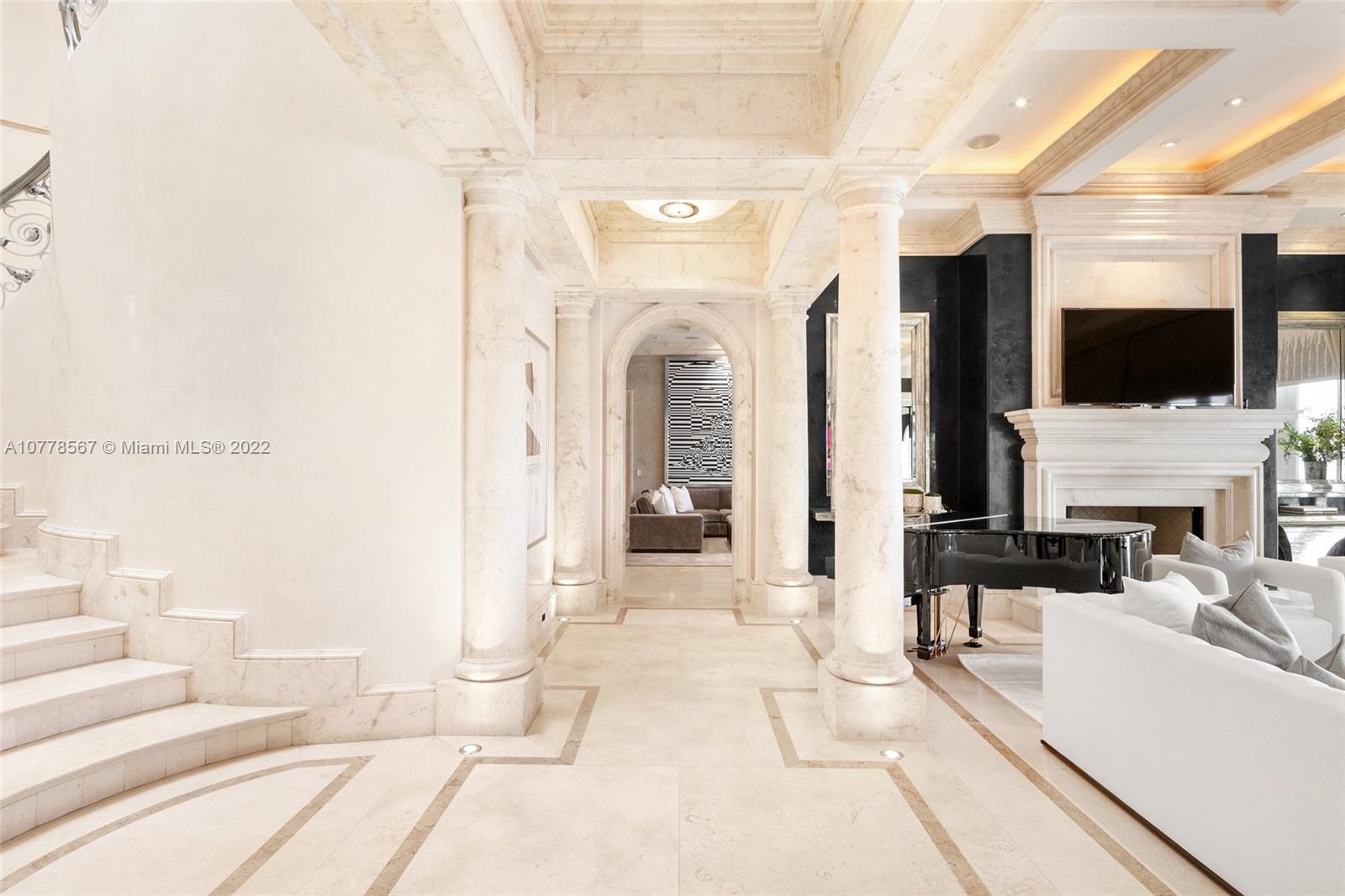 Absolutely unparalleled in finishes, appointments & furniture, this 12,879 SF palatial estate is designed like no other. Villa Magnolia sits upon 221 ft of wide waterfront with nw exposure, offering a front-row seat to dazzling sunsets. Private gates open to reveal a majestic Neoclassical home towering above verdant foliage. Enter into a rotunda foyer w/ a soaring 40-foot ceiling, curved marble & a striking two-sided staircase w/ white gold leaf bannisters. Unique features include hand-crafted stone throughout, European paint finishes, 15-foot coffered ceilings, 2-infinity edge pools, one just off the principal suite, 3rd level rooftop entertaining terrace, temperature-controlled 850-bottle wine room, gourmet kitchen w/ a built-in 750-gallon aquarium, movie theatre & glass elevator.