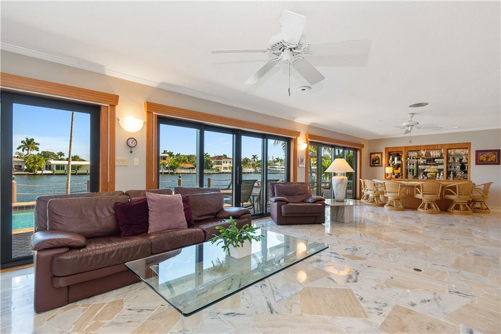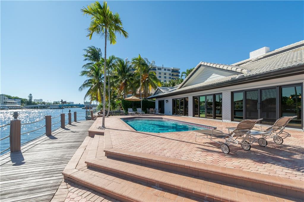 Stunning views from this beautiful 6 BR/4 BA home directly on the Intracoastal. 5,884 SF under air. 12,567 SF lot. 110' on the water. Watch the yachts pass by from a spacious patio with pool, BBQ area, newer dock & seawall. Dramatic 2 story entry foyer & adjacent dining room with 20' ceilings. Grand entertaining space includes large living & family rooms with wood-burning fireplace & custom bar. An open eat-in kitchen with Intracoastal views has granite counters, top-of-the line appliances, office area, center island & a huge butler's pantry. Master suite has 2 walk-in closets, double vanities, jetted tub & separate shower. Newer AC system, separate laundry room, hurricane impact windows and oversized 2CG make this a perfect family home in a great neighborhood!