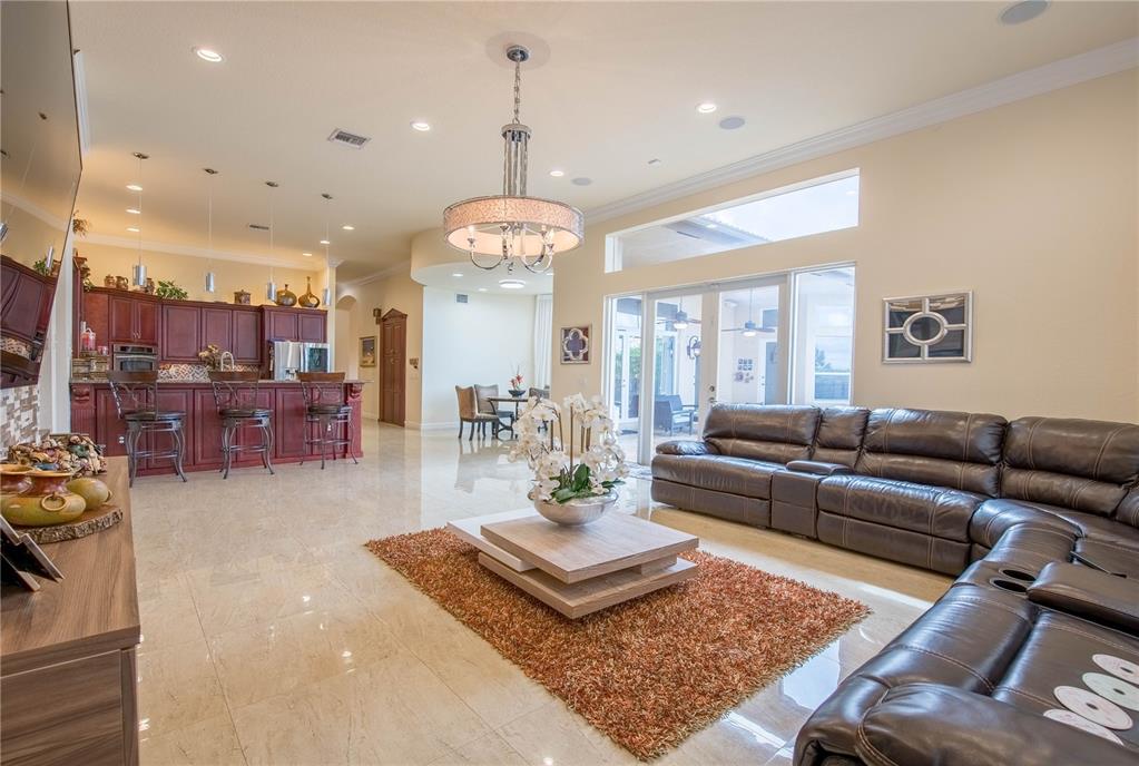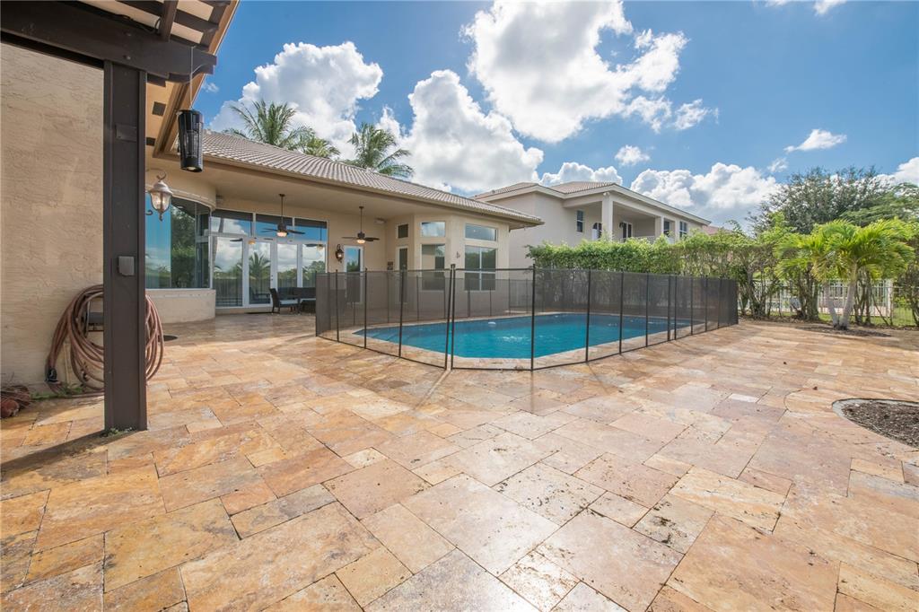 Spectacular one-story Marcellina Model. Upgraded kitchen with wood cabinets, center island, granite counter tops and S.S. appliances. Neutral porcelain floors in all the main areas and wood in the bedrooms, new shower doors in all the bathrooms, oversized master bedroom with sitting area or office, beautiful brick wall in the family room, and new A/C units. Enjoy every sunset with an amazing backyard, new travertine floors, new diamond brite pool, new pergola with clear covered roof, built-in outdoor kitchen, and exterior lighting.