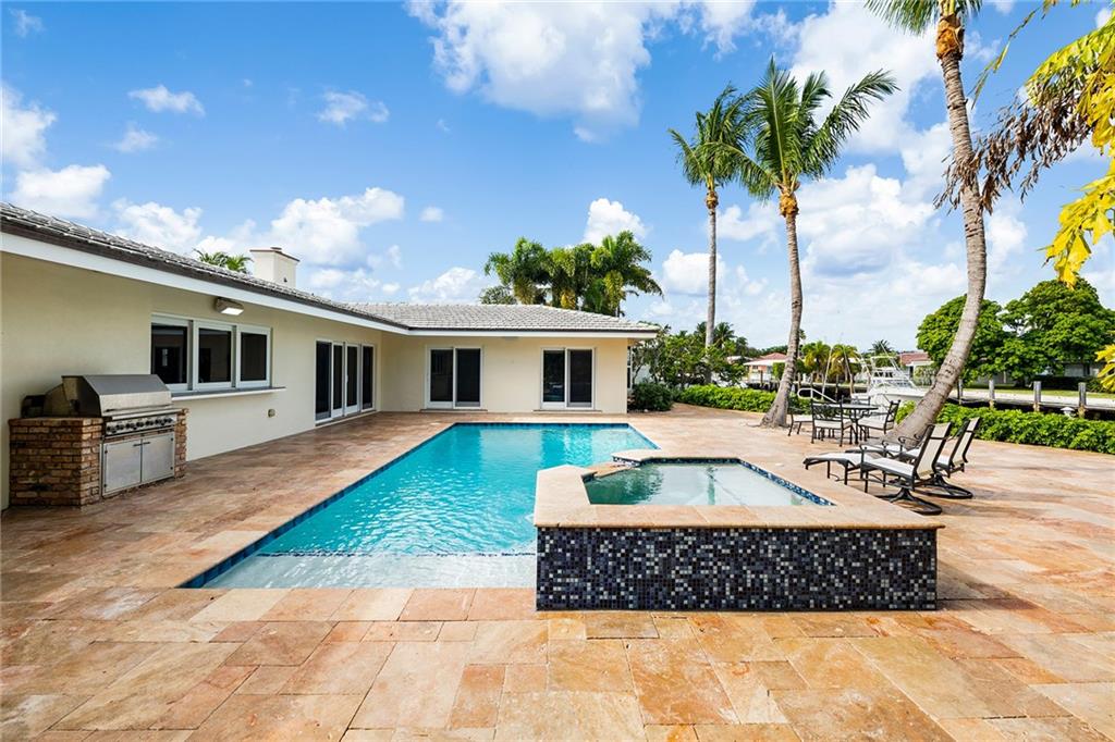 Transitional home in The Landings with deep water dockage suitable for up to a 43 ft. vessel. The single-level home surrounds a marble paver patio with refurbished pool and spill-over waterfall spa, taking full scenic advantage of 53 ft. of waterfront with views looking down the length of the Bayview Inlet. Open gourmet kitchen with gas cooking, Sub-Zero and Wolf appliances, stand-alone island, wine cooler, solid wood cabinets and granite counters. Four bedrooms, plus an office. Large master suite with walk-in closet and sliding door access to the patio / pool. The marble-finished en-suite bathroom has dual sinks, glass shower and Kohler soaking tub. Rebuilt in 2004 by the award winning Marker Construction Group, this home includes a myriad of amenities including impact windows and doors.