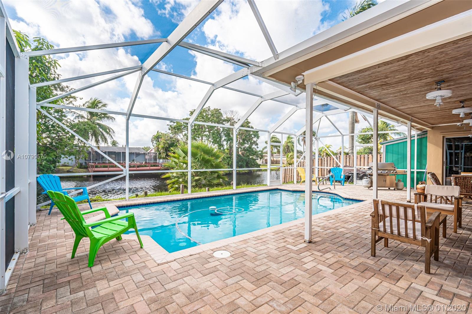 Lovely 3 Bedroom, 2 Bath Waterfront & Screened Pool Home conveniently located in West Sunrise Golf Village. This well maintained home features real wood flooring in common areas, newly updated master bath, generous living room and split bedrooms. Kitchen has plenty of cabinets and granite counter top. Home also has a large pool deck with covered patio for entertaining and waterfront access to the local canal system. Also features paver stone driveway and pool deck, fenced yard, and 1 car garage. Please note Natural Gas Appliances including Range, Dryer, and Hot Water Heater. And No HOA! Easy access to employment, shopping, and highways from this central location.