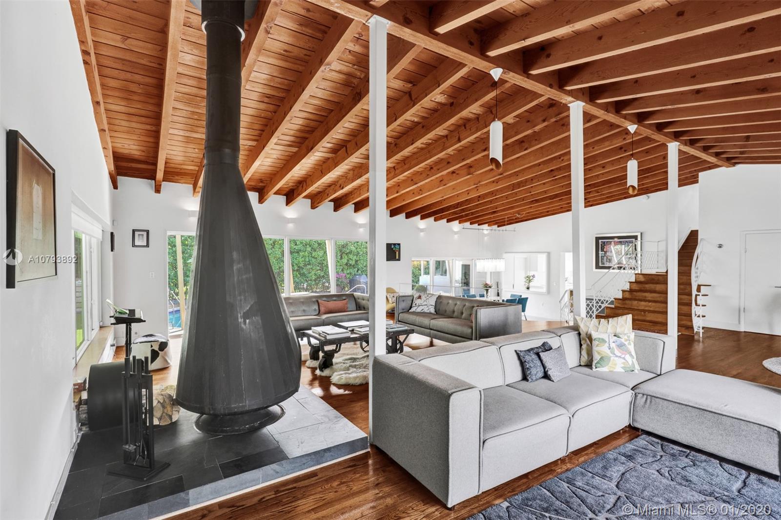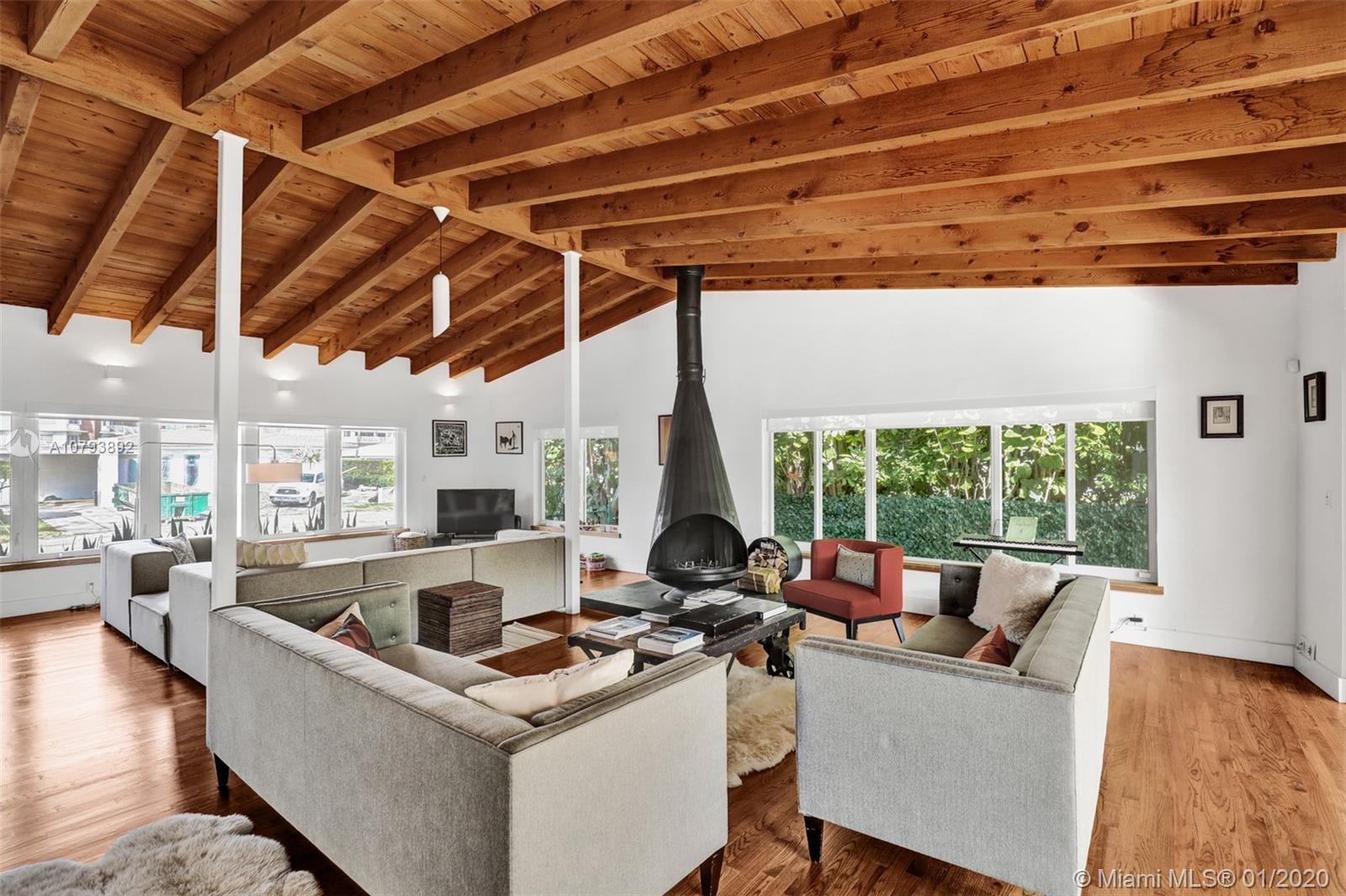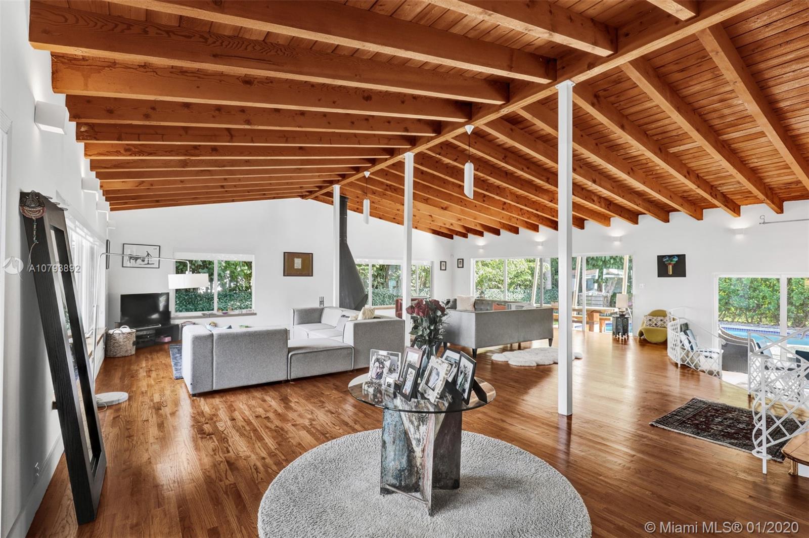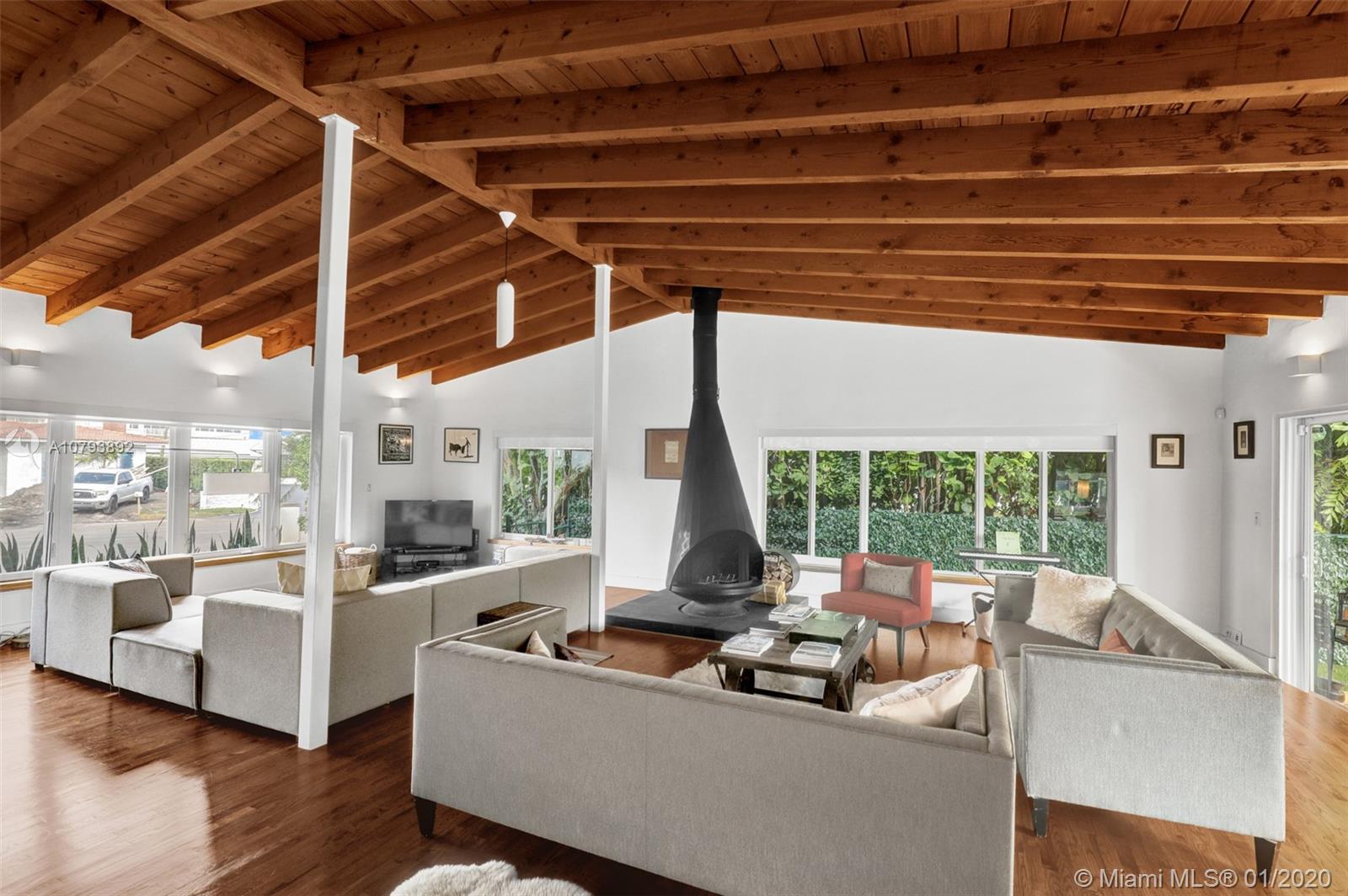 This one of a kind architectural gem is located in east Miami Shores only one house from the bay. Designed by mid century architect Robert Nordin, it boasts an impressive exposed Pine wood ceiling over a spacious living area overlooking the inviting backyard and pool. The traditional use of wood blends beautifully with modern finishes. A 1950's original working fire place adds to the mid century authenticity. Fully renovated in 2016 it has new impact windows/doors, new plumbing/electric, new roof, custom lighting, Bandalux window treatments, a high end kitchen w/custom cabinetry, Bosch appls. plus laundry room. The sumptuous master bedroom offers his/hers baths and a custom walk-in closet. A covered 2 car garage and plenty of storage space abound. This home is a must see and a great value!