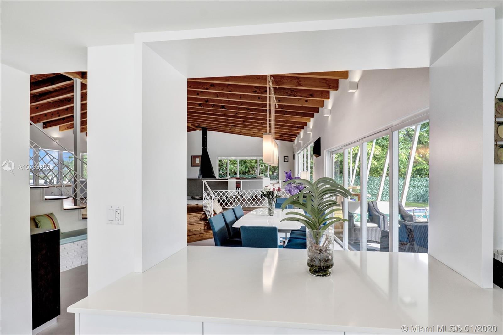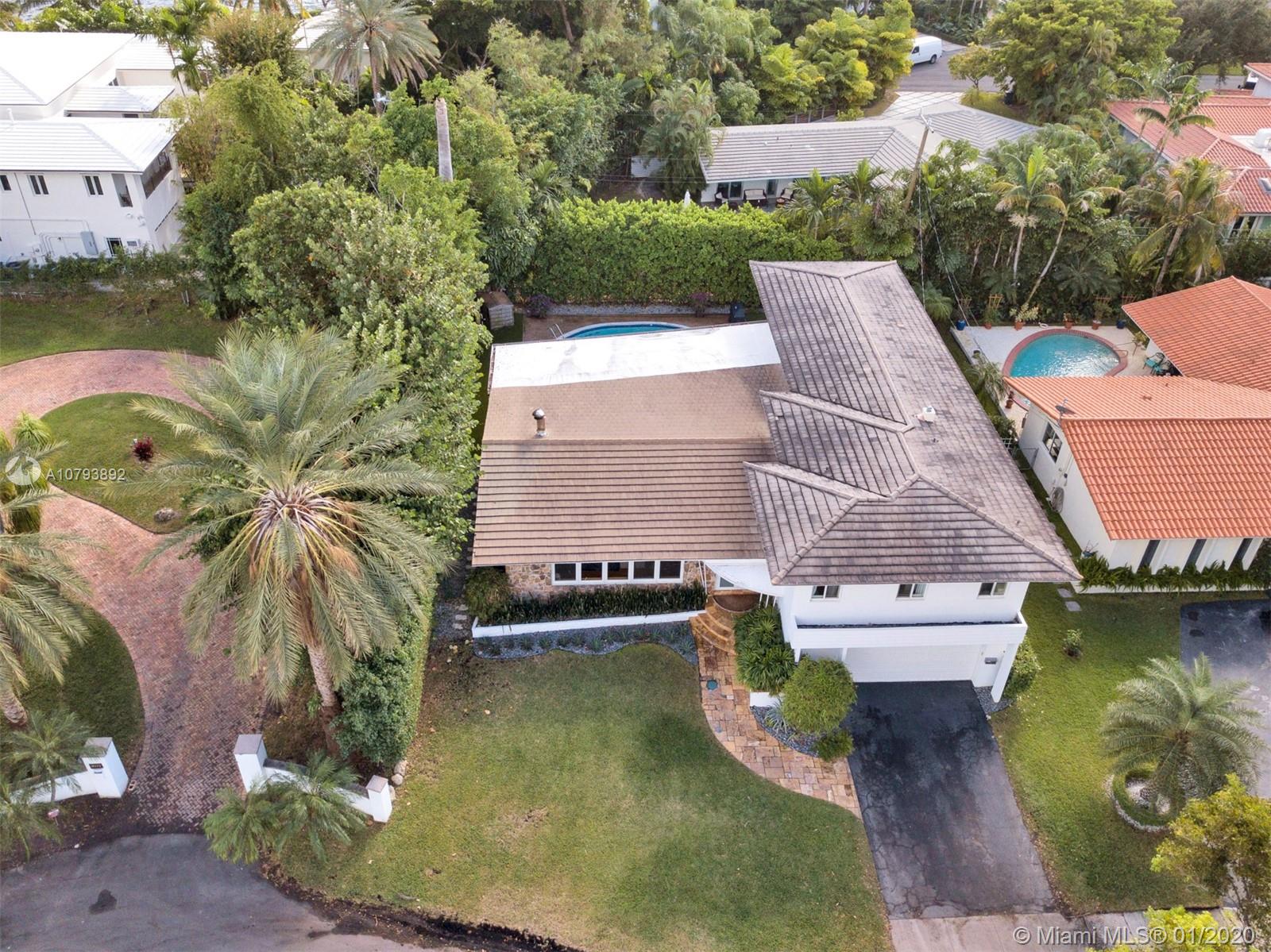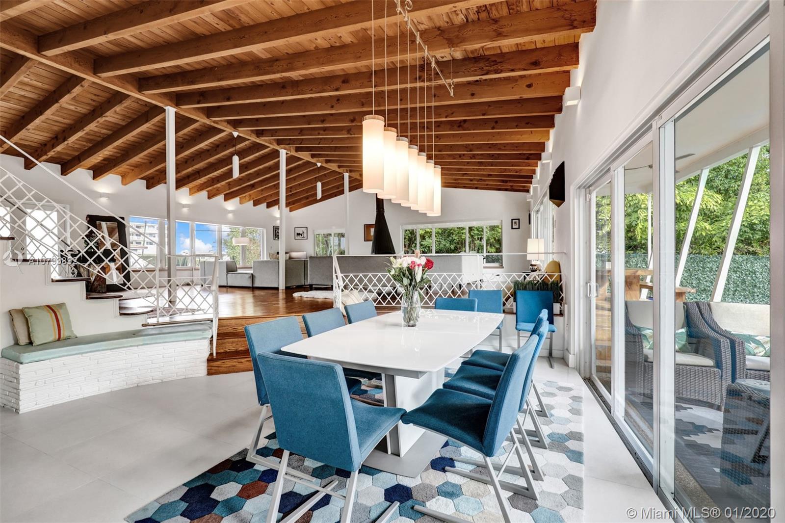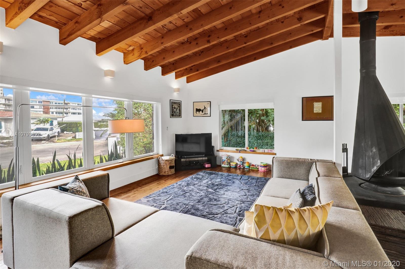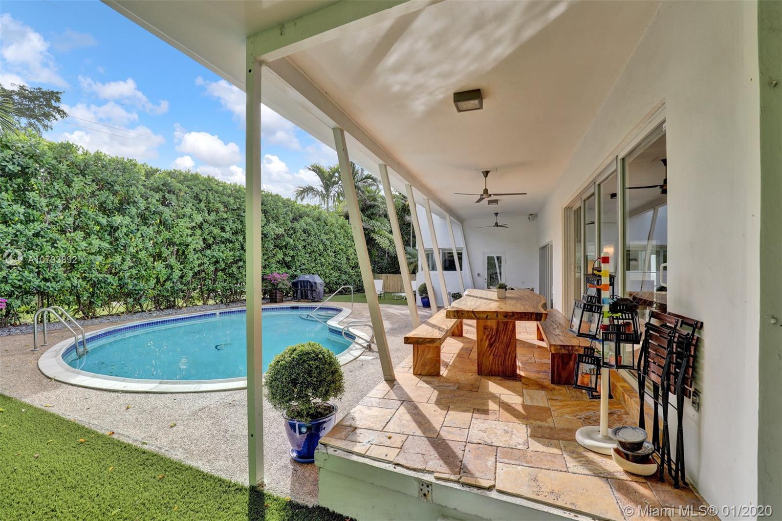 This one of a kind architectural gem is located in east Miami Shores only one house from the bay. Designed by mid century architect Robert Nordin, it boasts an impressive exposed Pine wood ceiling over a spacious living area overlooking the inviting backyard and pool. The traditional use of wood blends beautifully with modern finishes. A 1950's original working fire place adds to the mid century authenticity. Fully renovated in 2016 it has new impact windows/doors, new plumbing/electric, new roof, custom lighting, Bandalux window treatments, a high end kitchen w/custom cabinetry, Bosch appls. plus laundry room. The sumptuous master bedroom offers his/hers baths and a custom walk-in closet. A covered 2 car garage and plenty of storage space abound. This home is a must see and a great value!