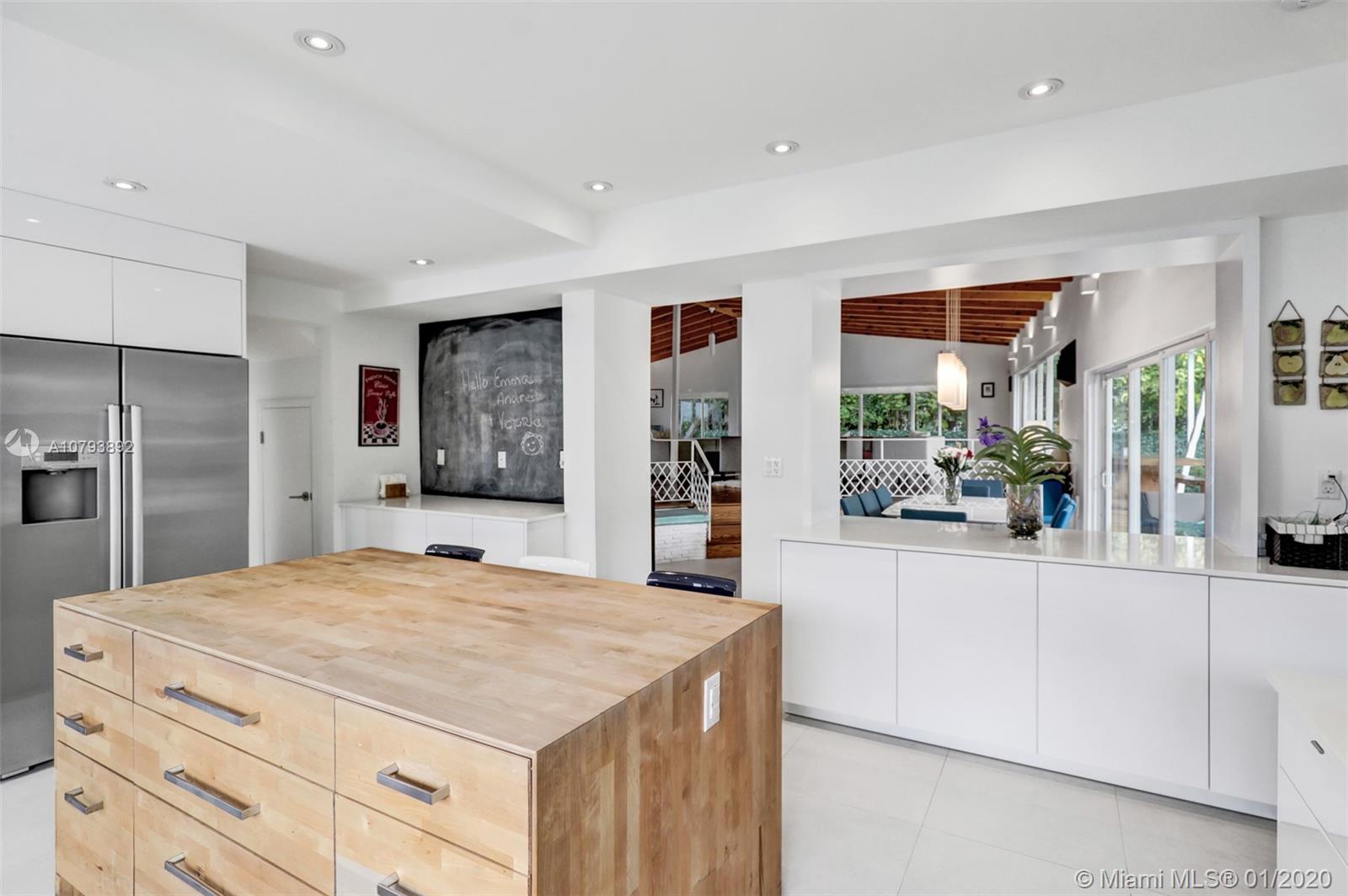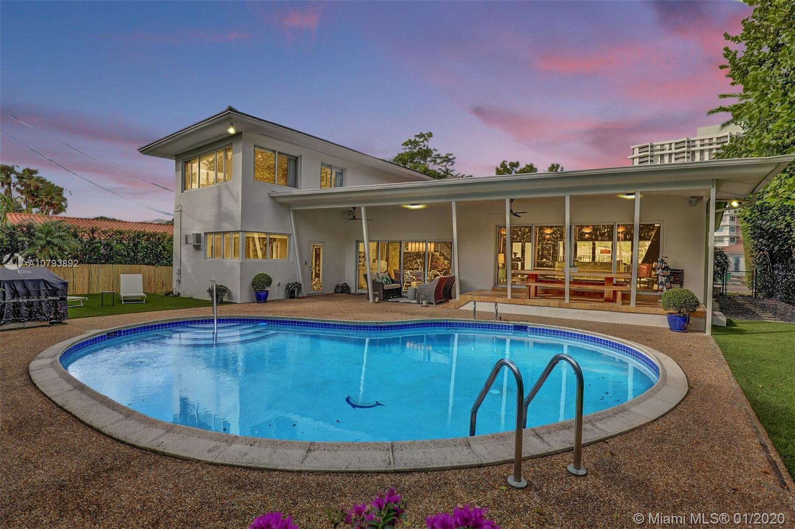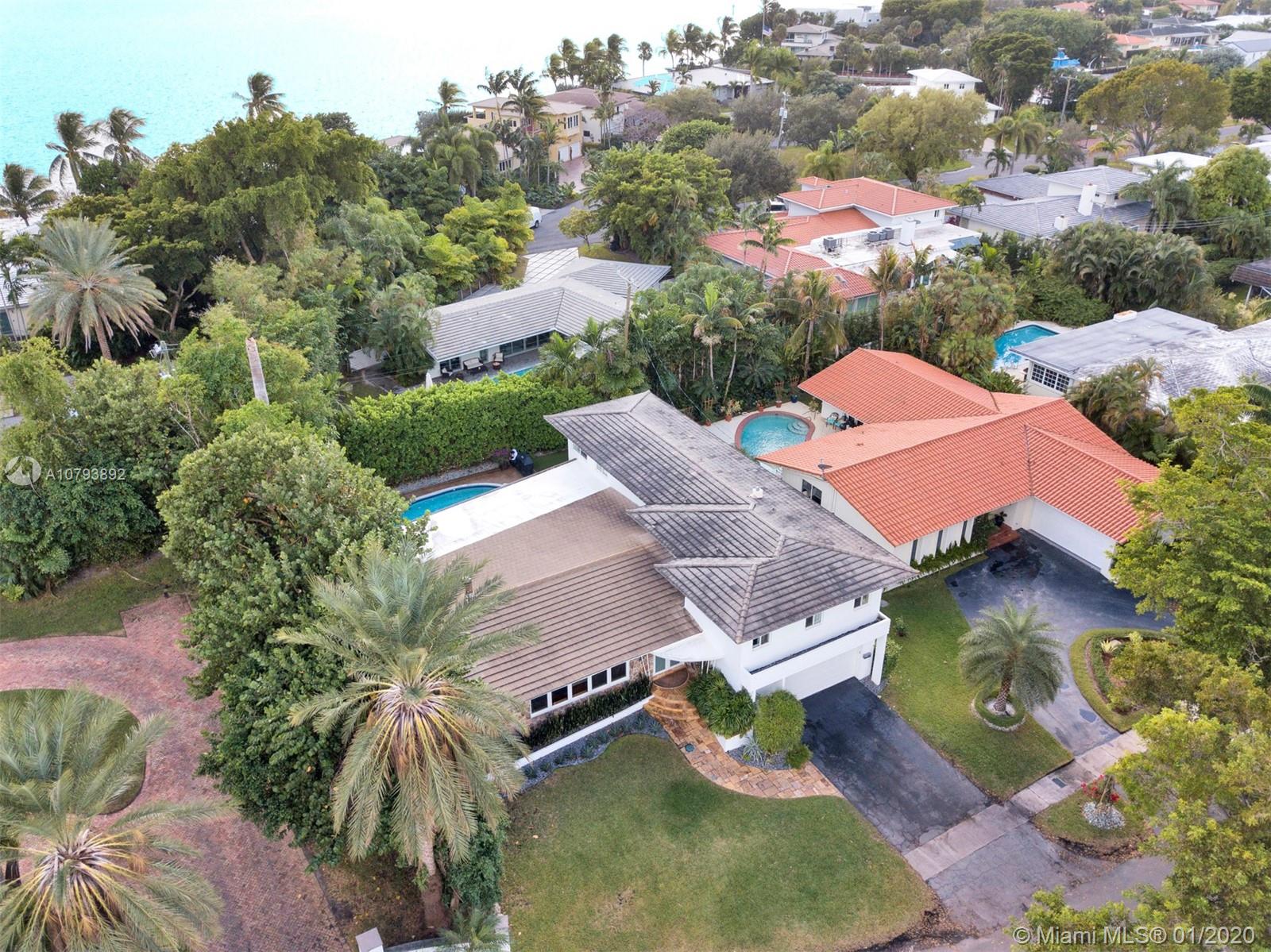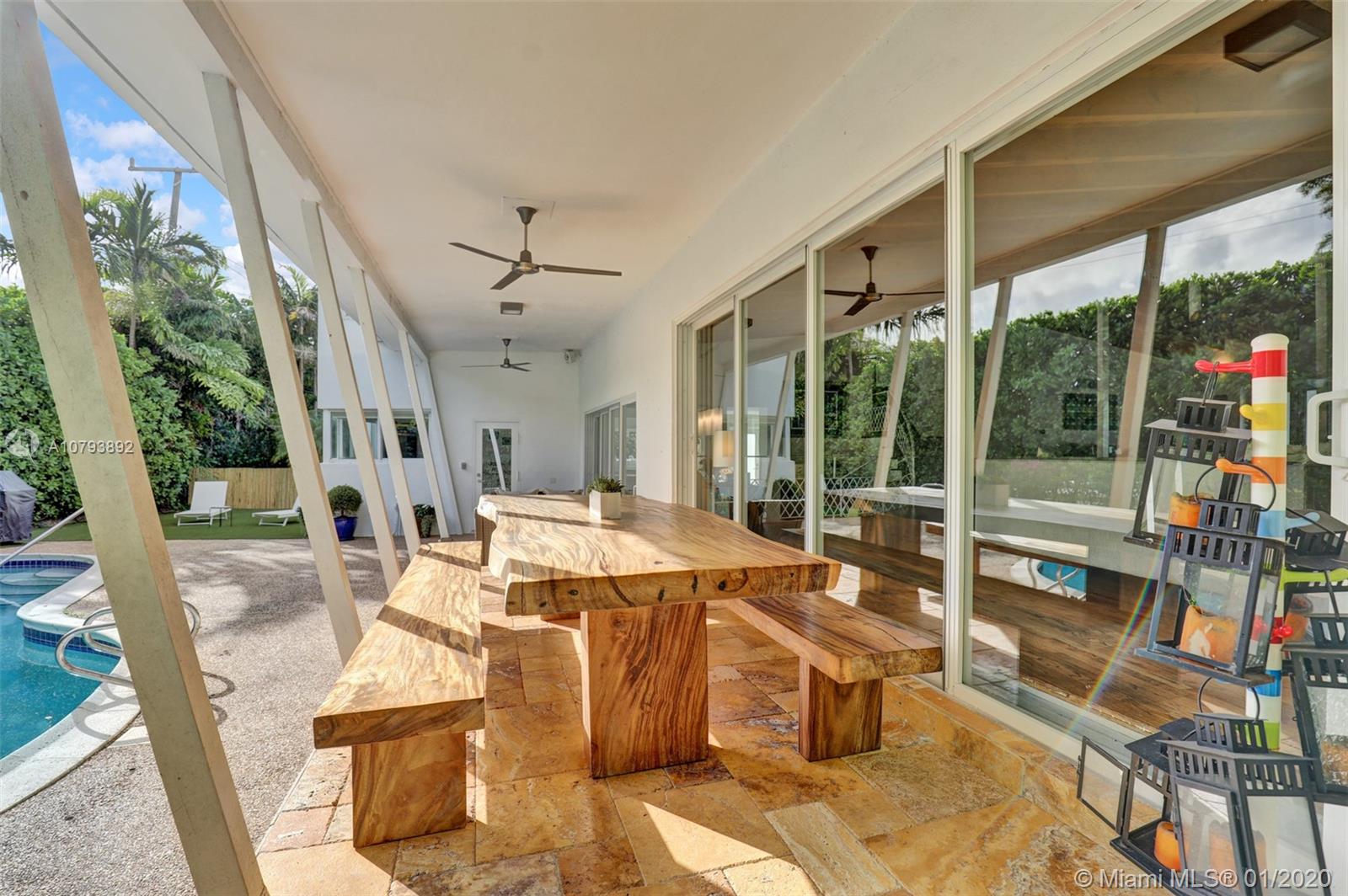 This one of a kind architectural gem is located in east Miami Shores only one house from the bay. Designed by mid century architect Robert Nordin, it boasts an impressive exposed Pine wood ceiling over a spacious living area overlooking the inviting backyard and pool. The traditional use of wood blends beautifully with modern finishes. A 1950's original working fire place adds to the mid century authenticity. Fully renovated in 2016 it has new impact windows/doors, new plumbing/electric, new roof, custom lighting, Bandalux window treatments, a high end kitchen w/custom cabinetry, Bosch appls. plus laundry room. The sumptuous master bedroom offers his/hers baths and a custom walk-in closet. A covered 2 car garage and plenty of storage space abound. This home is a must see and a great value!