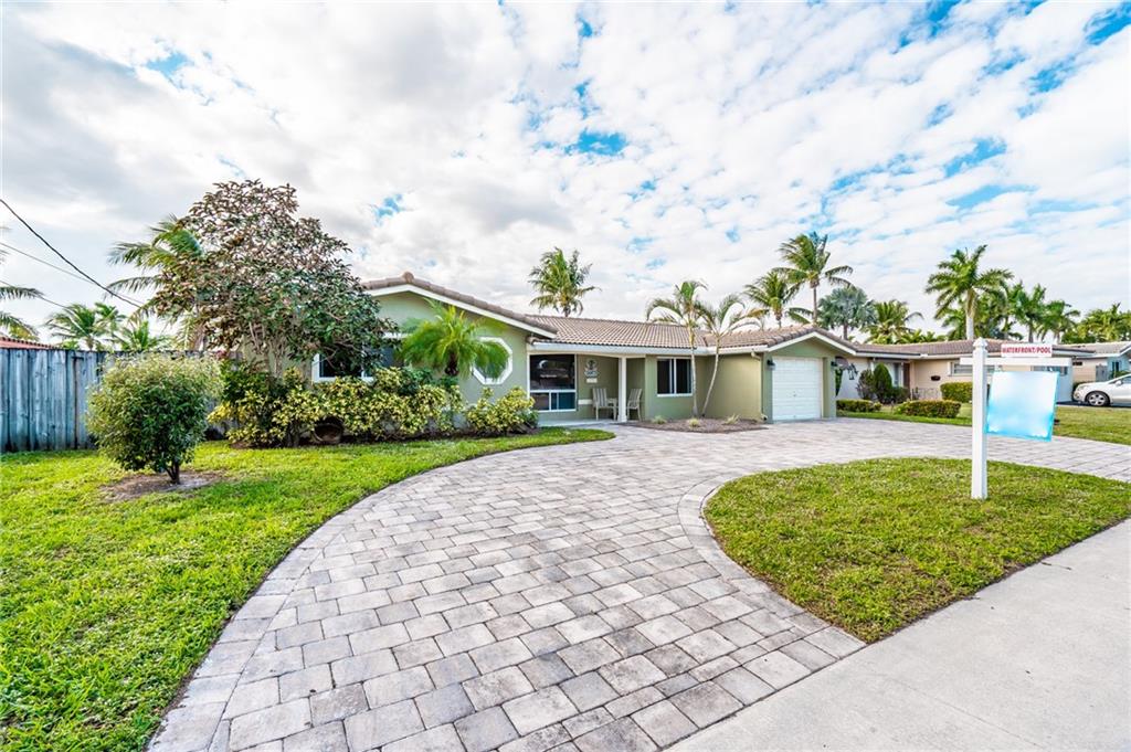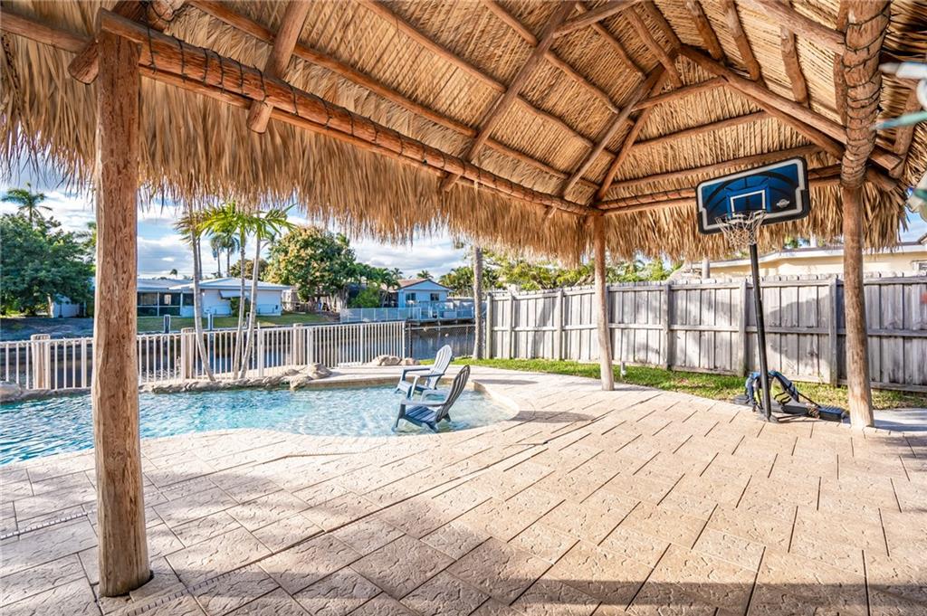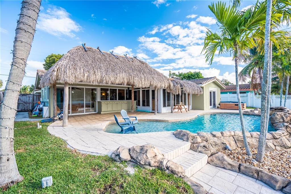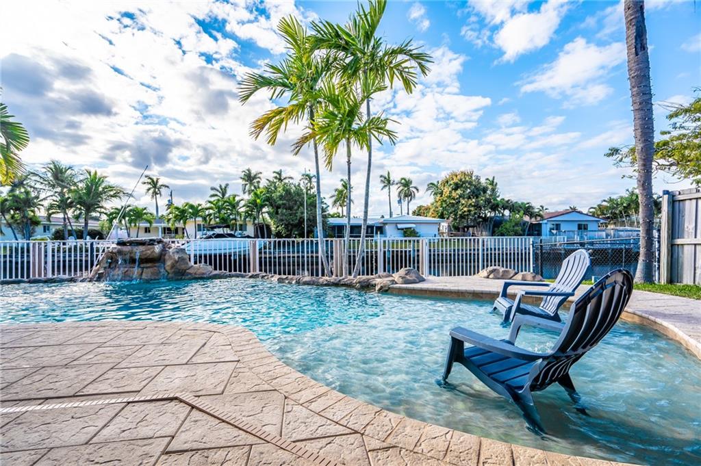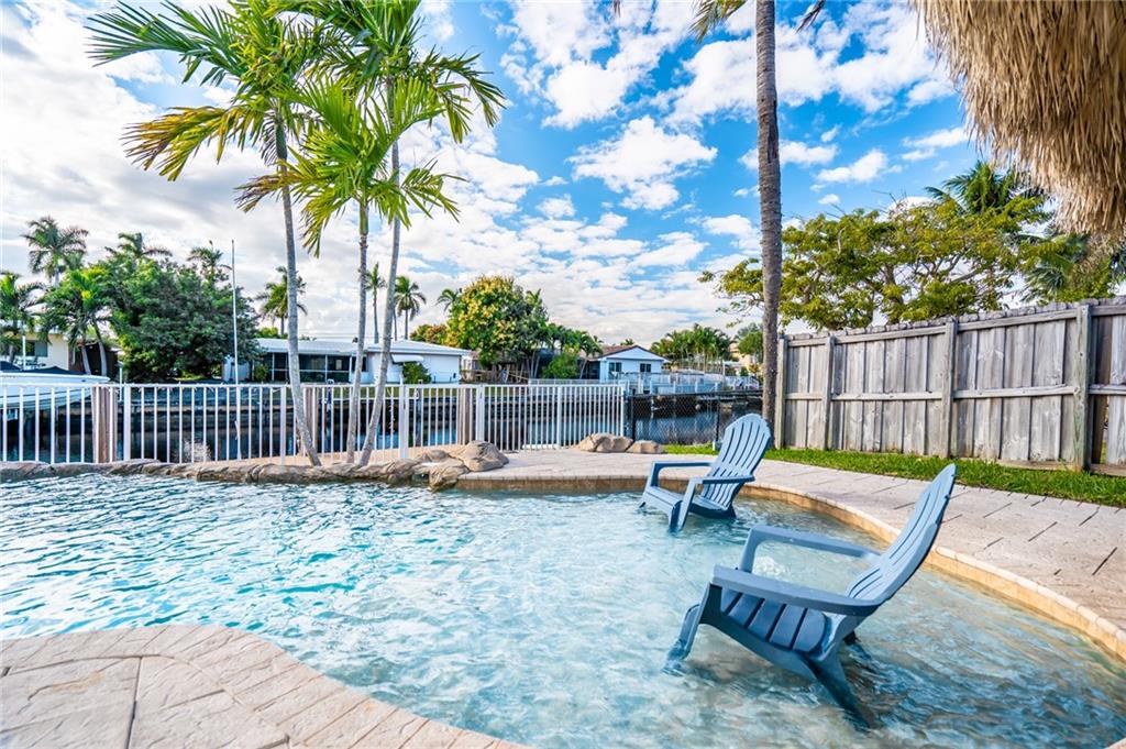 Exquisite 3/2 Convertible Waterfront Pool Home in Coral Ridge Isles. This home has ocean access and a pool featuring waterfall with baja shelf! The kitchen is modern with granite counters, tile backsplash & stainless appliances. Plus, its over-looking the lovely pool and waterfront! Spacious Florida room with custom built-in wet bar which opens up to outdoor tiki hut for resort lifestyle atmosphere. Master bedroom with walk-in closet & en-suite bath opens to patio & hot tub. Both bathrooms are beautifully updated. Impact windows and doors throughout & S-Tile roof. Home has a 45 foot dock and new indestructible batter piling seawall. Fenced with private yard and tropical entertaining area. A+ location close to beach, I-95, best schools & shops. Don't miss it! Call now this one won't last!!!