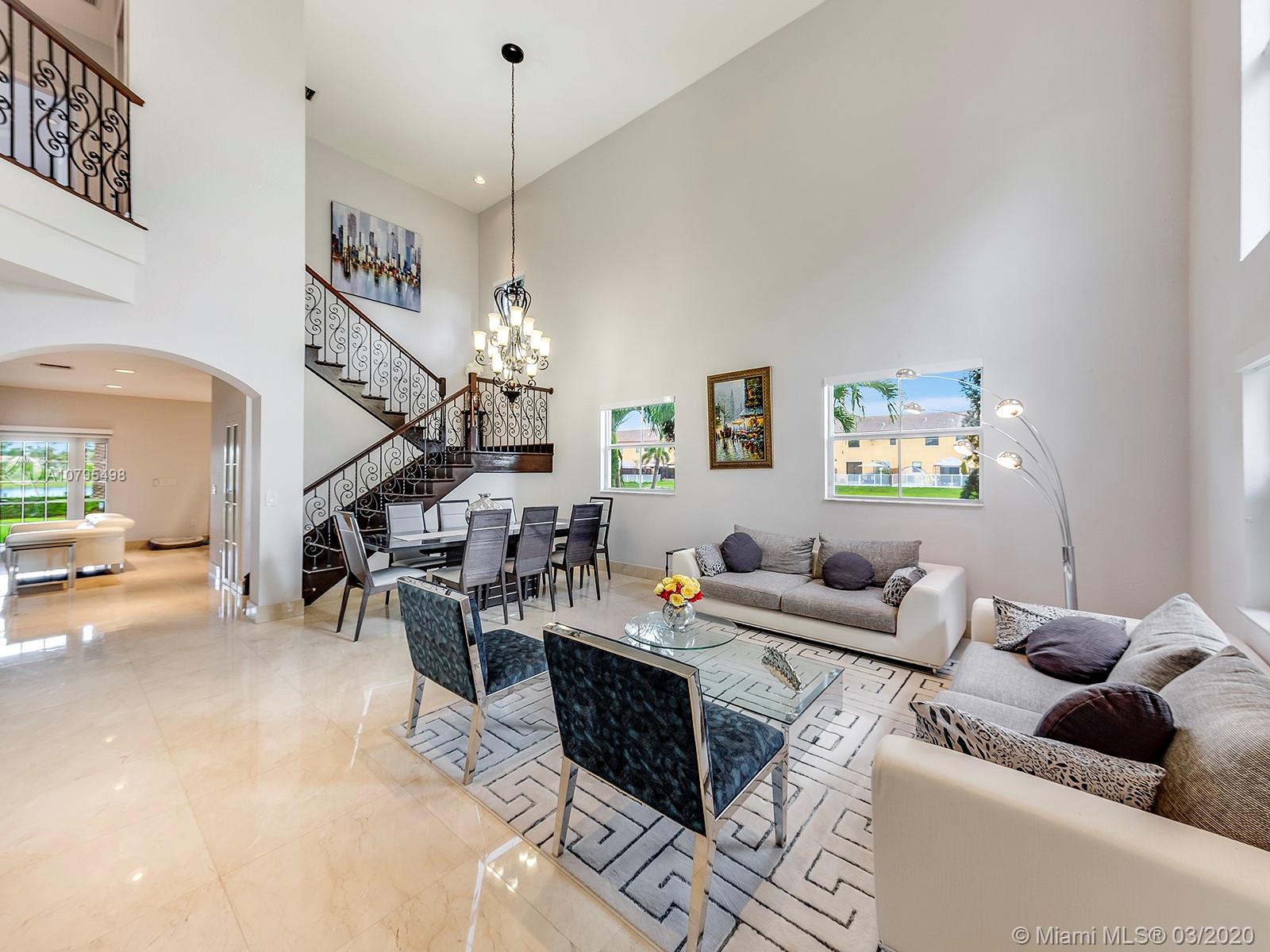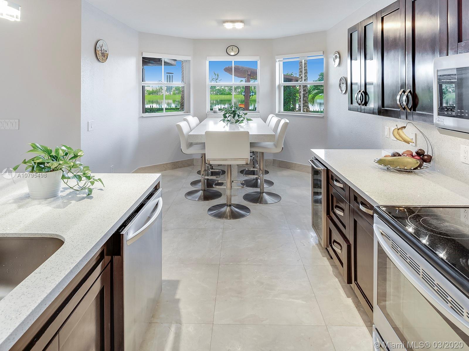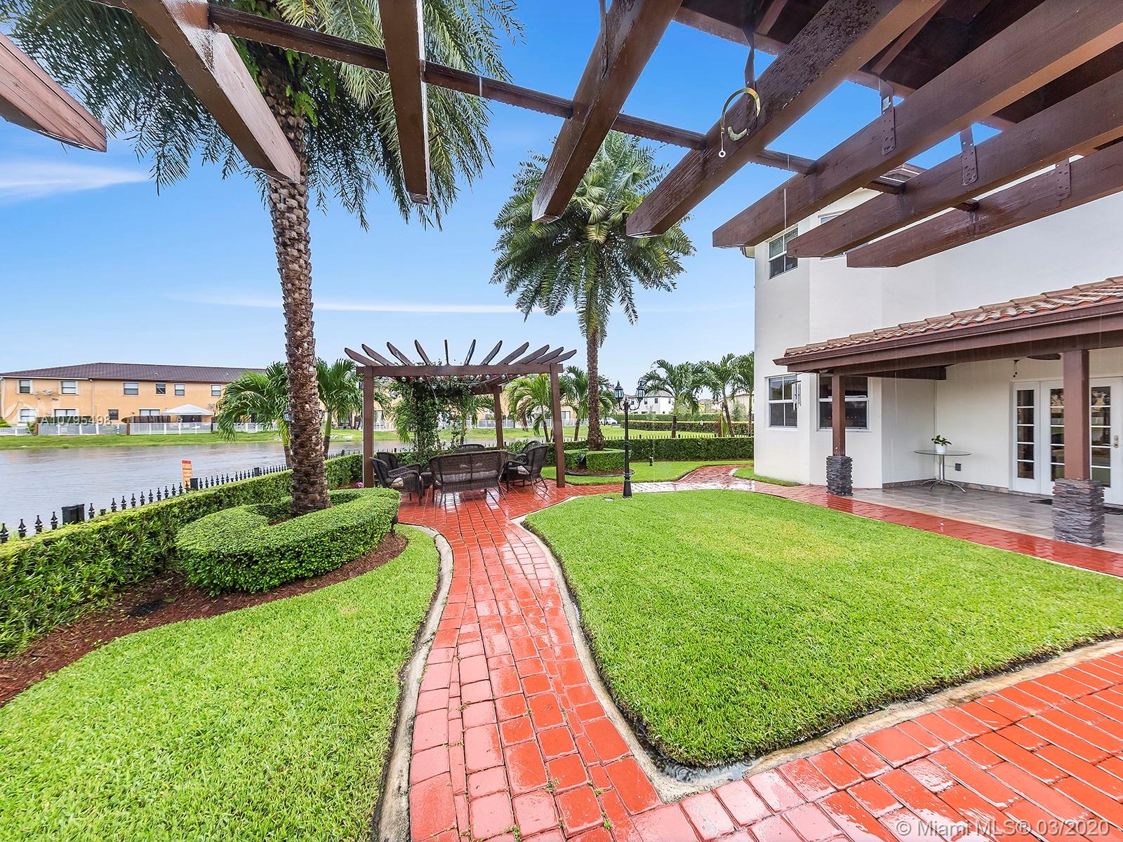 Exquisitely Landscaped corner Lakefront Luxury home at the exclusive Islands at Doral. This waterfront 4BD/3BA home features spectacular soaring ceilings with marble flooring throughout living areas and cherry wood floors in all bedrooms. Top of the line stainless steel appliances, quartz countertop and stunning built in quartz dinner table bring unparalleled elegance to this open kitchen layout. Master bedroom features tray ceilings and luxurious custom-built closet. A spacious two car garage and laundry room with custom additional storage. Enjoy the serenity of the lake with custom summer kitchen, gazebo and covered patio! 3D Tour: https://bit.ly/8646NW115Matt