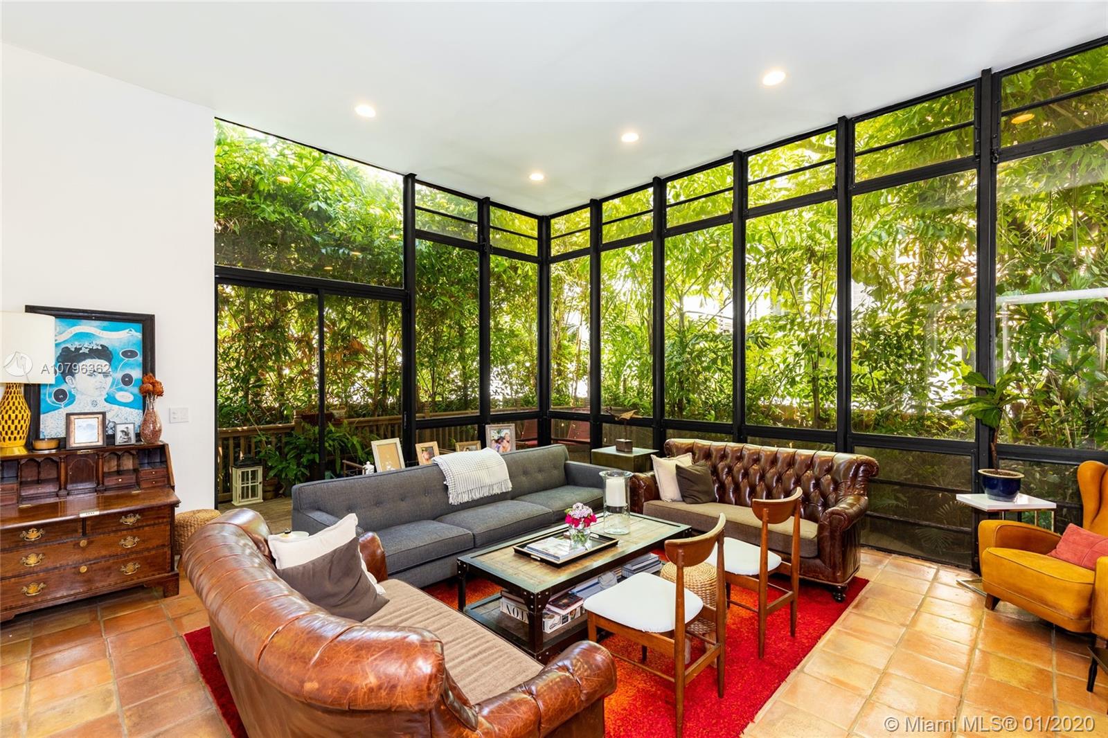 Architecturally unique tri-level corner townhouse featuring floor to ceiling walls of glass that bring the outdoors inside. Recently renovated featuring open dining & kitchen, modern master bath w/ large shower, recessed lighting, large walk-in closets, renovated second master shower/bath combo w/ white subway tiles & slate floor. This awe-inspiring home has Two en-suite oversized bdrms w/ 3rd bd/office, 2 cg, & large pool w/ gated access. Ample outdoor space w/ large balcony, large yard w/ gardens & beautiful Fishtail Palms offer a private tropical setting. Full Building Renovation including exterior updates & new paint, & updated pool area w/ outdoor furniture & decking. Only 5 Total Residences, A+ school district, very family friendly & safe neighborhood. Walk to Bal Harbour Shops.