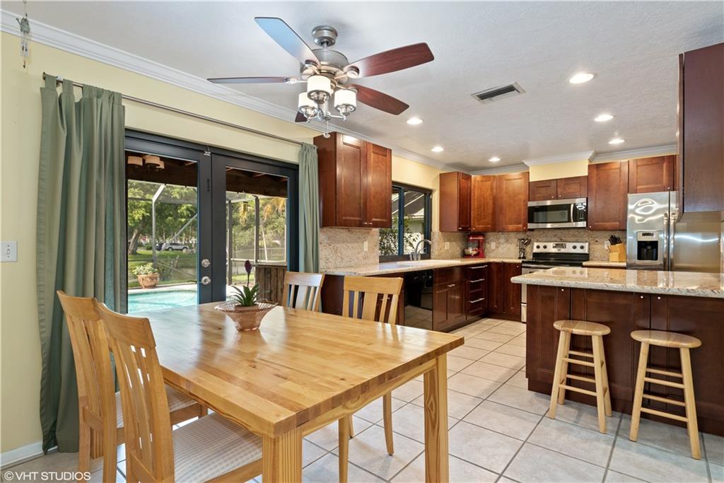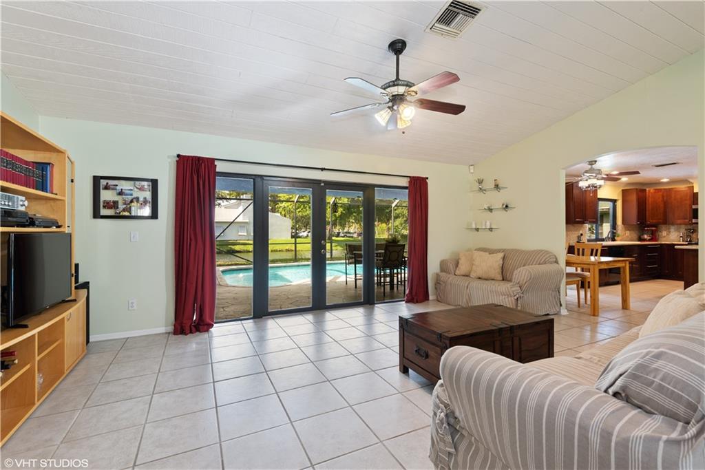 Beautiful and spacious pool home with an impressive floor plan. Large "great" room with vaulted ceilings. Beautiful formal dining room. The gourmet kitchen is a chef's delight with granite counter tops, rich cabinetry, a separate island and an eat-in area. Make memories! The kitchen and living room overlook the sparkling pool and part of the lake. Relaxing! Covered patio complete with wet bar. Great for entertaining. Sparkling, heated pool and a lovely view with no direct neighbors behind! The master suite has plenty of room. Previous seller has combined bedrooms 3 and 4 but can easily be converted back if buyer needs a 4th bedroom. Both bathrooms recently remodeled. Gorgeous flooring throughout. Impact windows! A/C approx. 3 years old. Interior laundry room. Ample closet space. No HOA.
