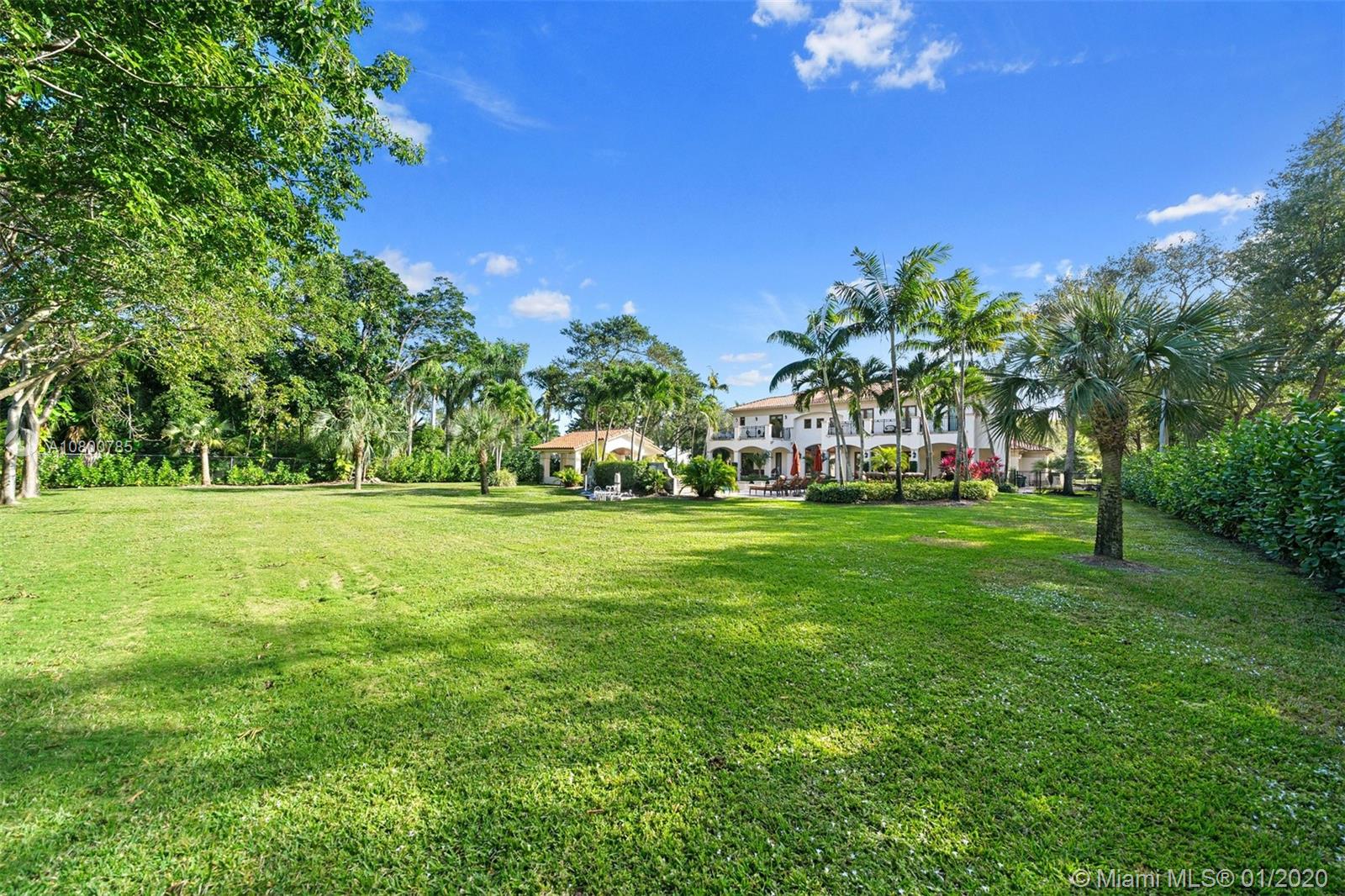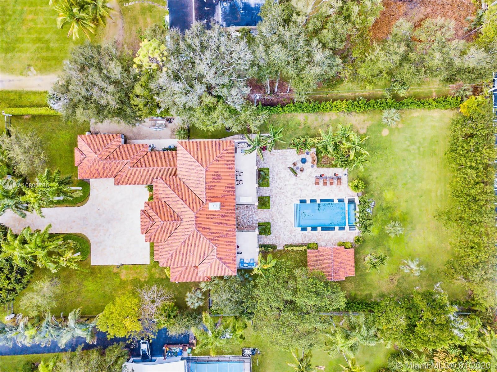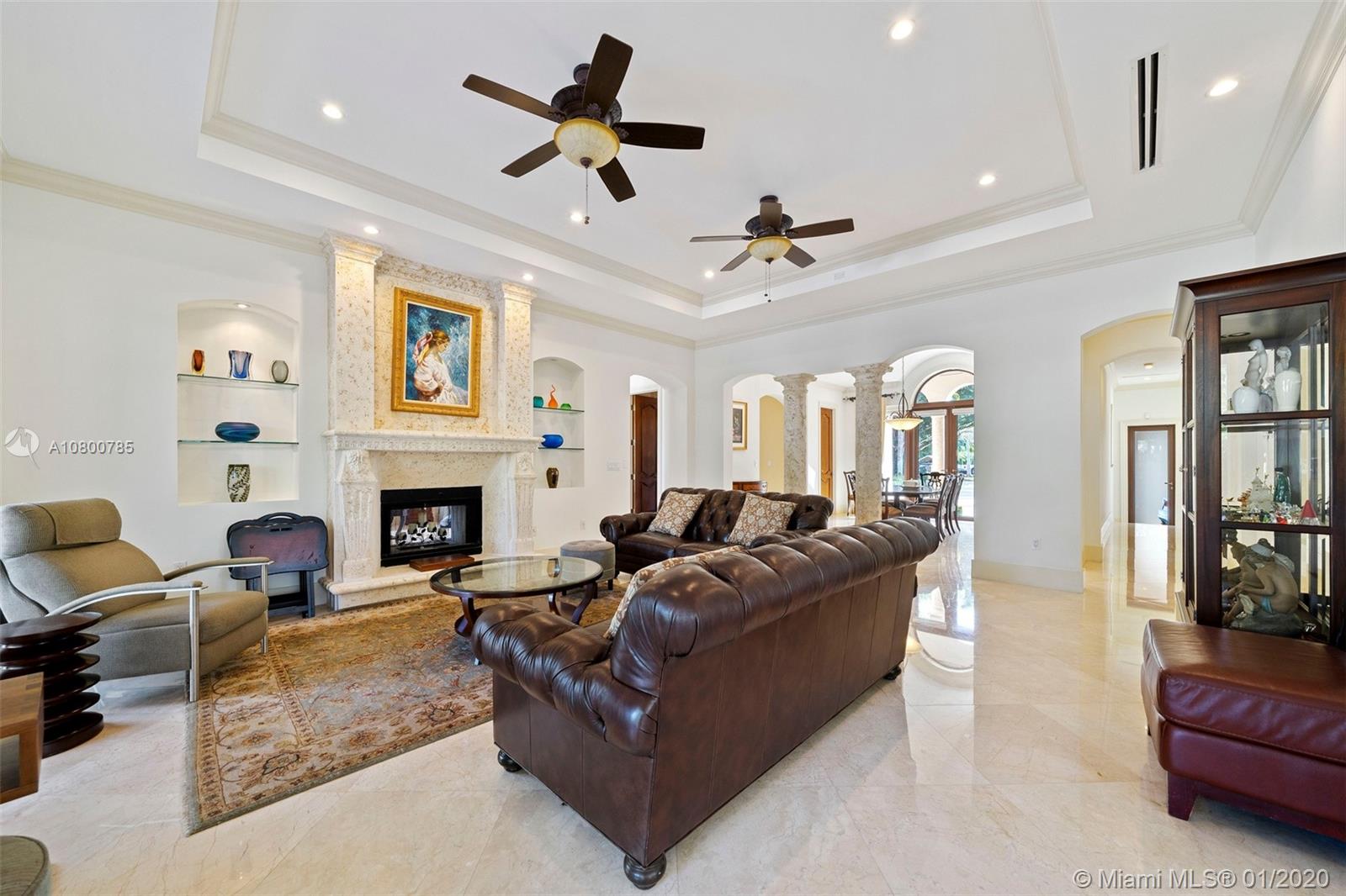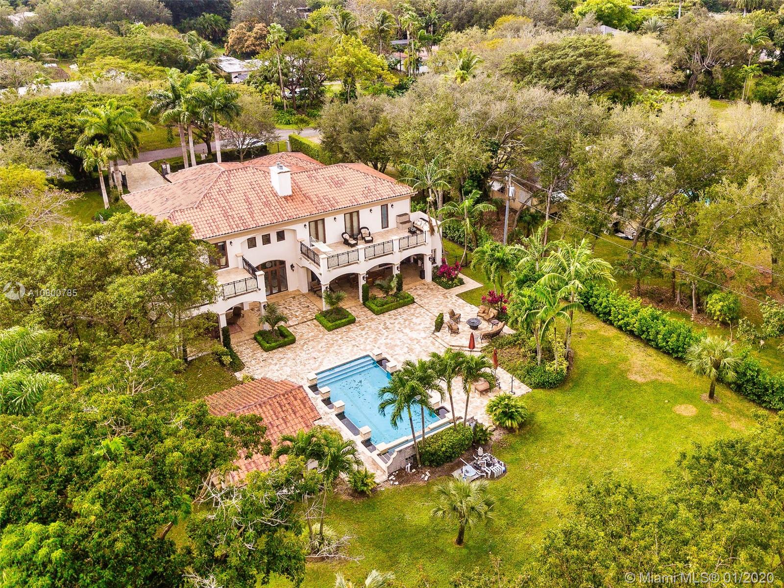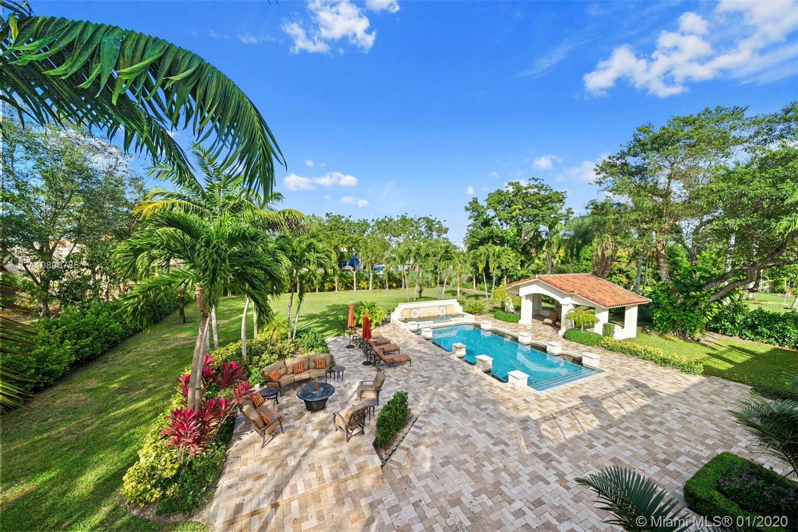 Impeccable 7 bdrm/ 6.5 bath gated residence on deep acre lot in Pinecrest. Grand foyer w/ impressive double entry doors, volume ceilings & marble staircase. Formal living & dining. Spacious family rm w/ keystone fireplace. Gourmet kitchen w/ large island, gas stove, breakfast nook. Downstairs you will find 3 guest bedrooms, the perfect guest quarters. Upstairs you will find the lavish master suite, complete w/ sitting rm w/fireplace, spa-like bath w/ steam shower and balcony, plus 3 additional guest bdrms. Marble flooring. Serene grounds include pool w/ water feature, expansive patios, summer kitchen, sprawling lawn beyond. Stone paver driveway. Room to discreetly park a boat. 2-car garage + 1-car carport, perfect for the car enthusiast.