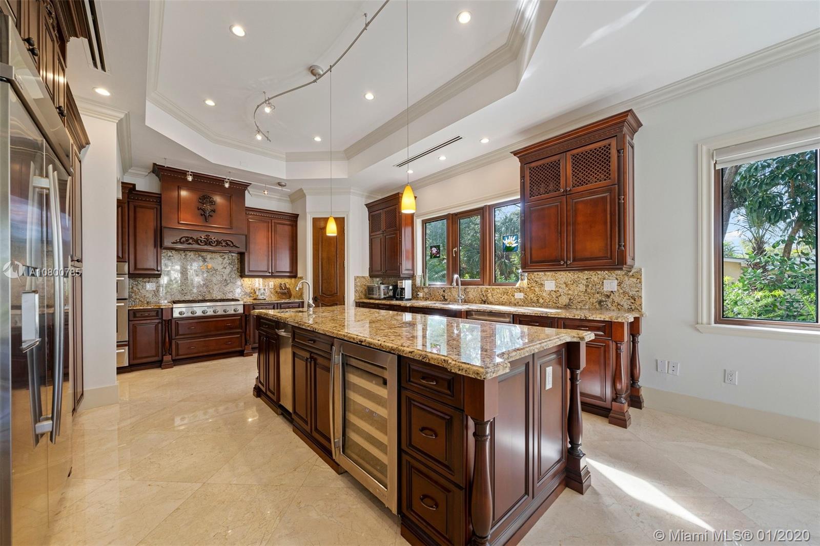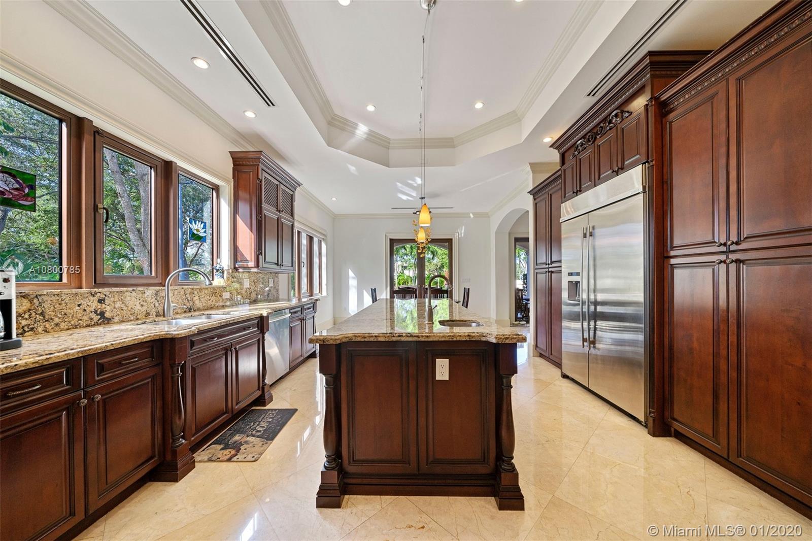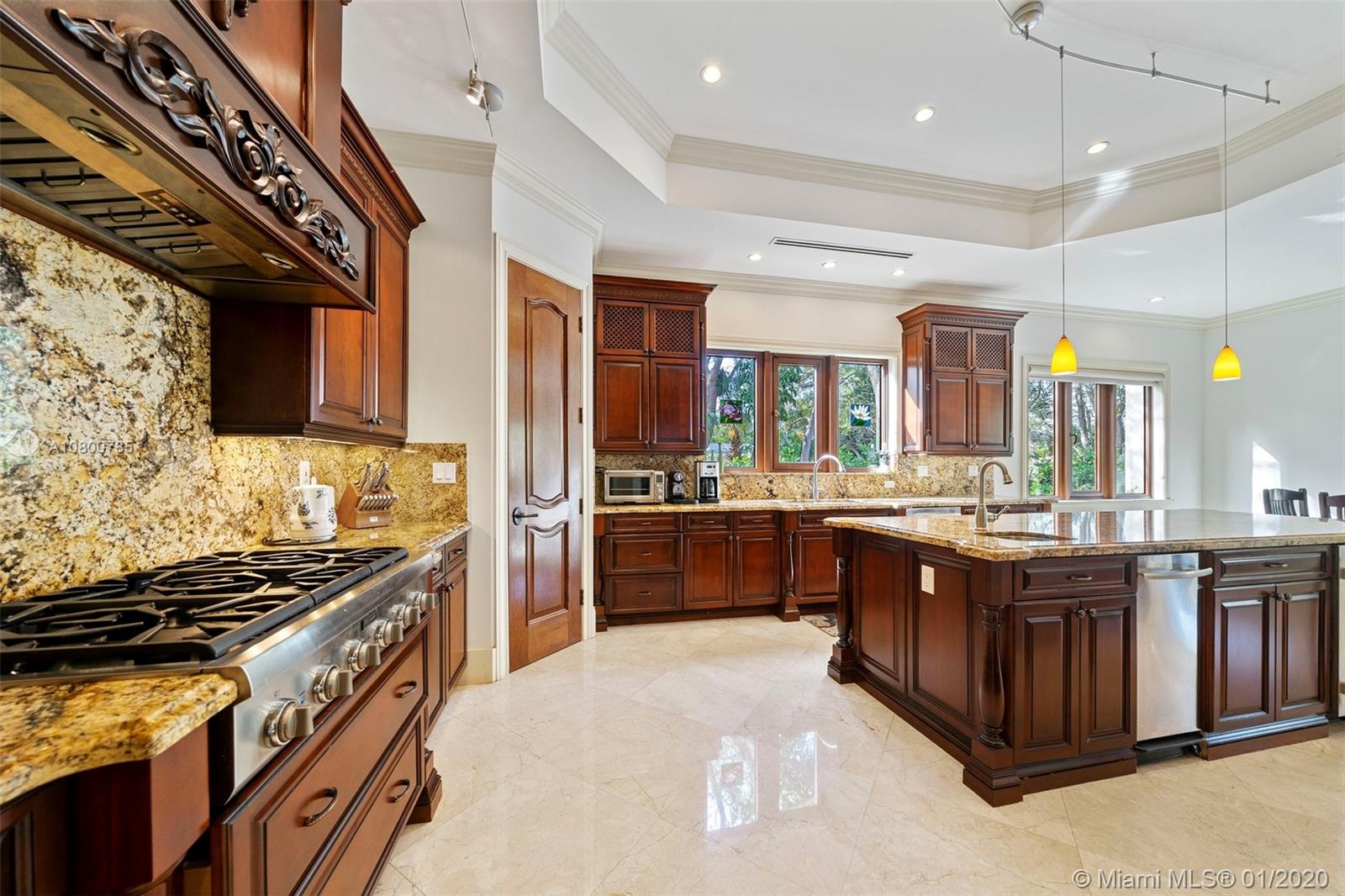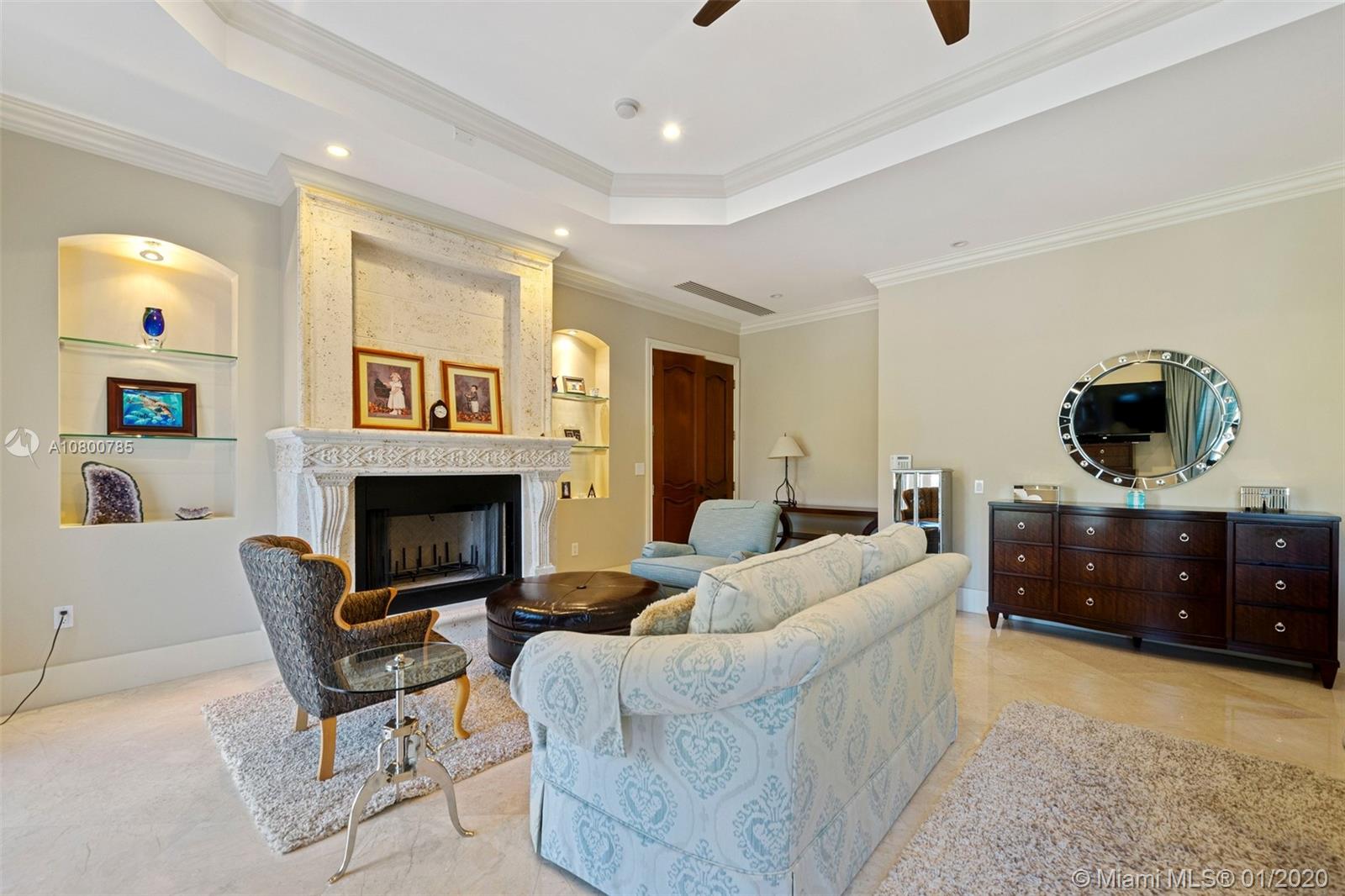 Impeccable 7 bdrm/ 6.5 bath gated residence on deep acre lot in Pinecrest. Grand foyer w/ impressive double entry doors, volume ceilings & marble staircase. Formal living & dining. Spacious family rm w/ keystone fireplace. Gourmet kitchen w/ large island, gas stove, breakfast nook. Downstairs you will find 3 guest bedrooms, the perfect guest quarters. Upstairs you will find the lavish master suite, complete w/ sitting rm w/fireplace, spa-like bath w/ steam shower and balcony, plus 3 additional guest bdrms. Marble flooring. Serene grounds include pool w/ water feature, expansive patios, summer kitchen, sprawling lawn beyond. Stone paver driveway. Room to discreetly park a boat. 2-car garage + 1-car carport, perfect for the car enthusiast.