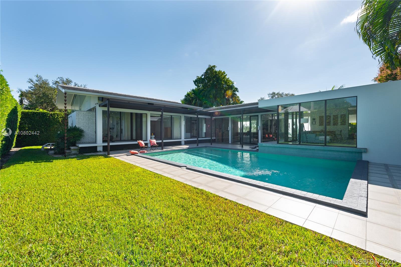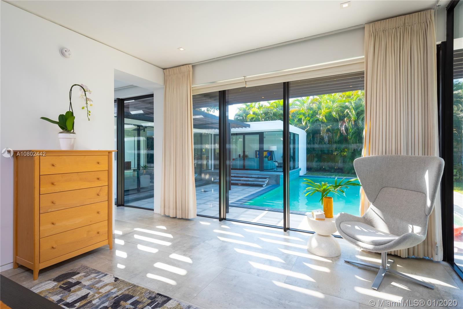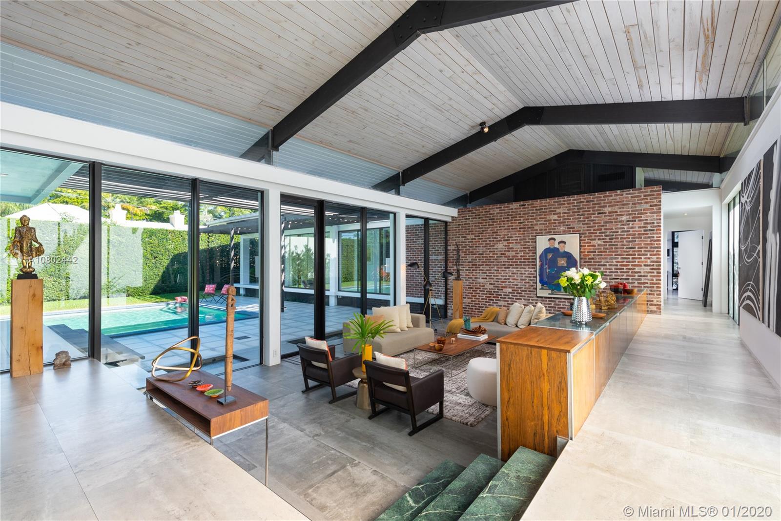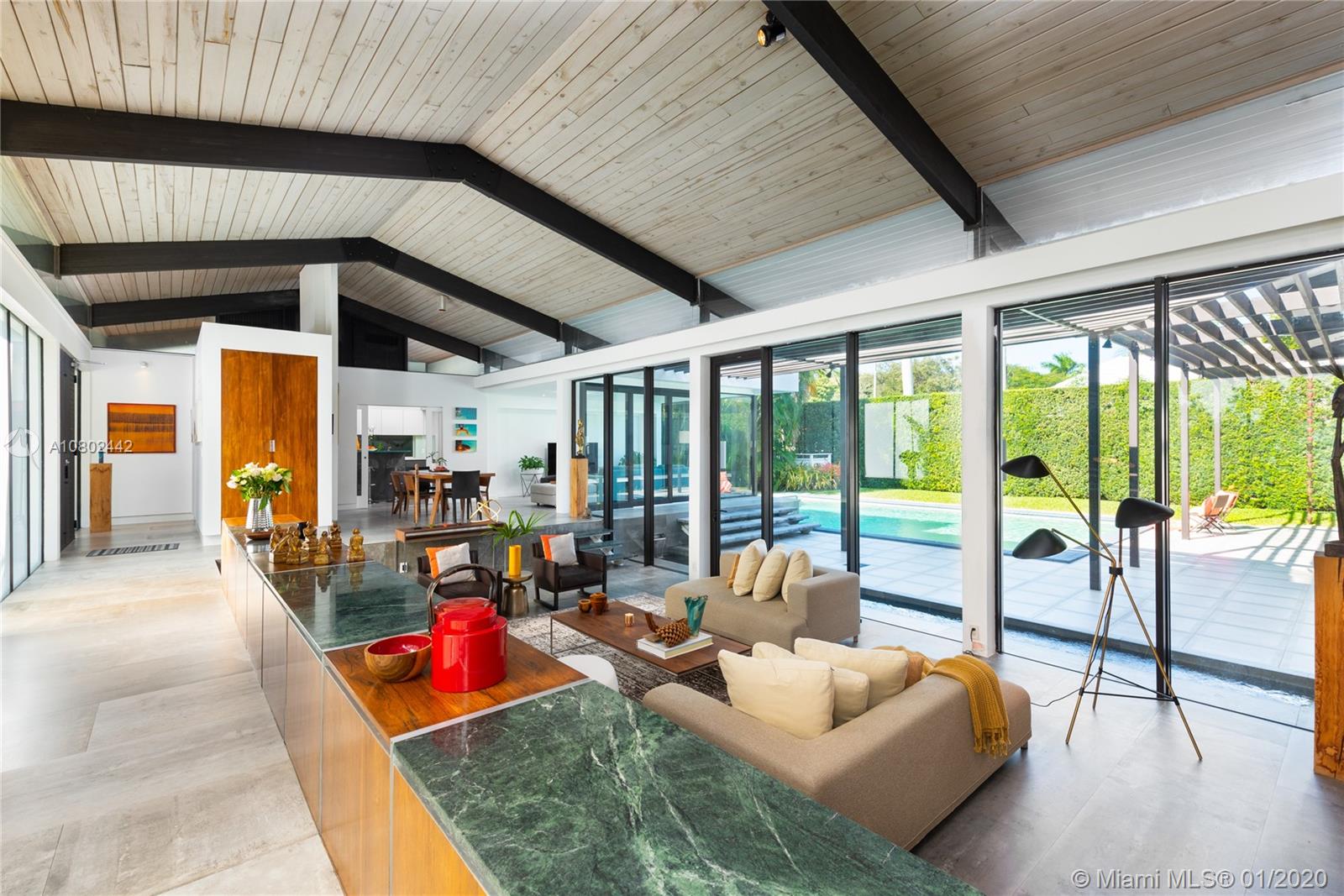 Timeless midcentury modern, 1 of a kind, Henry End designed architectural gem in Miami Shores exudes elegance of bye gone era & embraces excitement of modern living. Natural light flows throughout this 4 bd, 3 ba, 3,300+ sq ft home w/views of pool from every room.17’ ceilings add to voluminous feeling of home. Functional built-in 16' Brazilian Rosewood console divides sunken living room & gallery. Large pool adjacent to new koi pond surrounded by 15’ privacy foliage on oversized corner lot. Boasting gourmet gas chef’s kitchen w/second refrigerator in adjacent utility room. Located on quiet street in best section of Miami Shores 1 block from bay & bay walk. Future ready after comprehensive 22 mos renovation. Many more details available. A space not just for living, but for feeling alive.