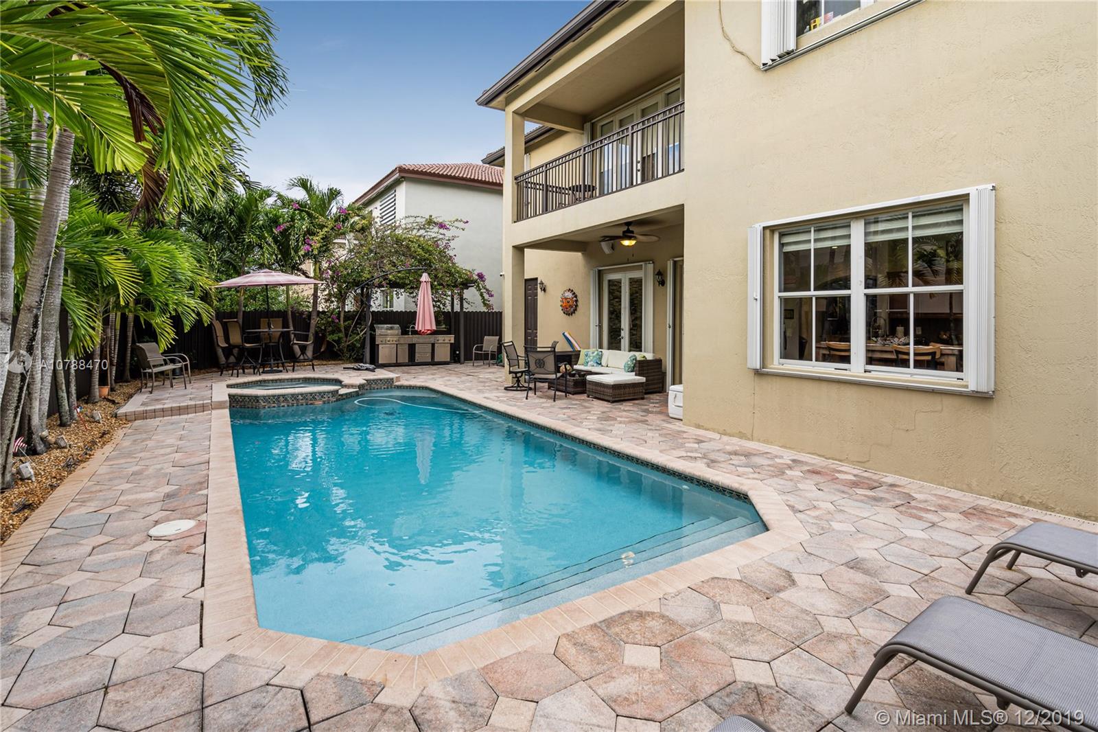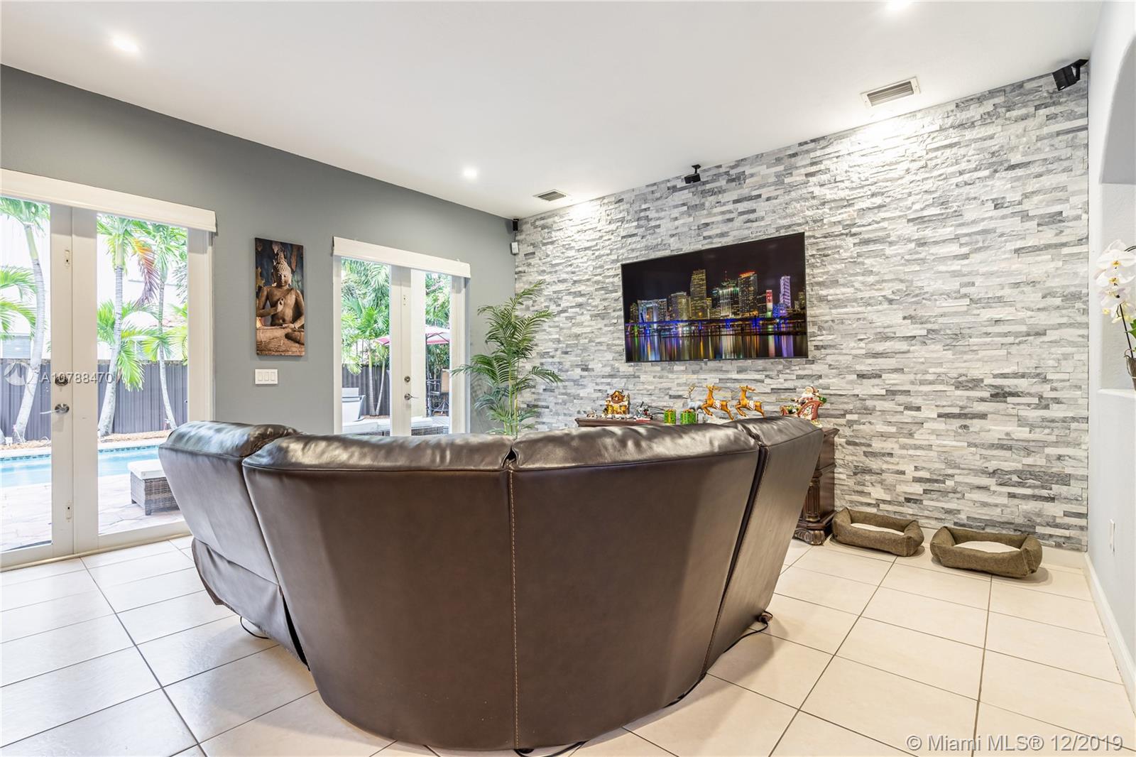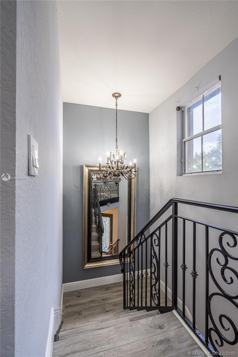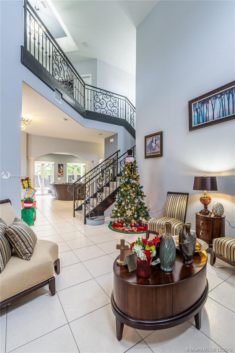 This amazing corner home is perfect for entertaining & large family gatherings. Near Turnpike & I-75. Totally remodeled bathrooms with double rain fall shower heads and seating area in master shower; featuring double sinks, vanity area and gorgeous tile and counter tops throughout. Large kitchen with granite counter tops, real wood cabinets & stainless-steel appliances offering an open concept to living/TV room with gorgeous, custom-made stone accent wall. All paved backyard paradise with outdoor grill & sink; palm trees lining aluminum fencing. Upstairs balcony terrace from master overlooking pool. Remodeled wrought-iron railings on stairs. Two brand new air condition units. Irrigation system in front with beautifully kept landscaping. Two inside car garages & driveway for 5+ cars. No HOA