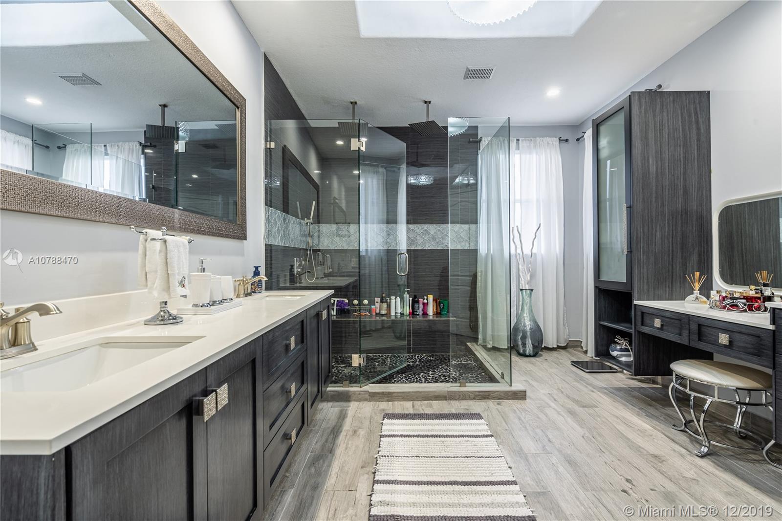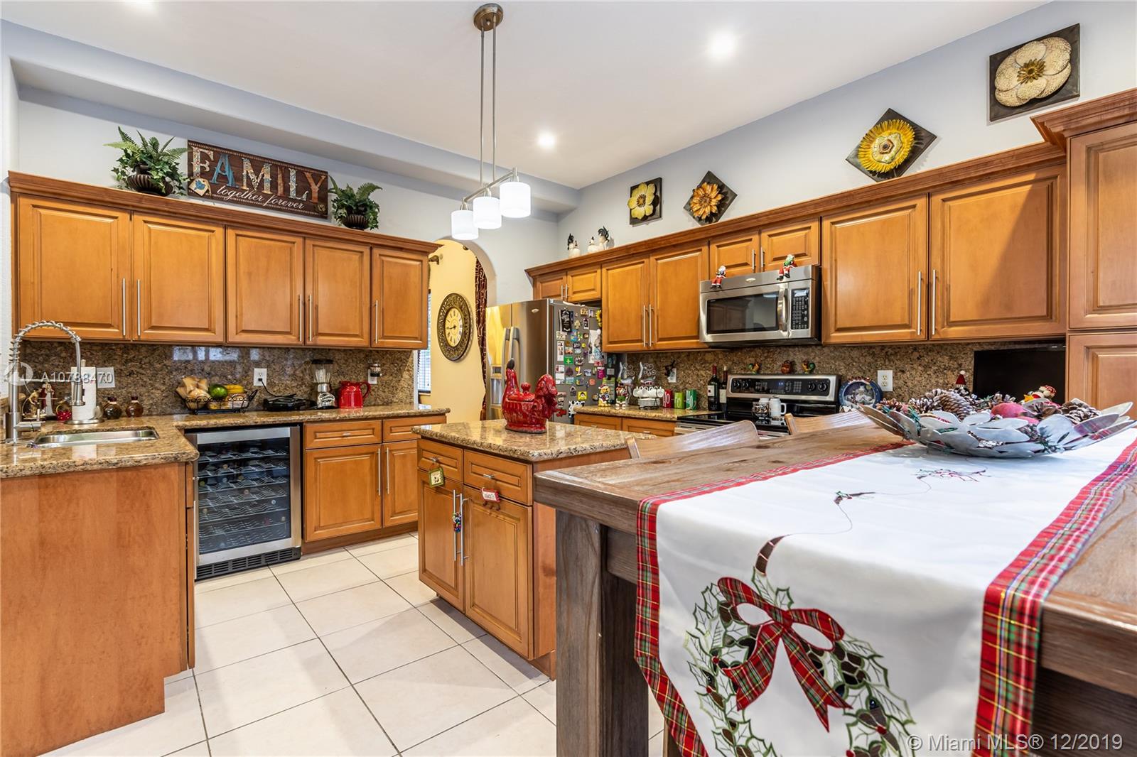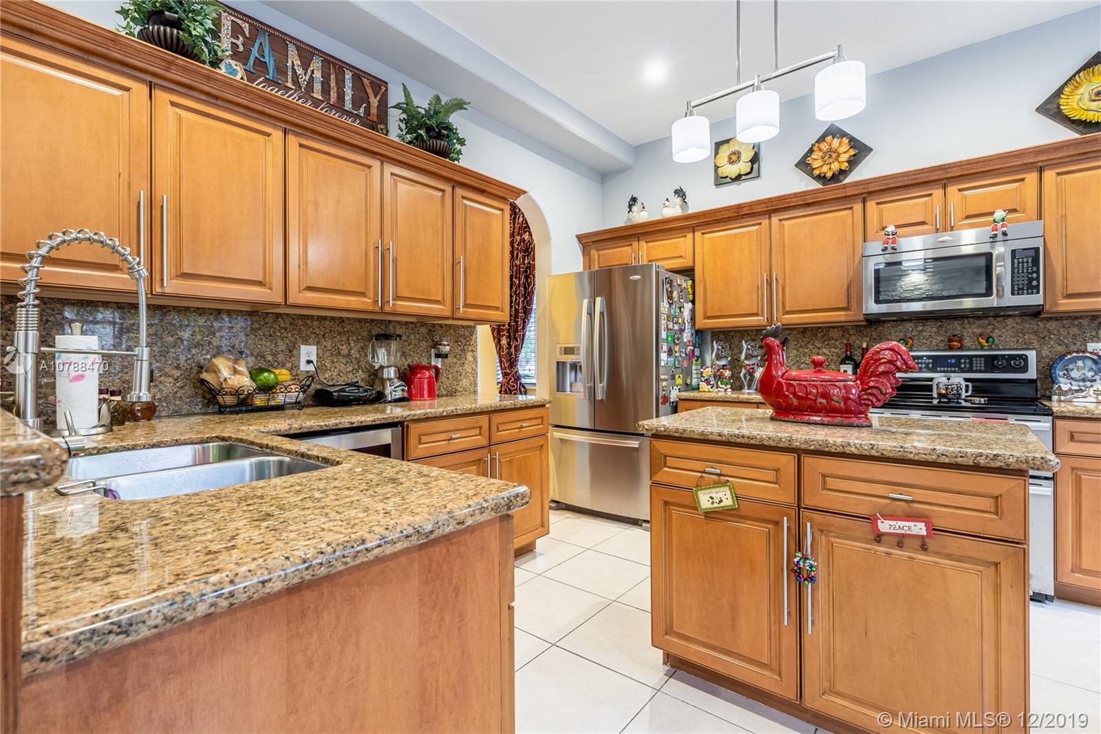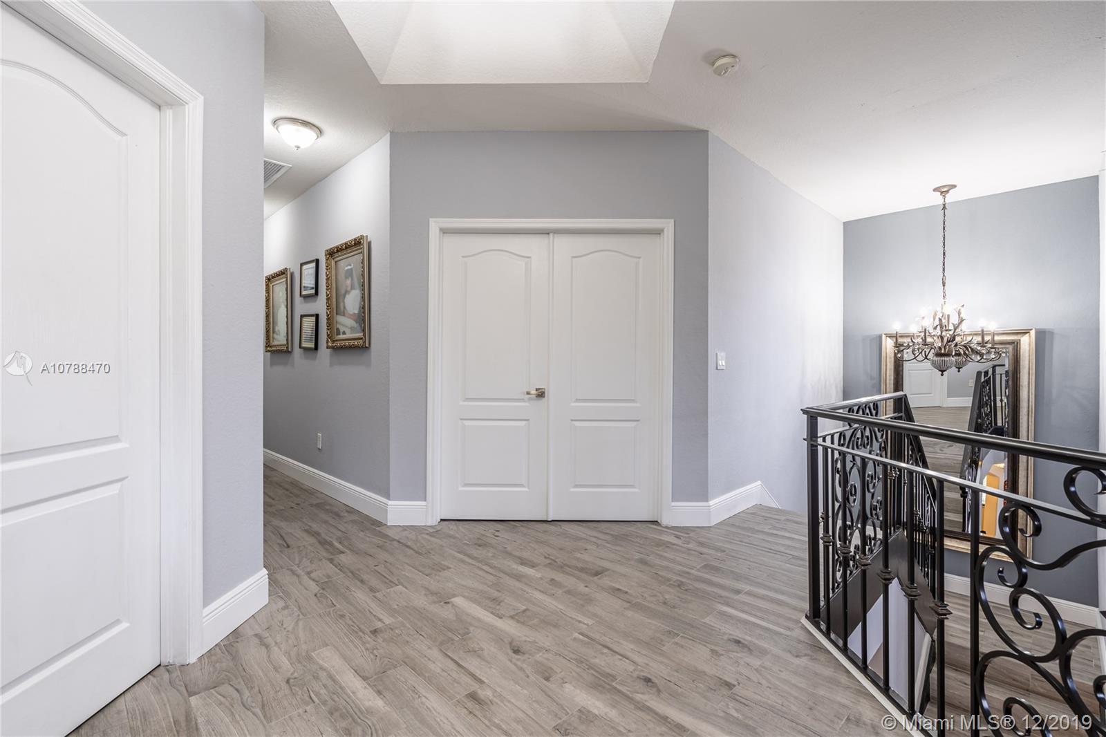 This amazing corner home is perfect for entertaining & large family gatherings. Near Turnpike & I-75. Totally remodeled bathrooms with double rain fall shower heads and seating area in master shower; featuring double sinks, vanity area and gorgeous tile and counter tops throughout. Large kitchen with granite counter tops, real wood cabinets & stainless-steel appliances offering an open concept to living/TV room with gorgeous, custom-made stone accent wall. All paved backyard paradise with outdoor grill & sink; palm trees lining aluminum fencing. Upstairs balcony terrace from master overlooking pool. Remodeled wrought-iron railings on stairs. Two brand new air condition units. Irrigation system in front with beautifully kept landscaping. Two inside car garages & driveway for 5+ cars. No HOA