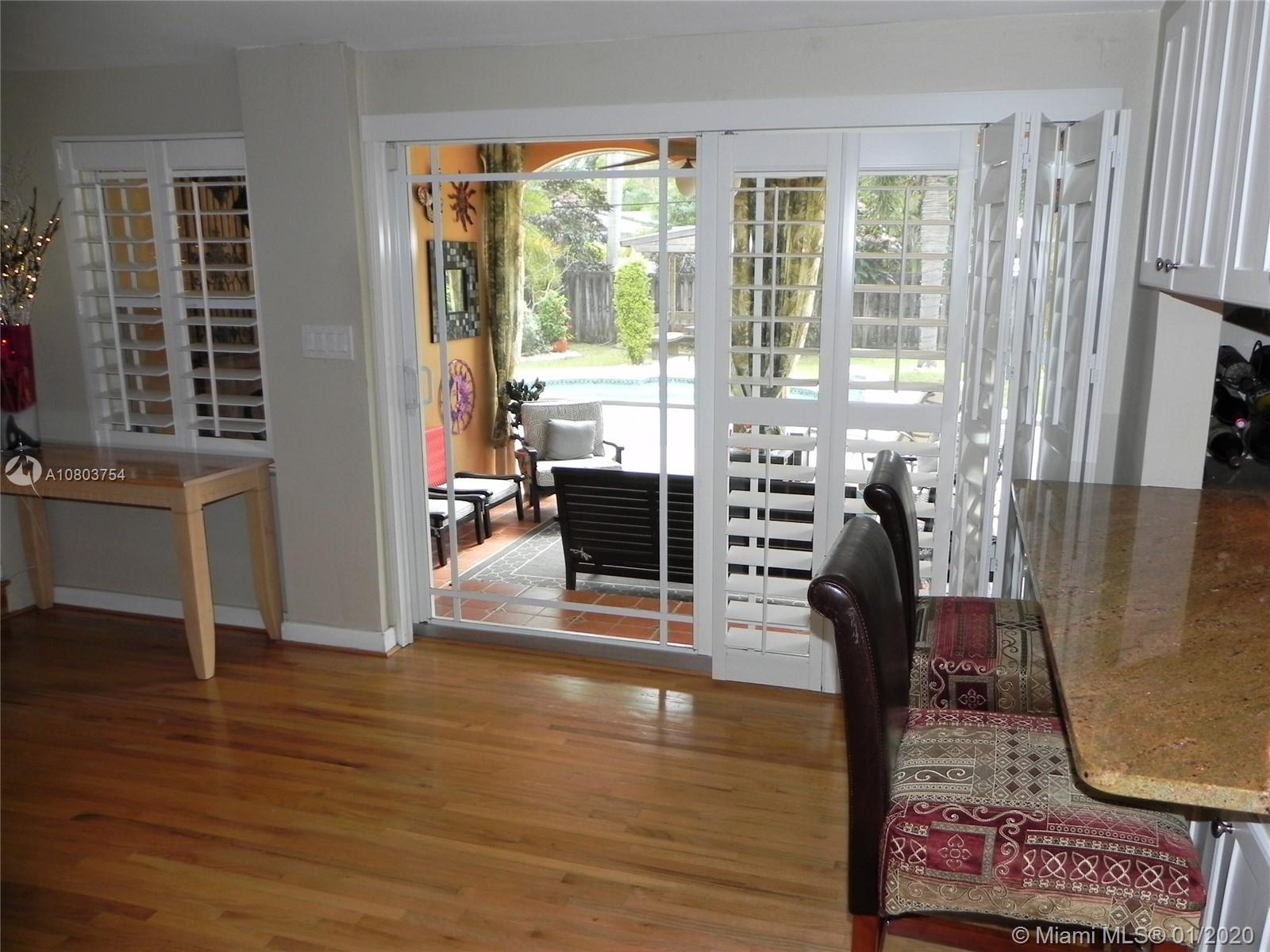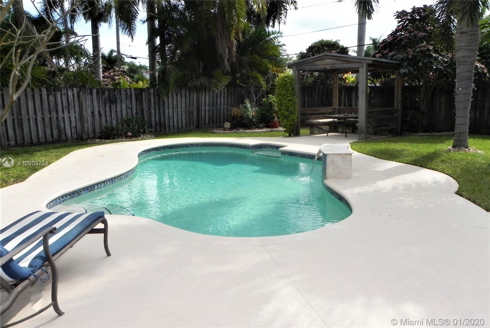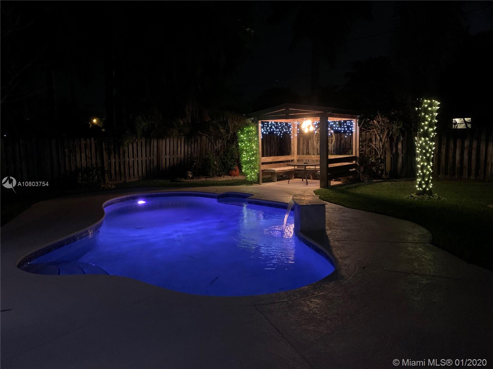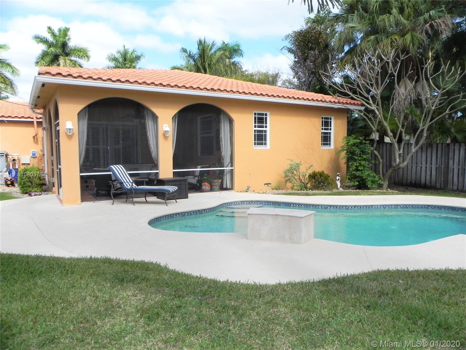 Beautiful Hollywood Lakes 3 bed, 2 bathroom home with awesome indoor and outdoor living spaces. Gorgeous screened and covered patio looking out to your huge backyard with large custom pool, established tropical landscaping, and private gazebo. Perfect for cooling off, relaxing, or entertaining friends and family. Large open kitchen with granite counters, stainless steel appliances, gas oven/range, tile backsplash, and custom cabinets. Kitchen opens to indoor bar overlooking pool and back patio. Beautiful indoor plantation shutters on all windows and sliding door. Private master suite. Impact windows and doors. Large stamped concrete circle driveway with one car garage and laundry/utility room. Minutes to beaches, downtown, golf, and more. Dade/Florida pine wood floors. Gas water heater.