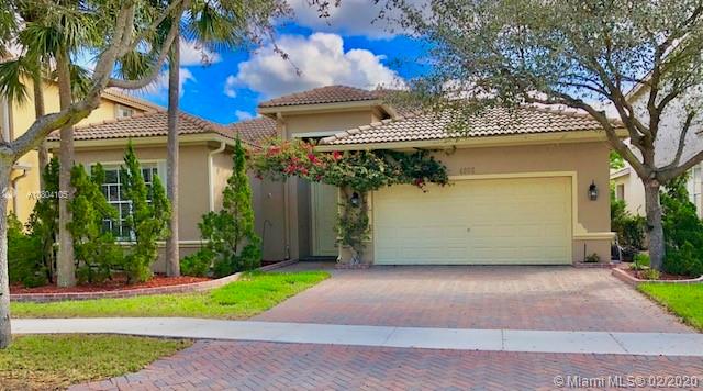 Tucked on a quiet cul de sac in The Isles at Weston, a gated community with state of the art Community Center, recently updated including heated community pool, kiddie pool, exercise room, basketball courts, playground, gazebo and more. This spacious one story is neutral and ready for immediate occupancy. Double split floor plan with spacious master bedroom, 9 foot ceilings throughout.Stone look tiles flow throughout the home. Wood cabinetry in kitchen with sunny breakfast nook. Sliders to private partially fenced and hedged yard with expanded paver patio with overhang and room for a pool. Master bath with roman tub, dual sinks and shower. Beautiful curb appeal with paver driveway and bougenvilla. Walk to elementary, middle and high school.