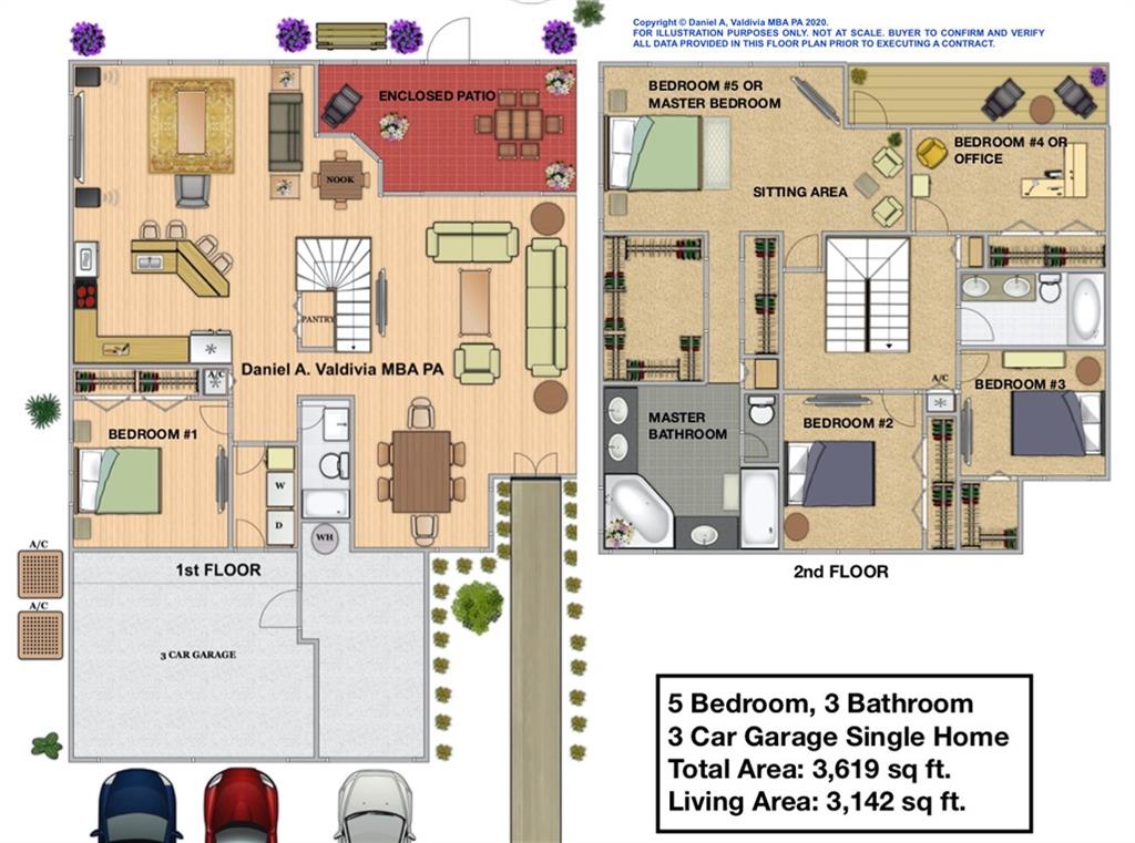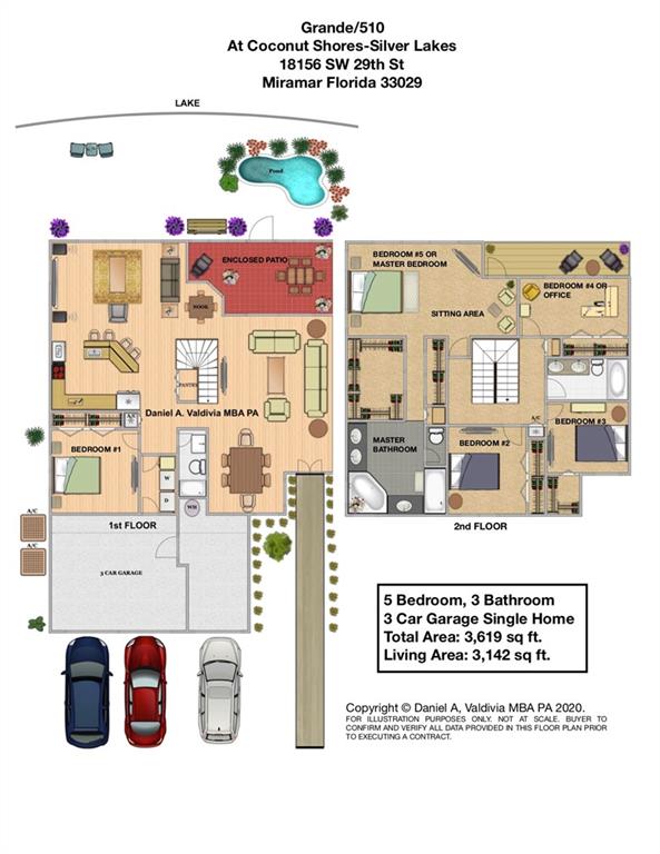 Pristine two-story, 5 bedrooms/3 bathroom /super clean 3 car garage single home in prestigious Coconut Shores / Silver Lakes in West Miramar. 3,619 sq ft total & 3,142 sq ft of living area. One bedroom and full bathroom on the 1st floor; perfect for guests or in-laws. No HOA application. Fully upgraded kitchen. Master suite features a spacious sitting area and an open balcony overlooking a lake, large walk-in closet, dual sinks, separate shower & soaking tub! Large interior laundry room. Accordion shutters and steel-reinforced concrete cinder block construction. Oversized lot with 6,807 sq ft comes with a pond and fish. HOA includes 2 community pools, 2 boat parks, cable, & super-fast Internet (over 300 Mbps). "A" rated Elementary, Middle & High School. Do you want to see it today?