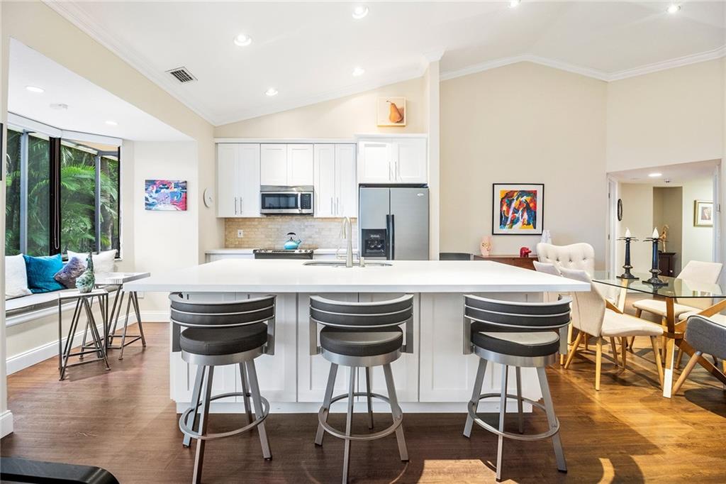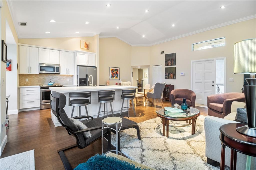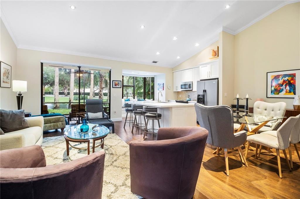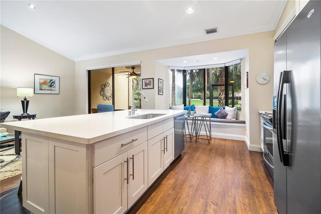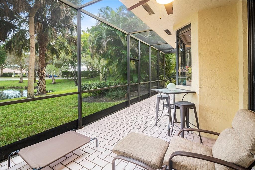 Stunning 2 bedrooms 2 bathroom townhome in the desirable community of Chelsea III. Contemporary updating throughout, this home features wood floors, beautiful remodeled white wood shaker kitchen with stainless appliances, quartz countertops, crown molding, marble bar splash, and custom storage bench seat with cushions. Perfect for entertaining, this home boasts a screened in patio overlooking the lake and fountain.. HURRY!!!