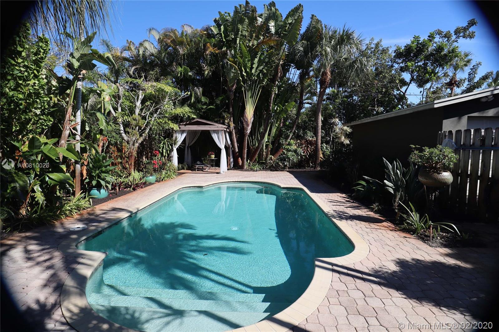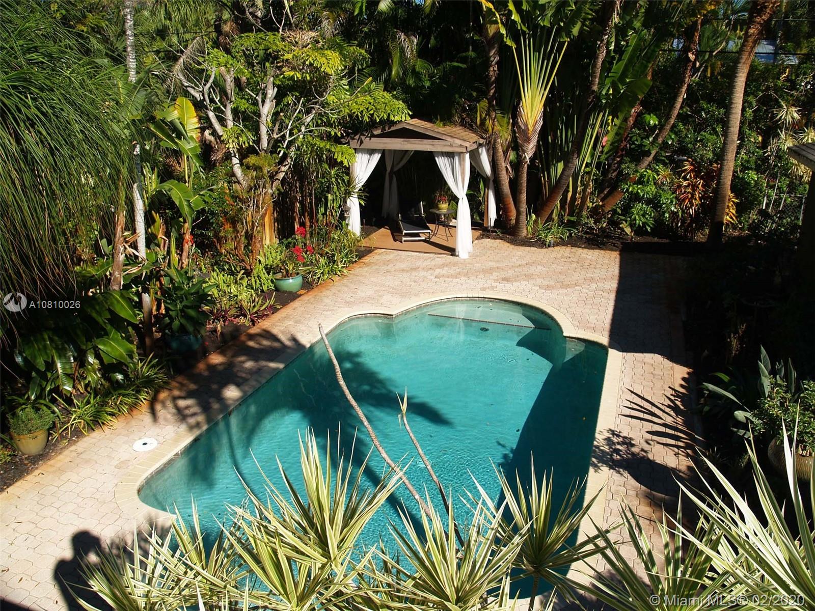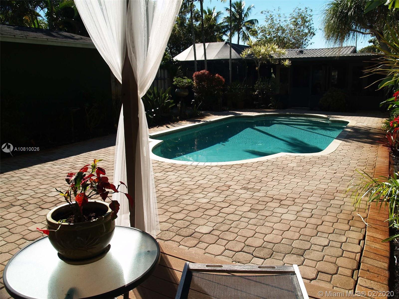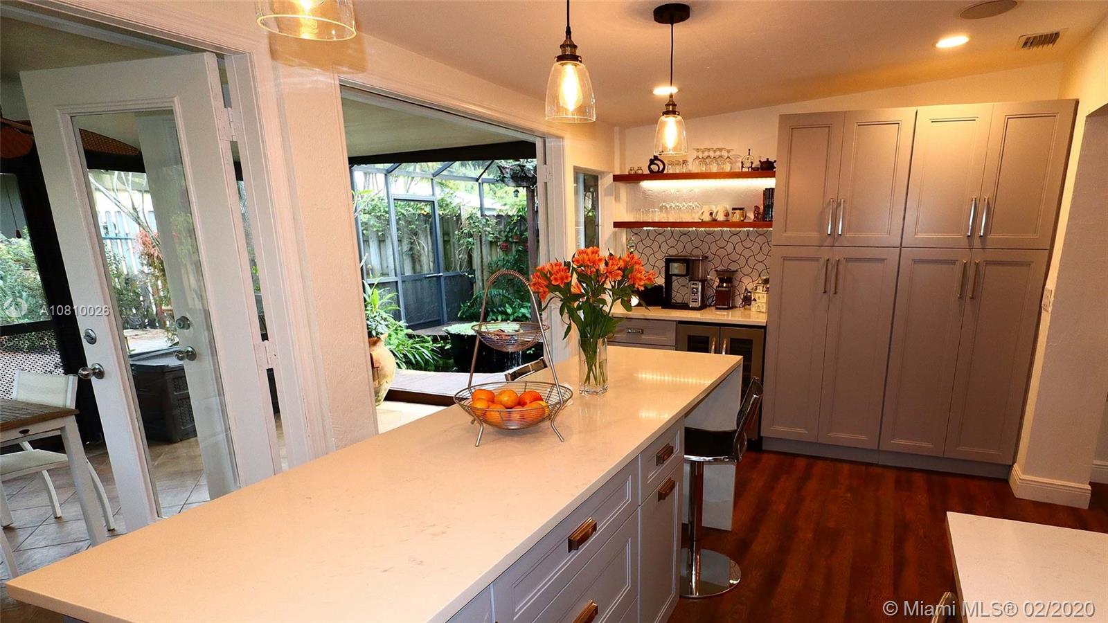 Immaculately upgraded open concept three bedroom, two bath pool home on private lot with rare find double car detached garage near everything in downtown Fort Lauderdale. This beautiful house features custom design barn doors separating bedrooms and living area. Terrazzo and high quality water-resistant vinyl plank flooring throughout, custom artistic Moroccan design backsplash with open shelf French style kitchen includes under cabinet lighting, brand new custom-made shaker style cabinetry, brand new Samsung stainless steel appliances, wine cooler and high quality quartz countertop throughout the island. This designer kitchen opens up to a relaxing screened in florida room including a koi fish pond with water fall under the trellis intertwined with jasmine vines.