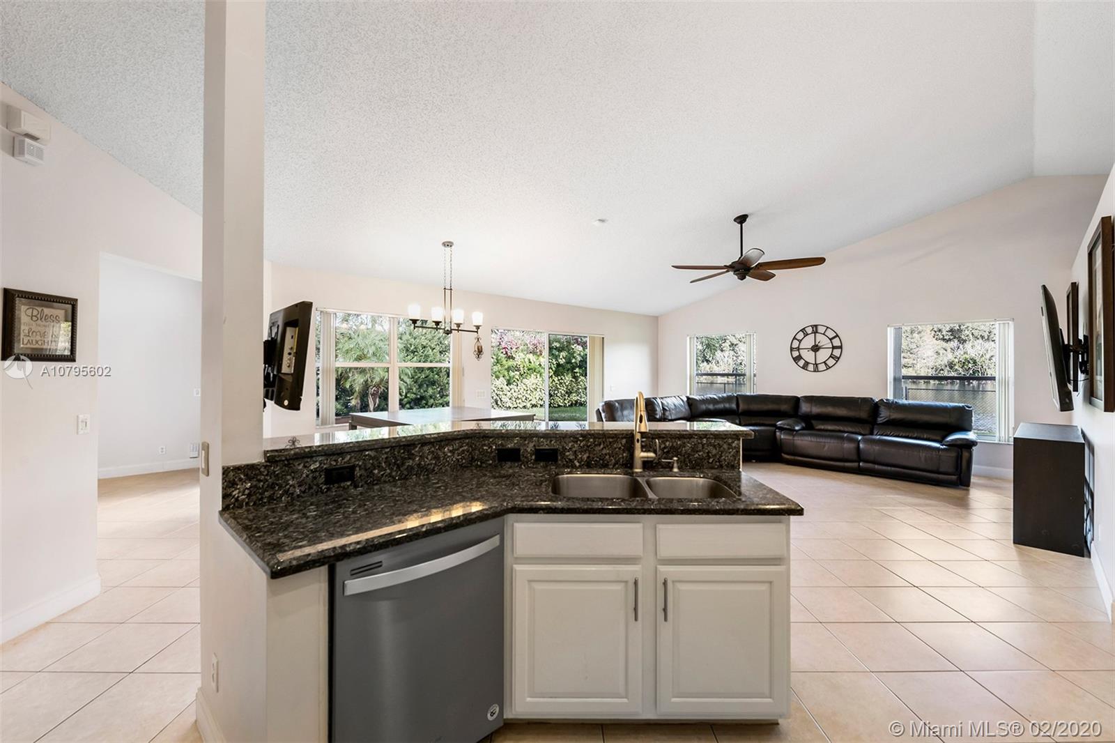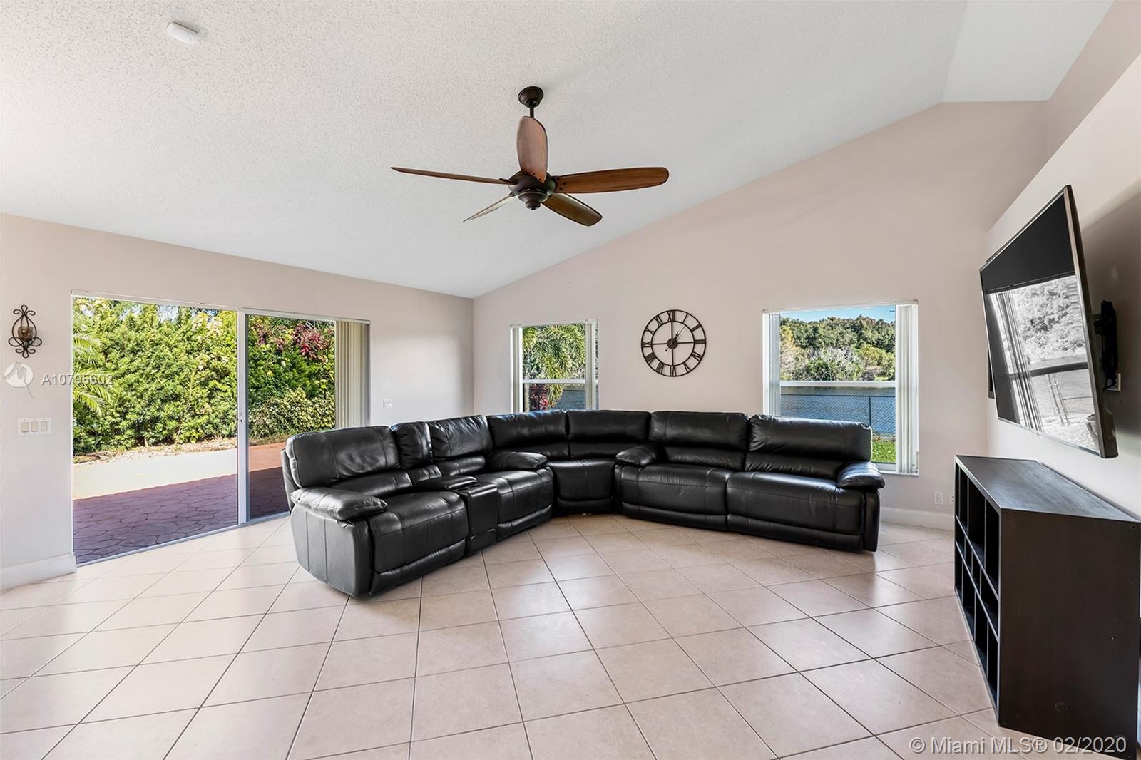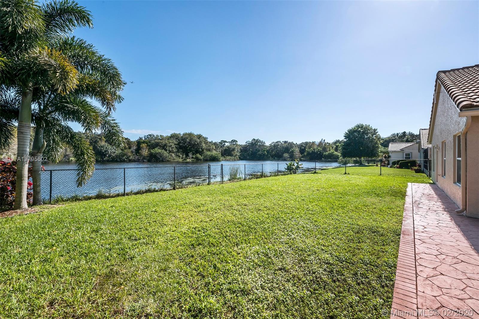 Spacious waterfront home in The Ridge on Nob Hill features 4BR (triple-split), 3BA, 3 car-garage, with tranquil and water and preserve views. Open-style floor plan w/ lots of natural lighting, formal living & dining areas, architectural niches, volume ceilings, upgraded kitchen w/ granite, stainless steel appliances, breakfast bar and area, open to Family Room. Master suite features 2 walk-in closets w/ built-ins, vaulted ceiling, sliding door access to private patio area, and an on-suite with spa-tub, dual sinks, and separate shower. Tile throughout, hurricane shutters, impact Cabana Bathroom door, fully fenced yard, community pool, walking trails, near Tree Tops Park, Westridge Open Space Preserve, Pine Island Ridge Natural Area, major highways and great schools.