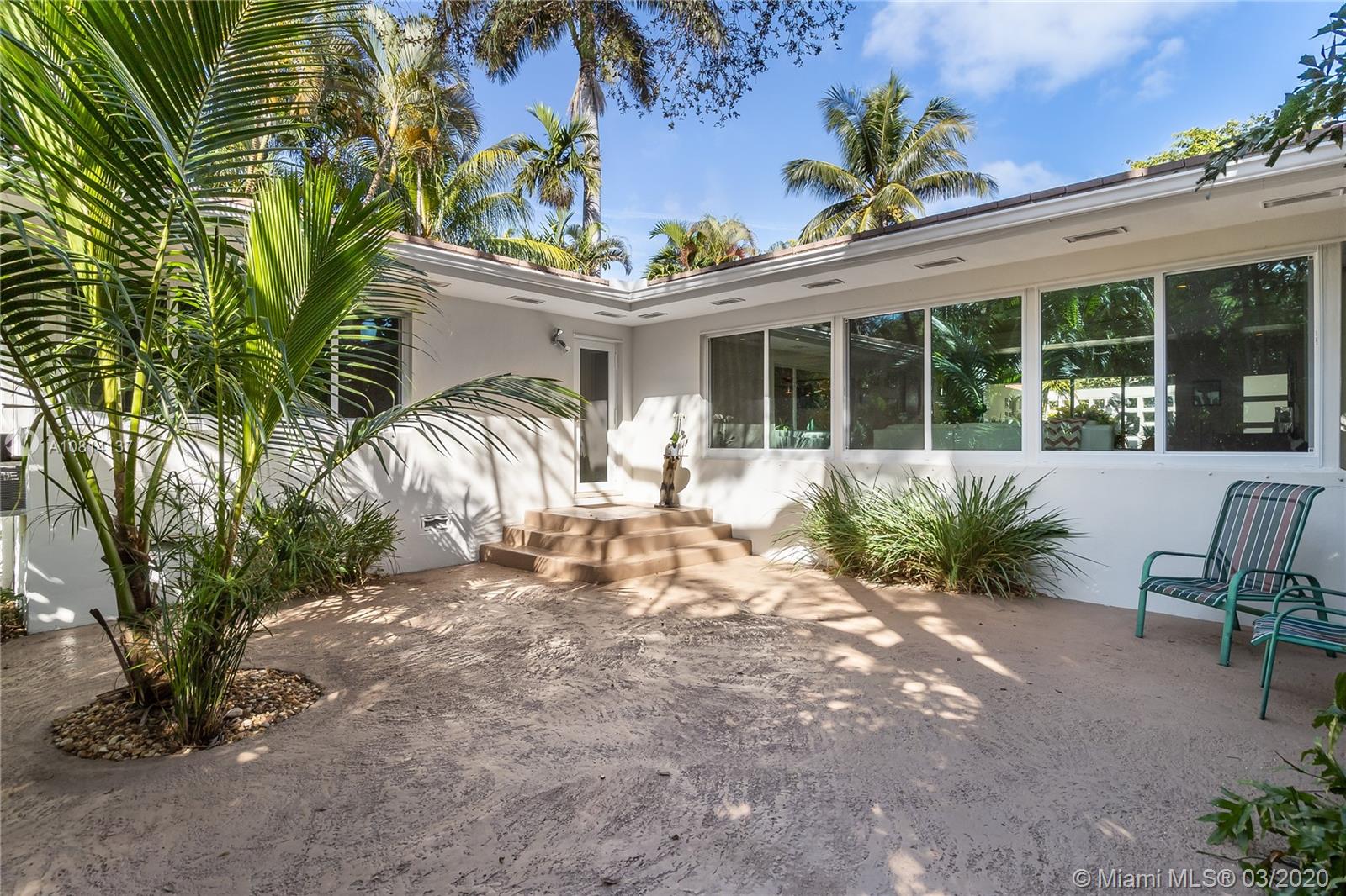 Spectacular, Miami Shores Mid-Century home. 3 bedrooms, 2 baths with a 2 car garage, sited on 9675 sqft lot. Original Mid Century details are everywhere with custom ironwork gates leading to the front courtyard, hardwood and terrazzo floors with inlays restored to their original beauty, open concept with glass everywhere, merging indoor and outdoor living. Steps from the bay with a partial bay view from the front. The backyard has beautiful trees and lush landscaping surrounding an ample patio area with no back neighbor providing quiet and privacy. This is Miami Shores living at its best.