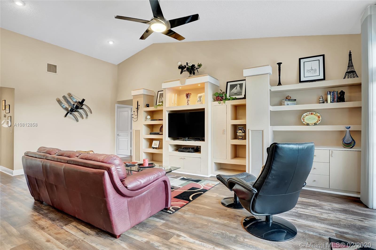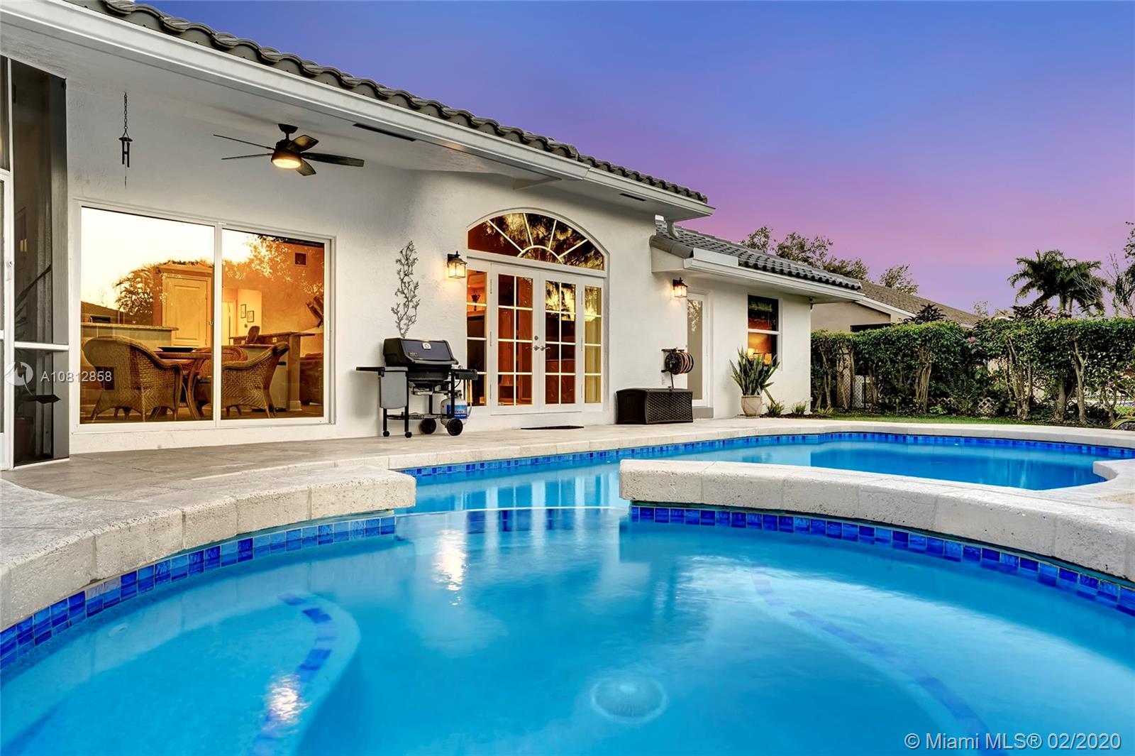 Living is easy in this beautiful, spacious residence with breathtaking pool and water views. The open floor plan encompasses four spacious bedrooms with plenty of room for study, sleep and storage, two and a half updated bathrooms, and a stylish gourmet kitchen that flows through to the casual dining and family room areas. The home wraps around the spacious rear patio and pool, offering water views from every angle. The split floor plan offers a private master bedroom, complete with finished walk-in closet and ensuite bath. Every detail was carefully selected and quality crafted. Highlights include 1 year old roof, impact windows & doors, brand new AC unit, new appliances and floors, new electrical panel & a recently renovated pool. This is truly resort style living in an ideal location.