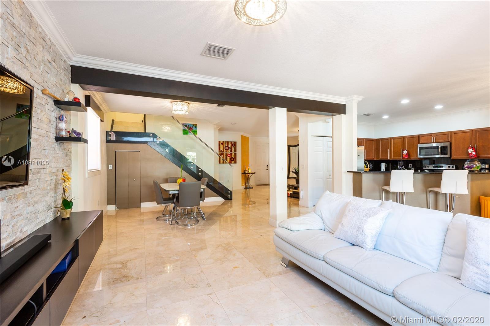 Gorgeous 4 bedrooms and 2.5 bathrooms two story single family in gated community Balmoral Estates in Doral. Open floor plan, beautiful marble flooring throughout the property. Kitchen with stainless steel appliances, wood cabinets and granite counter top. Modern stainless steel glass railing on the stairs. Spacious master suite with oversized walk-in closet, and master bathroom with double sinks. Large patio with pergola. Garage for 2 cars and driveway for 2 additional cars. Accordion hurricane shutters in all windows and sliding doors. Community pool. Walking distance of A+ schools, supermarkets, restaurants, banks and shops. Close to the Miami International Airport, Dolphin Mall, International Mall and the Turnpike. Ready to Move In.