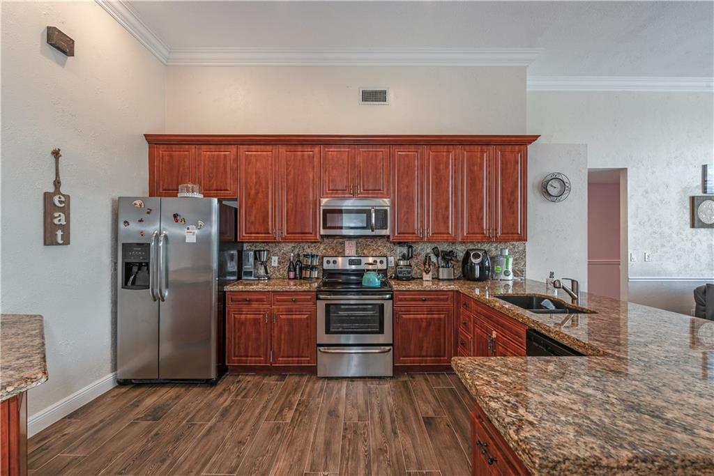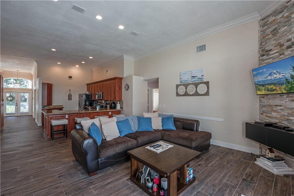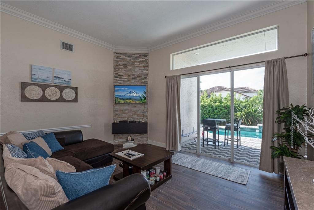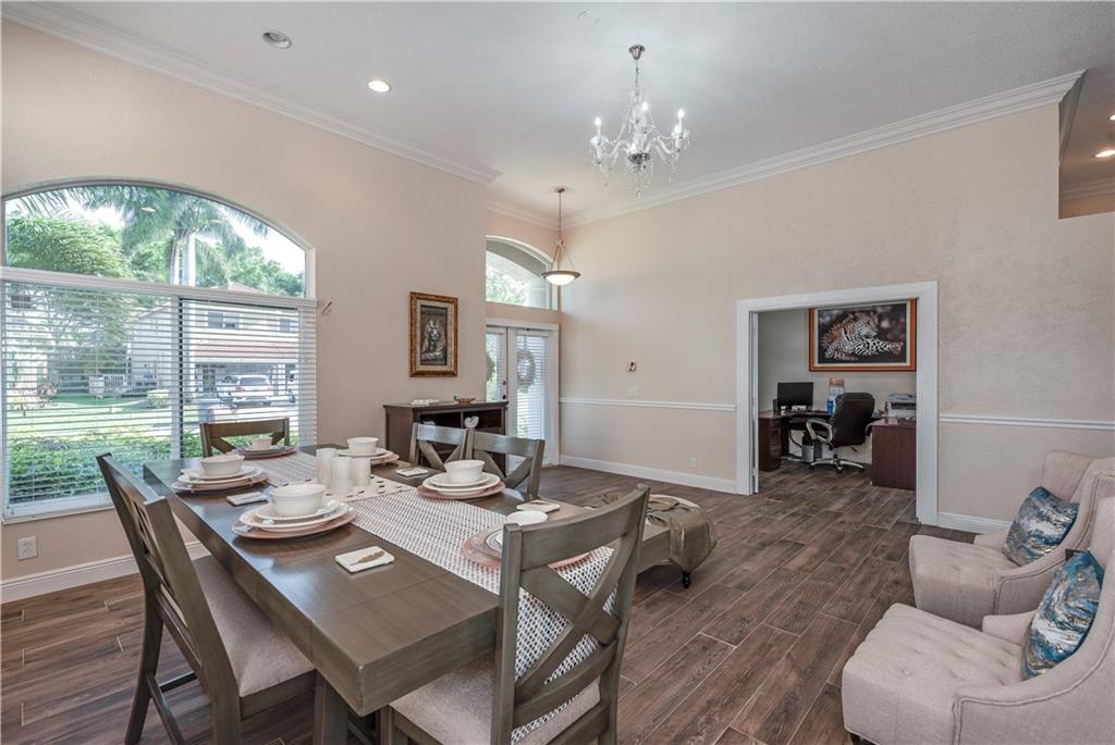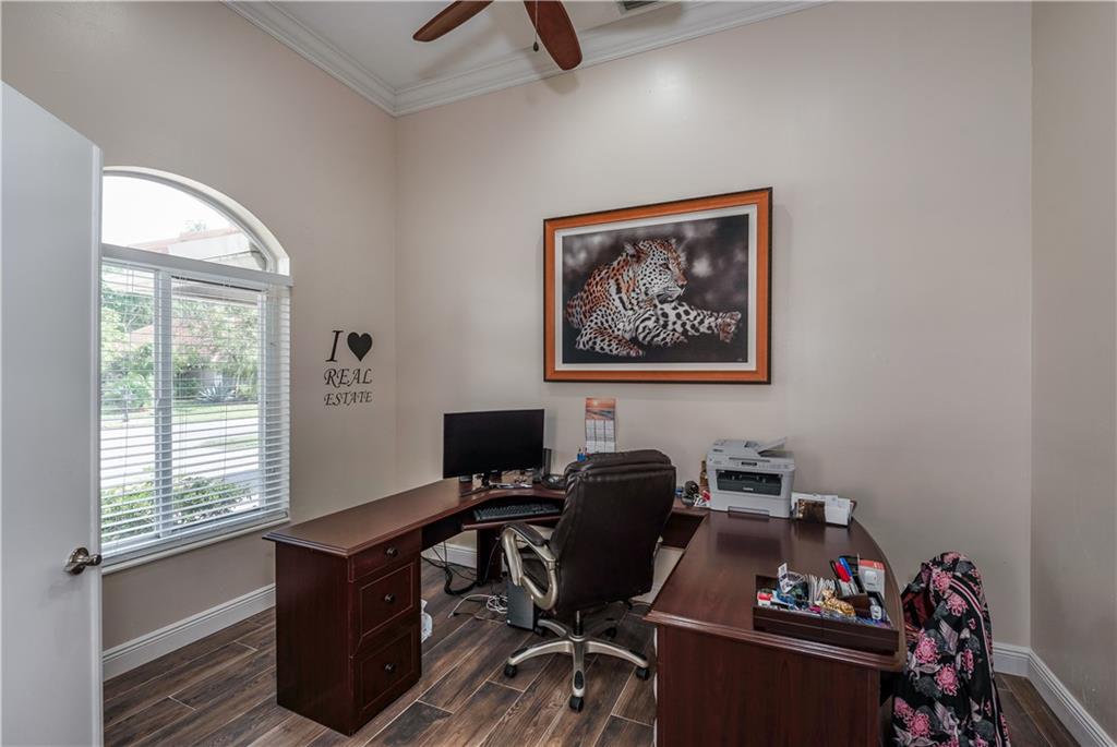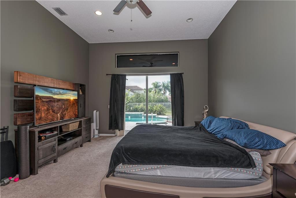 great updated single family home, features unique high vaulted ceilings with new crown molding and base boards, 5 bedrooms with one being used as a office, new tiled floors, granite kitchen, upgraded granite vanities in both bathrooms. brand new 5 tone ac installed 6 months ago. new front load washer and dryer, SS steel appliances.property has a fenced in pool, lake view from backyard
