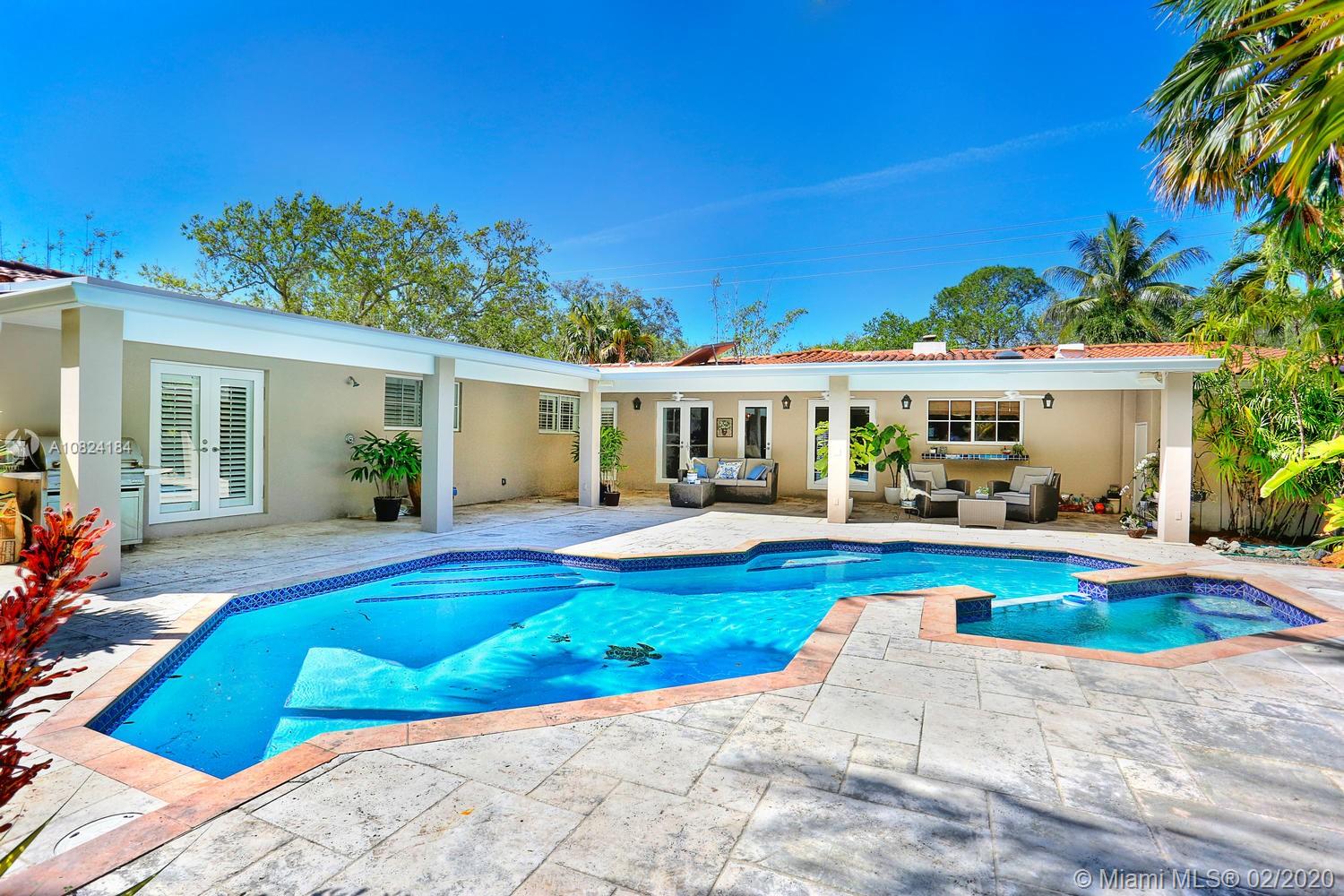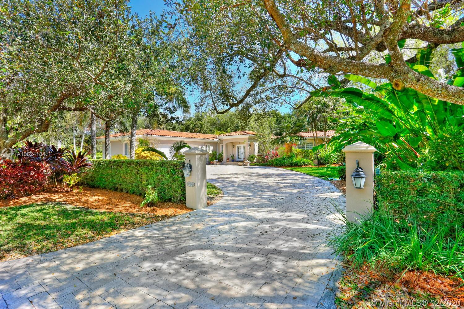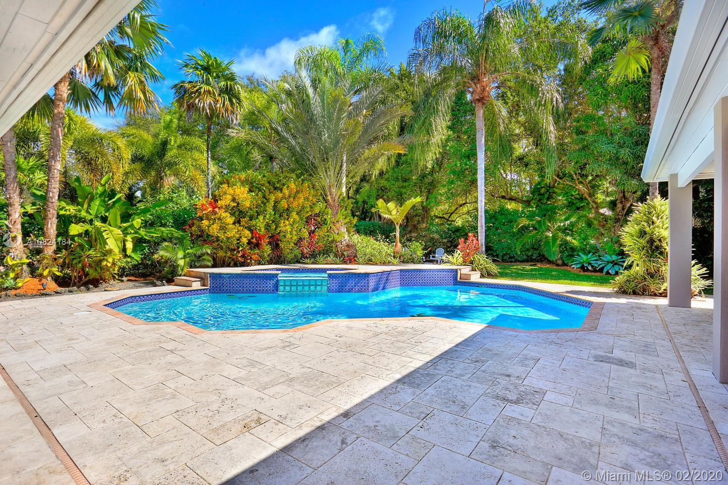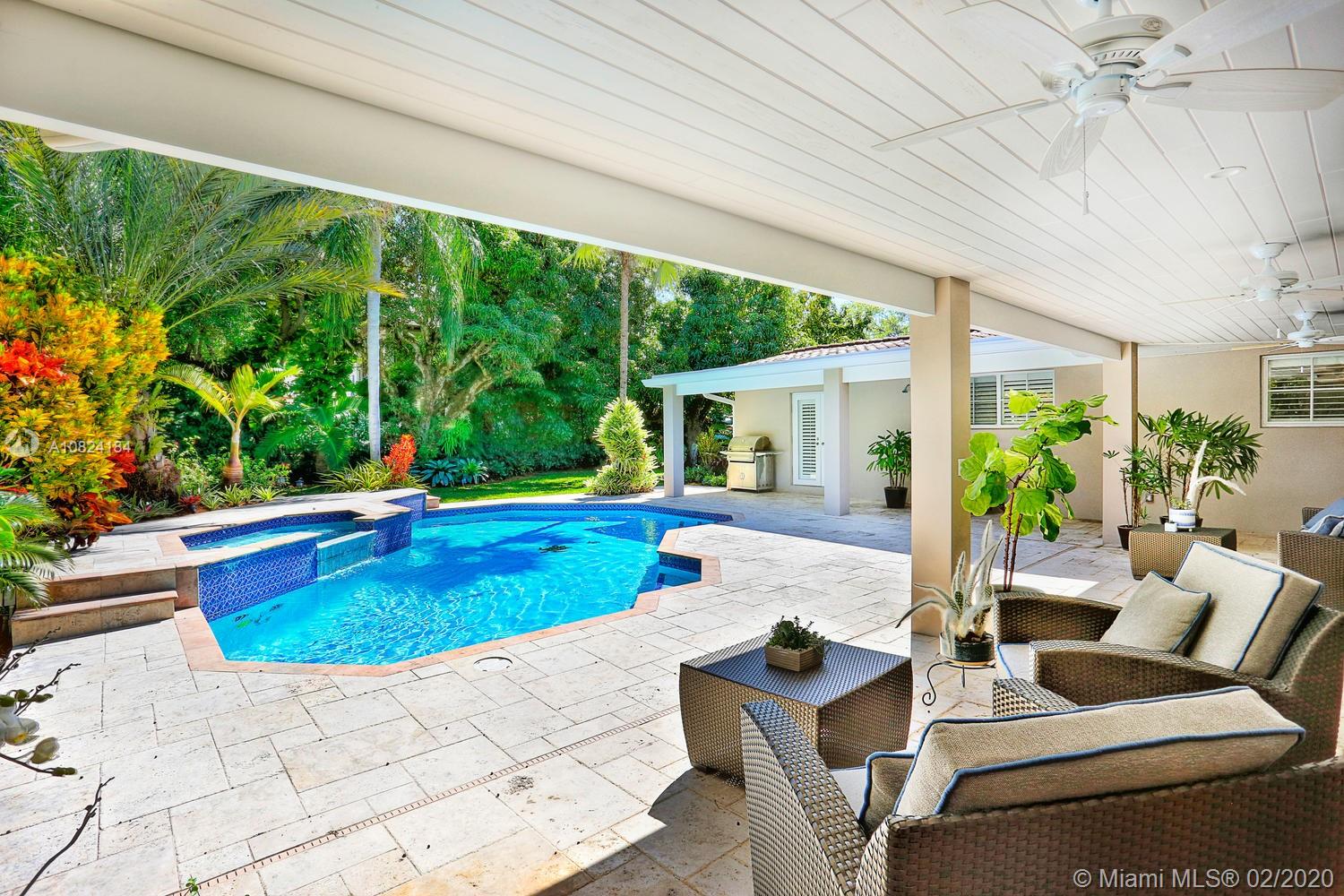Magazine quality estate surrounded by a ~20,000 SF lush tropical lot w/ mango & avocado trees. Located in a prime North Pinecrest neighborhood. Major renovation & expansion in 2003 w/additional recent updates including appliances, HVAC's, bathrooms & new roof. Light-filled living spaces feature marble & wood flooring, volume ceilings, California shutters, crown moldings & a working fireplace. Large, open kitchen has center island, bar seating, custom wood cabinetry, stainless appliances (including gas range), granite countertops, walk-in pantry and separate breakfast nook. Master suite features sitting area, walk-in closet and luxurious bath with frameless glass steam shower & soaking tub. Spectacular outdoor area offers covered terraces, pool w/spa & expansive ultra-private garden.
