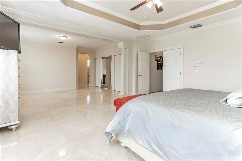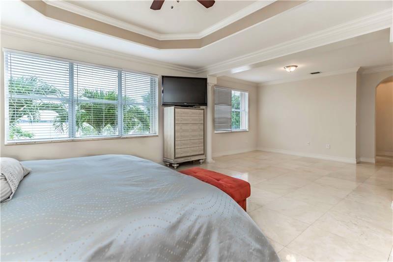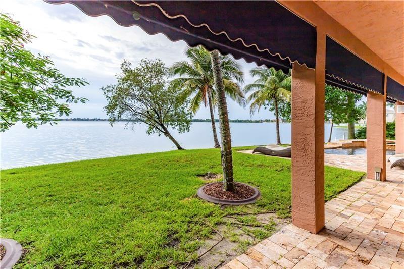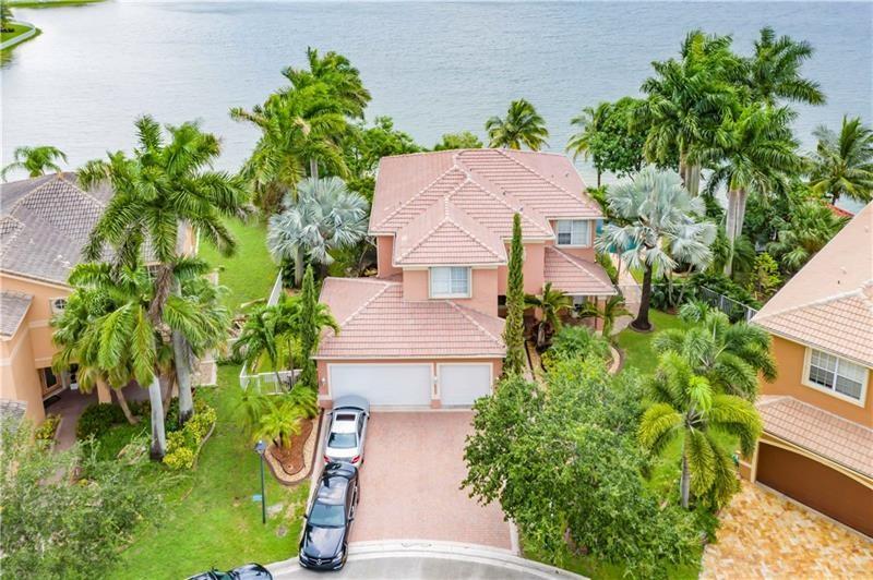 Welcome to the most spectacular wide lake views in Sunset Lakes! Waterfront 6 bedroom 4.5 bath home with a 3 car garage at the end of a cul-de-sac on an oversized lot that extends out over the lake. Features include an updated kitchen with river white granite counter tops, stainless steel appliances and cherry wood cabinets, a first floor guest bedroom with cabana bath, a separate entranced office, an enormous master bedroom with a large sitting area and his/her bathrooms connected by the shower, an upstairs laundry room, polished travertine tile throughout the entire first floor and all bedrooms, 2 a/c systems and a free-form heated pool with raised spa overlooking the panoramic views and amazing sunsets.