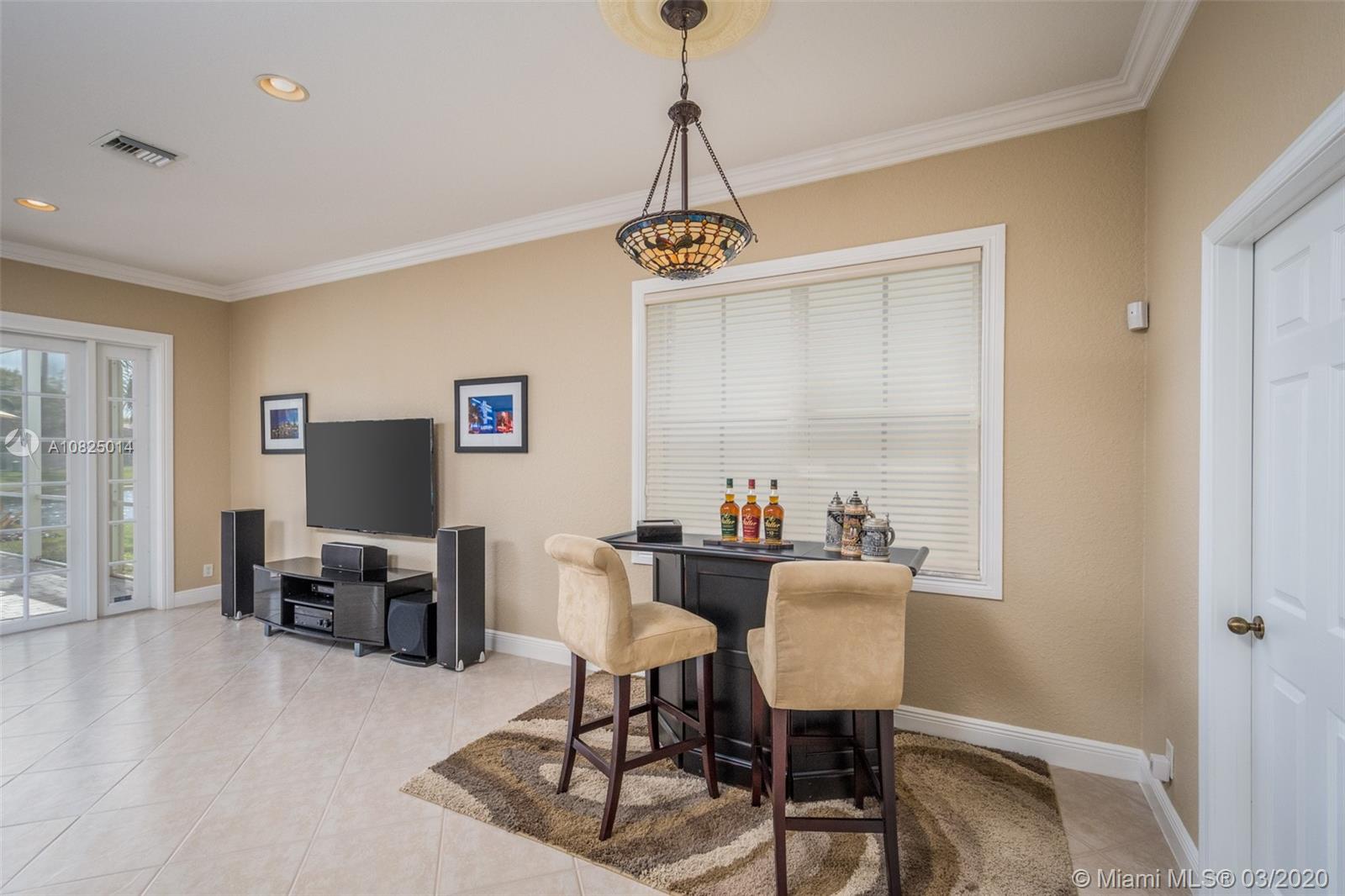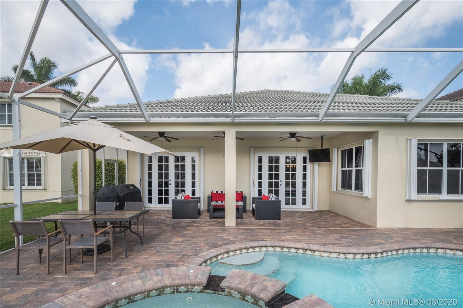 Serene backyard oasis, with pool, hot tub and water views that feels like another living room with the included outdoor tv and furniture. Large french doors that fully open to views of pool and water and create an indoor/outdoor feel in the open floor plan. Professionally tinted windows and doors increase daytime cooling efficiency and privacy. New high efficiency, 2 stage AC and Pool heater (2016). Bright white crown moldings and raised baseboards against neutral wall coloring create a resort like feel. Accordion shutters on windows and doors allow for low stress hurricane prep.