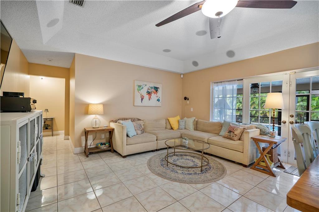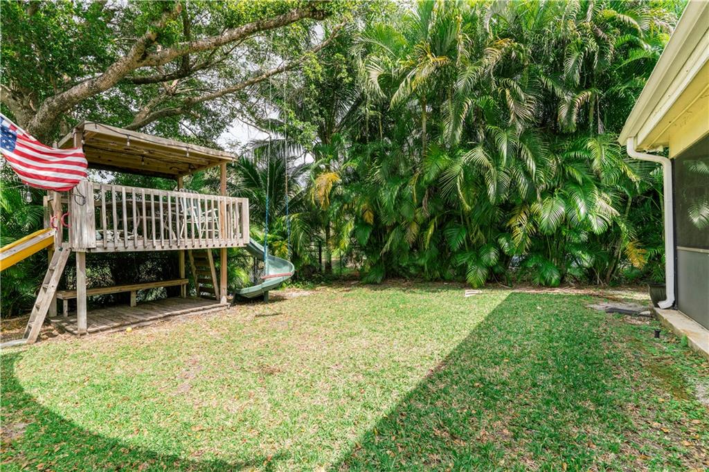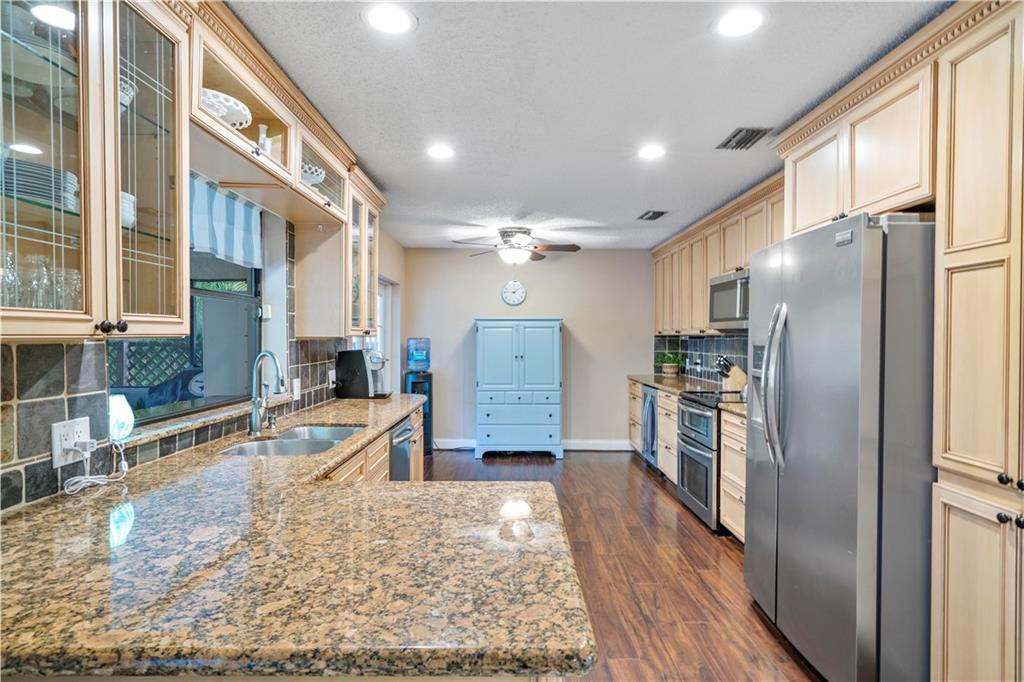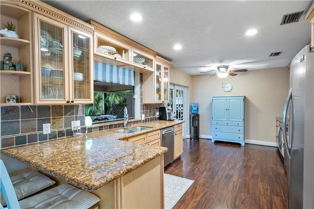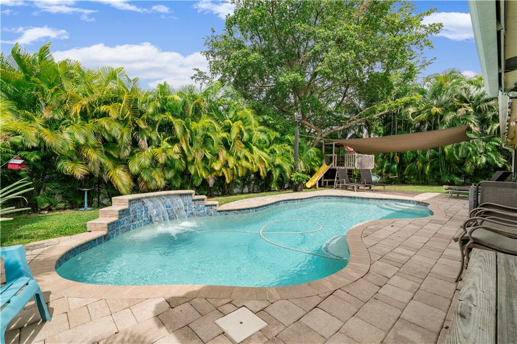 Spectacular pool home on canal. 4 bedrooms, 2 1/2 baths with formal living and family room. Updated kitchen with granite counters, wood cabinets and SS appliances with wine fridge. Tile and wood floors throughout, surround sound, recessed lighting, french doors and large master suite with spacious closet. Extended Florida room for entertainment. Waterfall salt water, solar heated pool with play set and yard space. Security System and cameras, fenced yard, landscaped lighting, hurricane shutters and garage impact door. Total privacy in your backyard oasis. Cabana baths with outside shower. A/C 10 years, Roof 8 years, hot water heater 4 months.