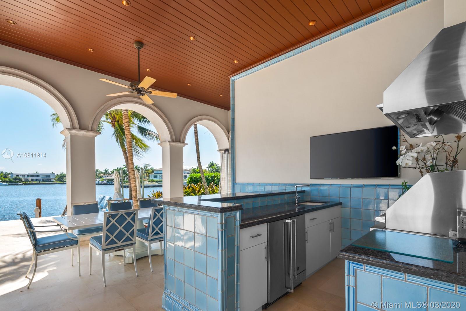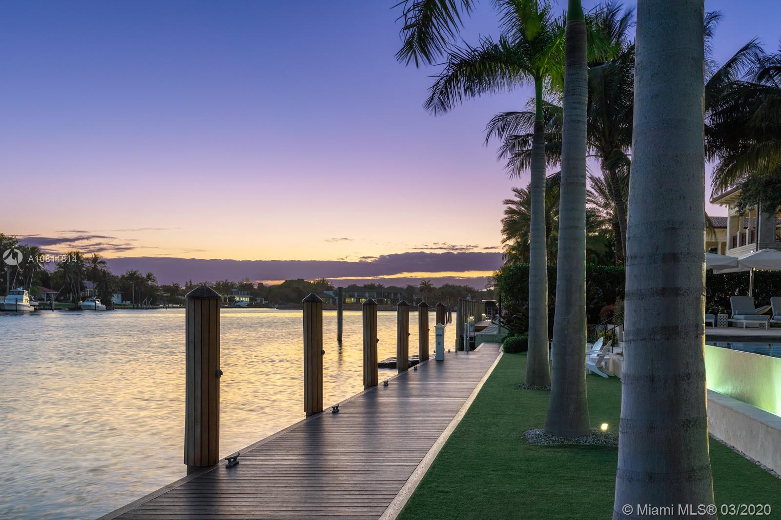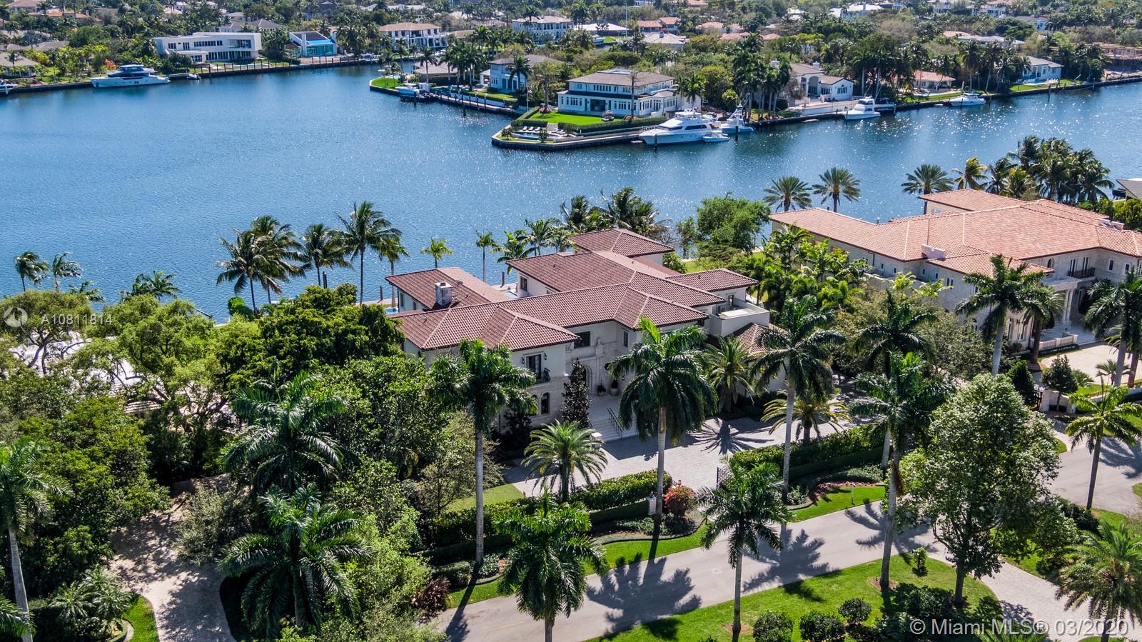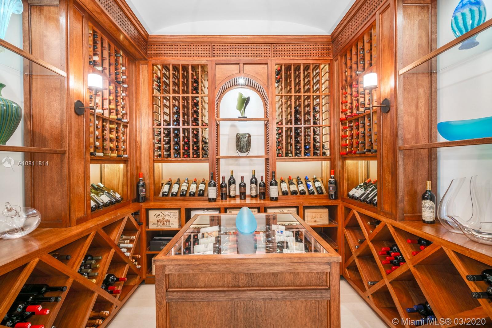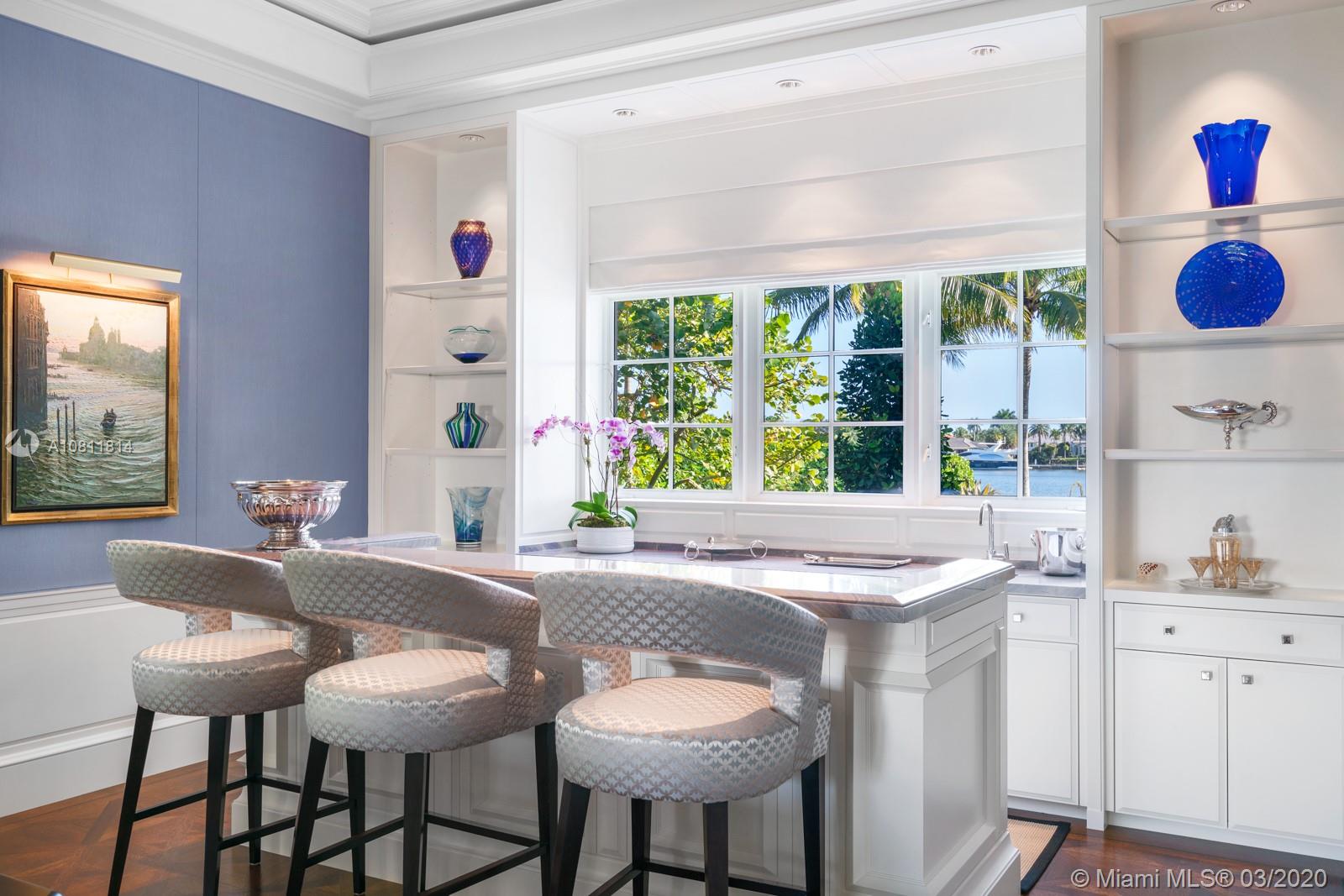 Located on the water’s edge in Gables Estates on a 42,253 sf lot facing a wide lagoon with direct bay access, this luxurious 15,522 total sf, 5BR/7+3BA palladian waterfront villa comes with picturesque views from several sitting areas. Downstairs are the formal living room, dining room, gourmet kitchen, breakfast room, family room with wet bar, and billiards room with a second bar, all with custom Venini glass lighting. The kitchen comes with a hidden butler’s kitchen and walk-in wine cellar for an equally impressive collection. Two home offices can be converted into additional bedrooms, and secret storage spaces are scattered throughout. Summer kitchen, saltwater heated pool, 180 ft dock with boatlift and ideal water features enhance this inviting home for both entertaining and leisure.