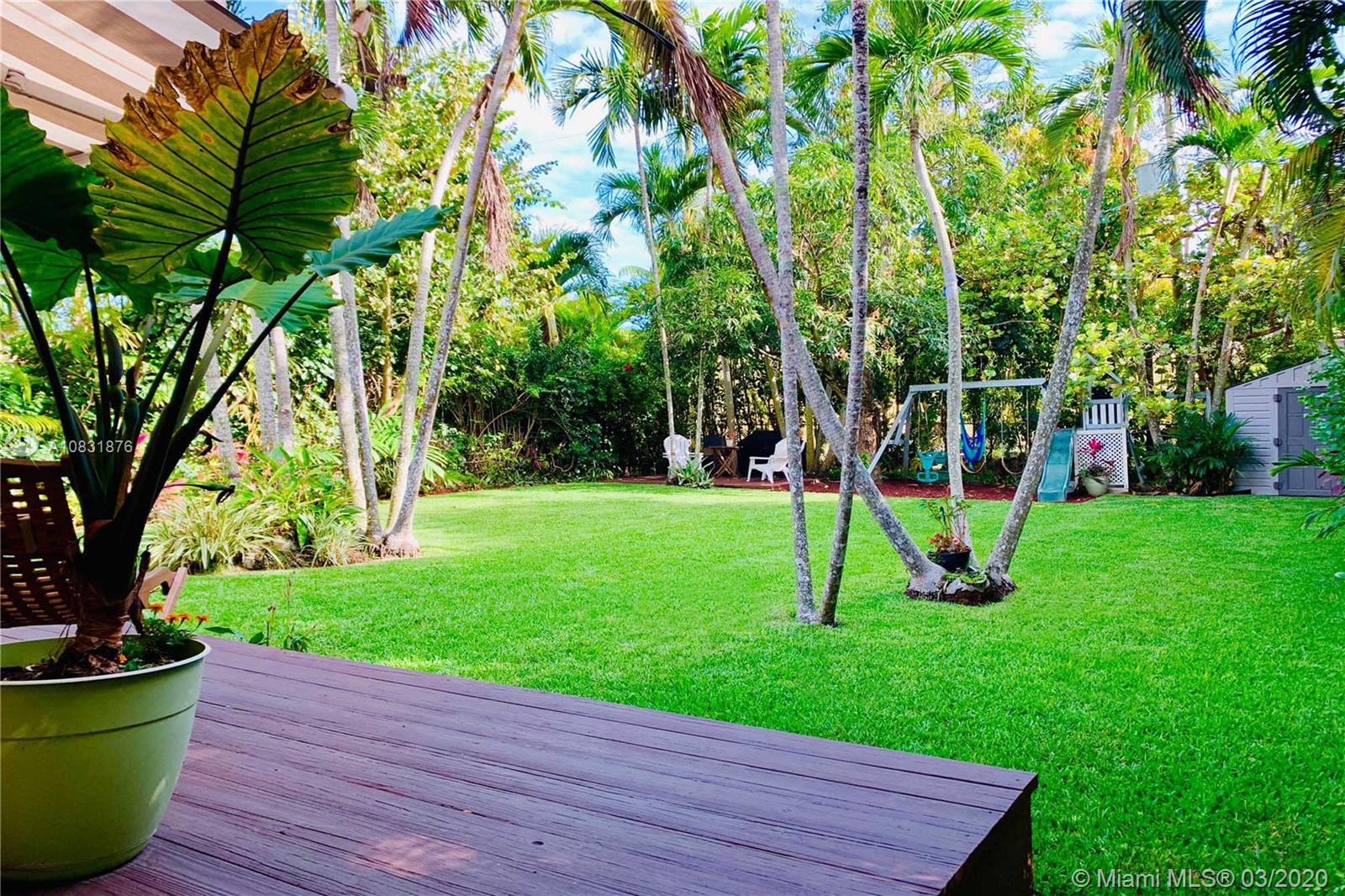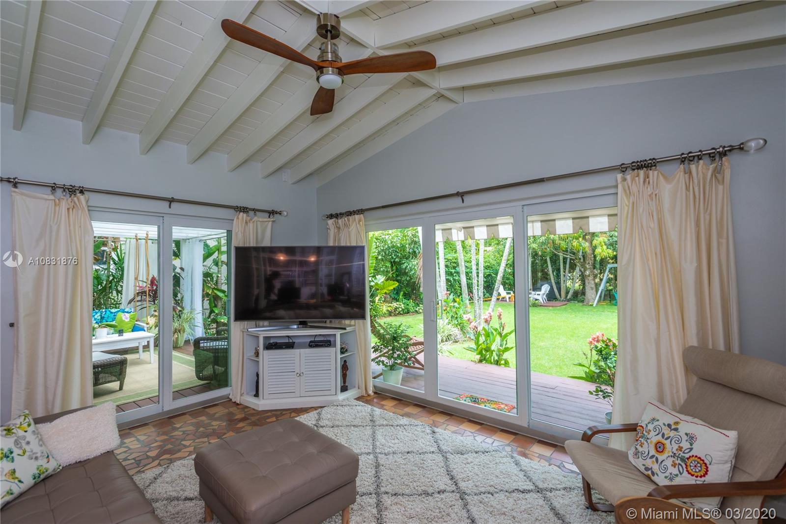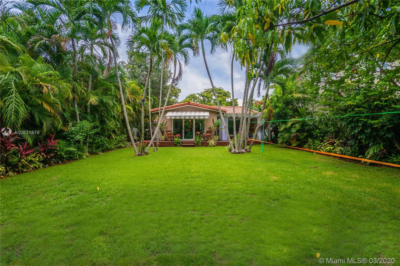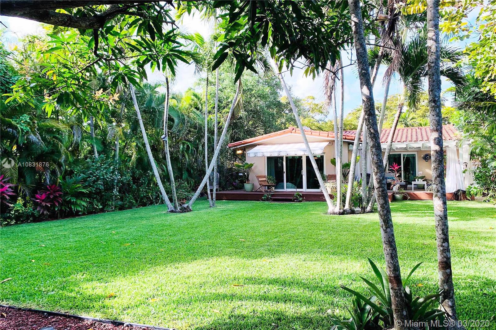 Beautiful Hawaiian garden on rare 7,350 sq ft lot with renovated Coral Gables home. Large Florida room with vaulted ceilings overlooks the tropical fruit garden. Upgrades include remodeled kitchen, new appliances, new impact windows/doors, new instant hot water system, new air-conditioning unit (AHU and A/C), new light/fan fixtures, electrical wiring, plumbing and authentic Chicago Brick driveway. Home also features beautiful hardwood floors and a working fireplace. Home has 2 Bedrooms plus Den, Home Office area and outdoor covered veranda. Lots of room for a pool and/or to extend house.