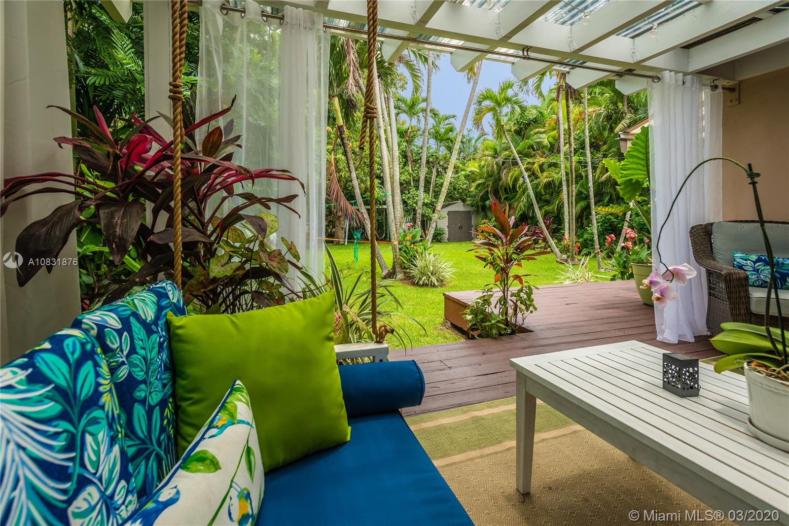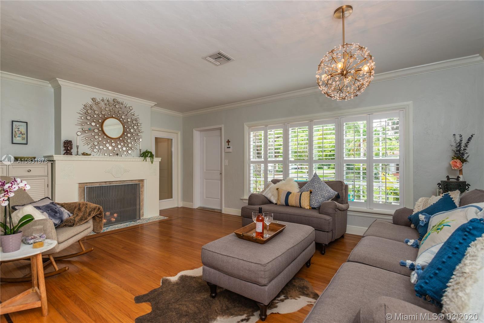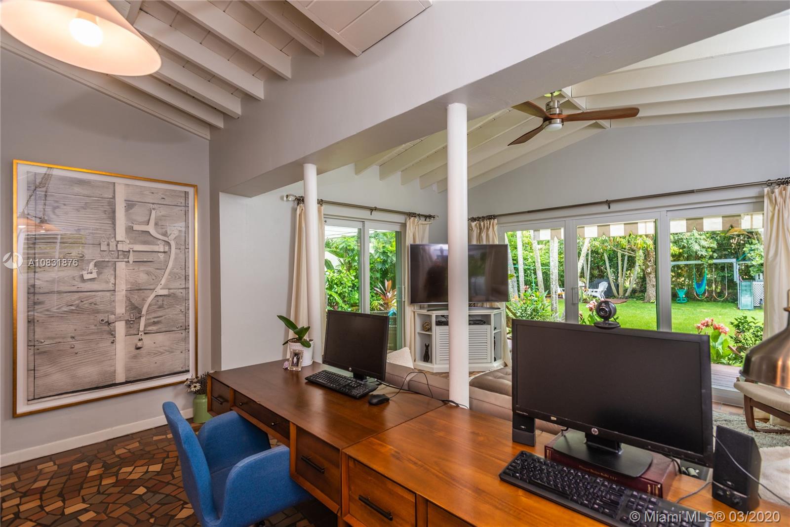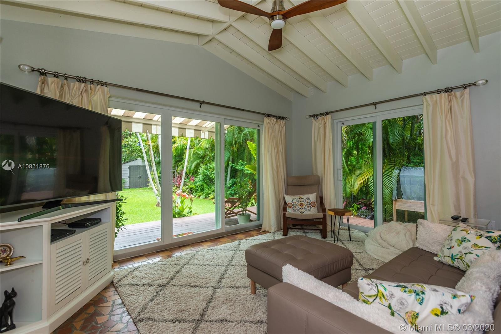 Beautiful Hawaiian garden on rare 7,350 sq ft lot with renovated Coral Gables home. Large Florida room with vaulted ceilings overlooks the tropical fruit garden. Upgrades include remodeled kitchen, new appliances, new impact windows/doors, new instant hot water system, new air-conditioning unit (AHU and A/C), new light/fan fixtures, electrical wiring, plumbing and authentic Chicago Brick driveway. Home also features beautiful hardwood floors and a working fireplace. Home has 2 Bedrooms plus Den, Home Office area and outdoor covered veranda. Lots of room for a pool and/or to extend house.