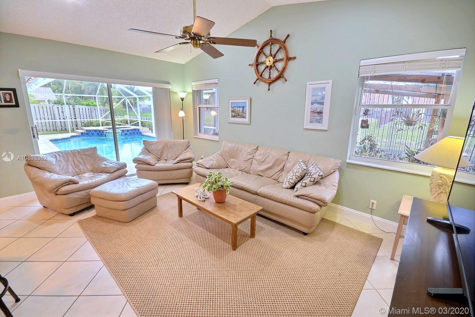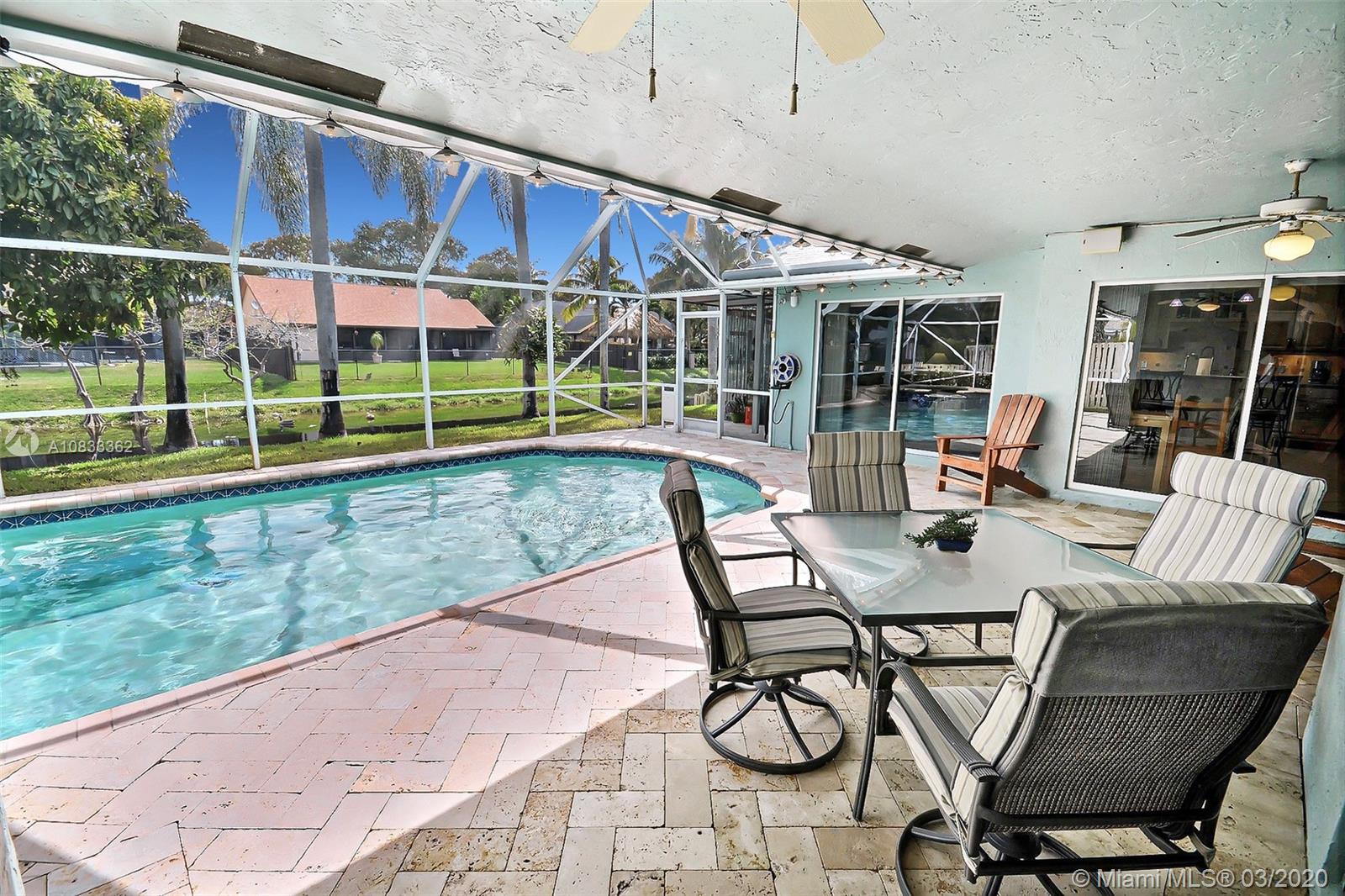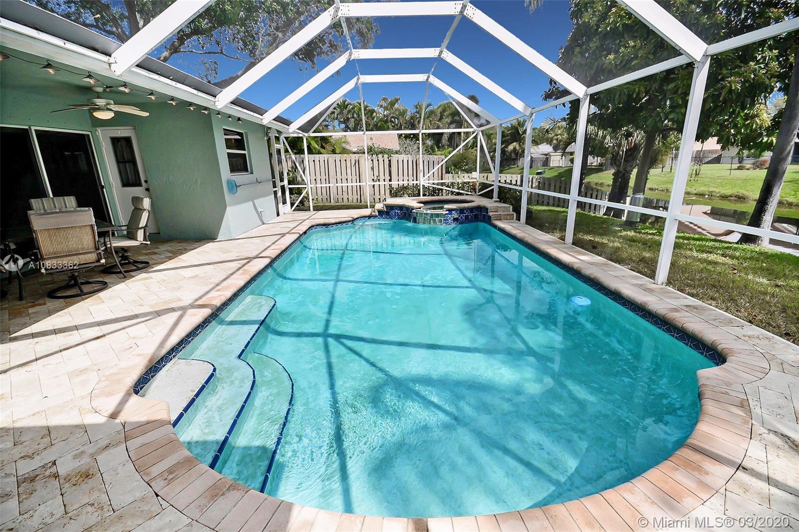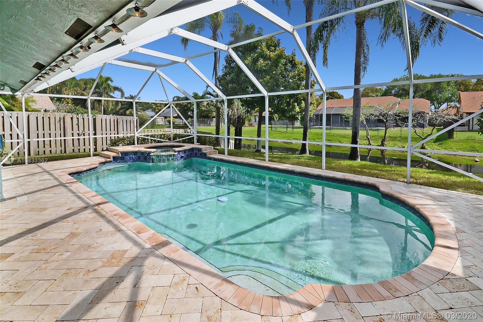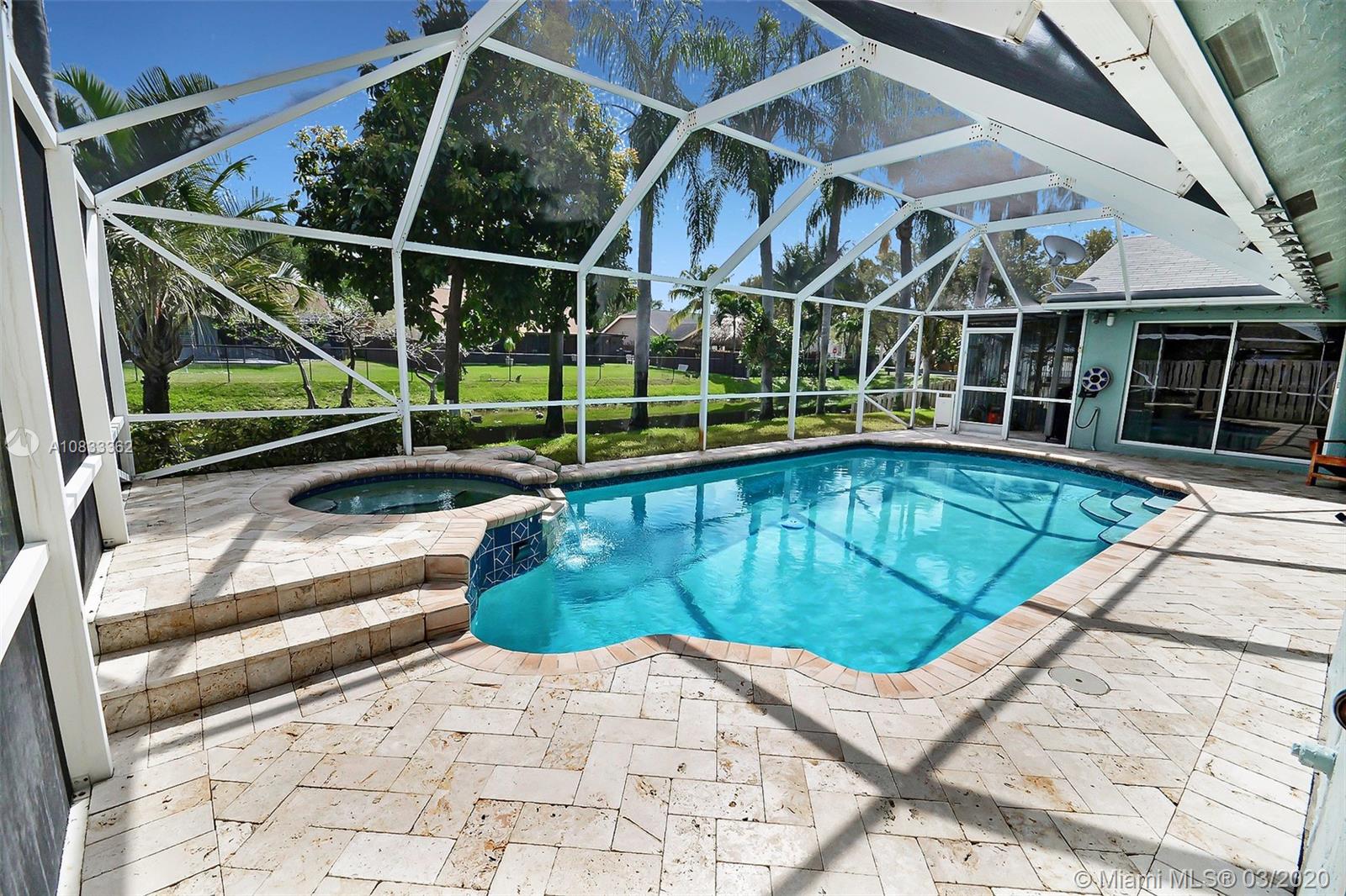 GORGEOUS POOL AND WATERFRONT HOME IN COOPER'S POINT FEATURES: UPDATED KITCHEN WITH TALL WOOD CABINETRY WITH GLASS ACCENTS, GRANITE COUNTERS, ISLAND WITH SECOND SINK, STAINLESS STEEL APPLIANCES, AND A VIEW OF THE SPECTACULAR WATERFRONT POOL AREA. SPACIOUS LIVING AREAS WITH VAULTED CEILINGS, TILE AND PERGO-LIKE FLOORING, RECESSED LIGHTING, CEILING FANS, & TASTEFUL DECOR. LARGE MASTER SUITE WITH HIGH CEILINGS, MASTER BATH WITH DOUBLE SINKS, SEPARATE TUB & SHOWER. CHARMING CURB APPEAL WITH LUSH LANDSCAPING AND TRELLIS ENTRY AND SCREENED-IN PORCH. SERENE BACKYARD WITH BRILLIANT POOL, RELAXING SPA IN SCREENED IN PATIO WITH BEAUTIFUL WATER VIEWS. LAUNDRY ROOM, 2 CAR GARAGE, NEW ROOF 2014, WATER HEATER 2019. ROMANTIC TREE-LINED STREET IN COOPER CITY'S DESIRABLE SCHOOL DISTRICT.