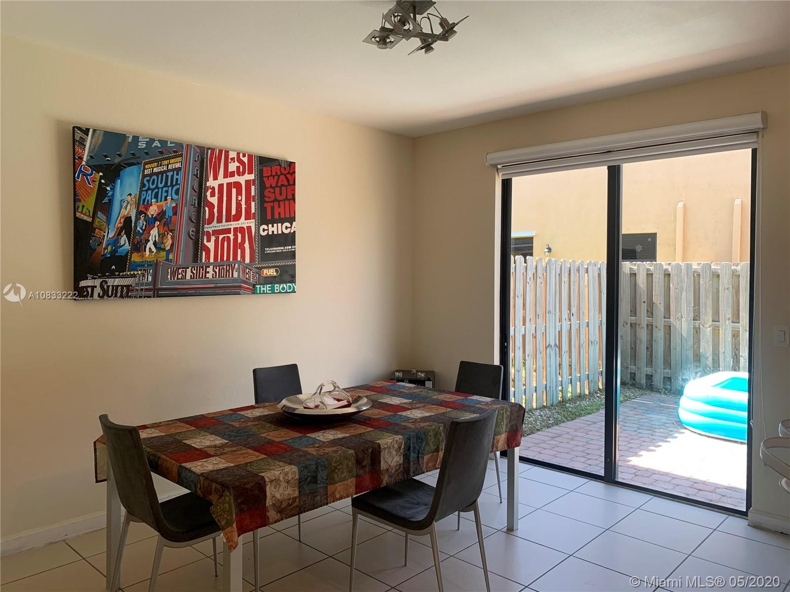 Beautiful townhouse with nice kitchen, stainless steel appliances, tile downstairs and carpet upstairs, fresh painted, washer and dryer large capacity, fenced patio, car garage with paved driveway for 2 cars, excellent condition, low HOA fee. Few steps from guest parking area, excellent location, a + schools, club house, close to everything: shopping centers, malls, Miami intl airport, mayor’s highways, etc… HOA approval req.