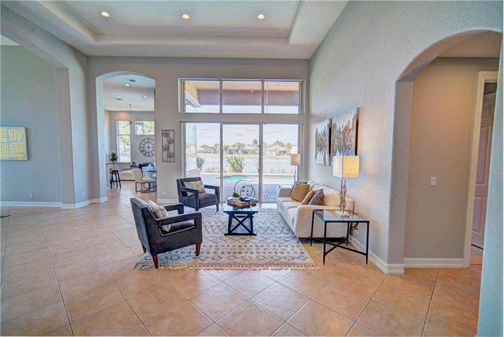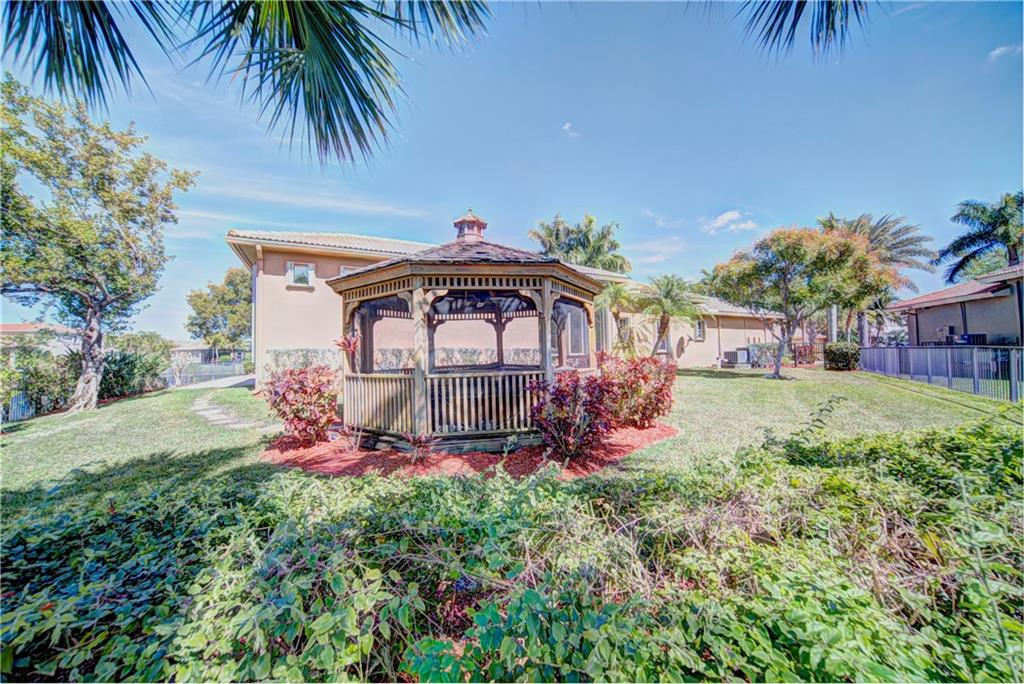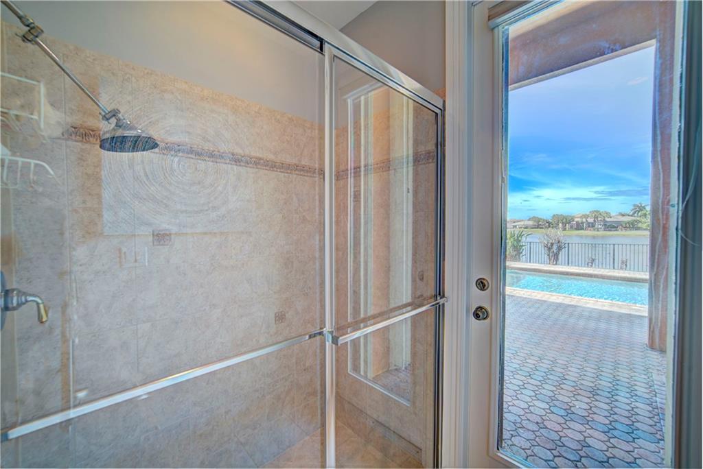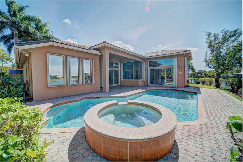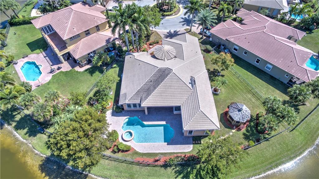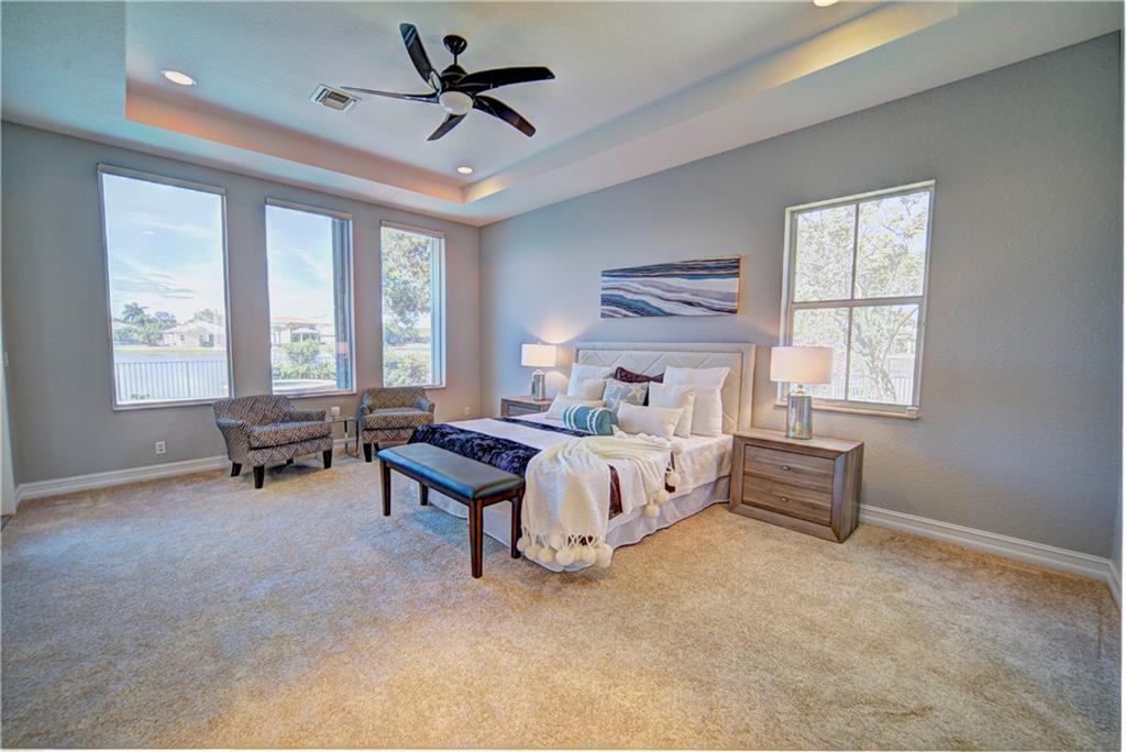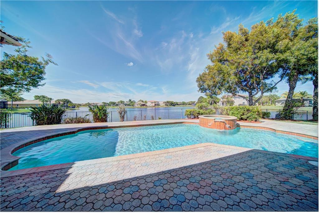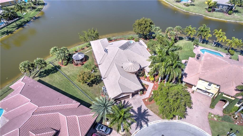 Enjoy sunrise to sunset views from your own backyard in this breathtaking, 175 foot wide waterfront cul-de-sac lot! Freshly painted 4 bedroom, 3 bathroom pool home with neutral tile floor, brand new carpeting in all bedrooms, and accordion shutters throughout. Master suite has amazing views of the pool and lake, in addition to his & hers built-in walk-in closets, bath with dual vanity sinks, glass shower, and whirlpool spa tub. Soaring 15 foot ceilings throughout main living areas. Open kitchen with granite countertops, wood cabinets, and island with bar stool seating. Bonus area perfect for office or game room. Large fenced-in yard for families and pets, screened-in Gazebo on side of house. Live in an exclusive guard gated community with resort style amenities and attend A rated schools!