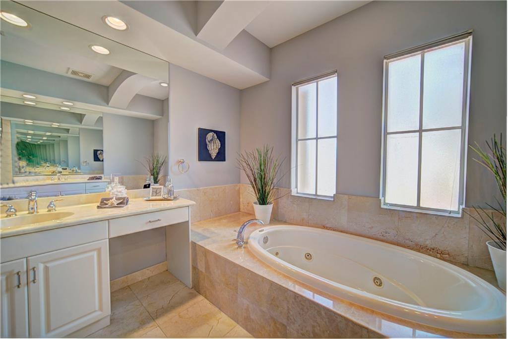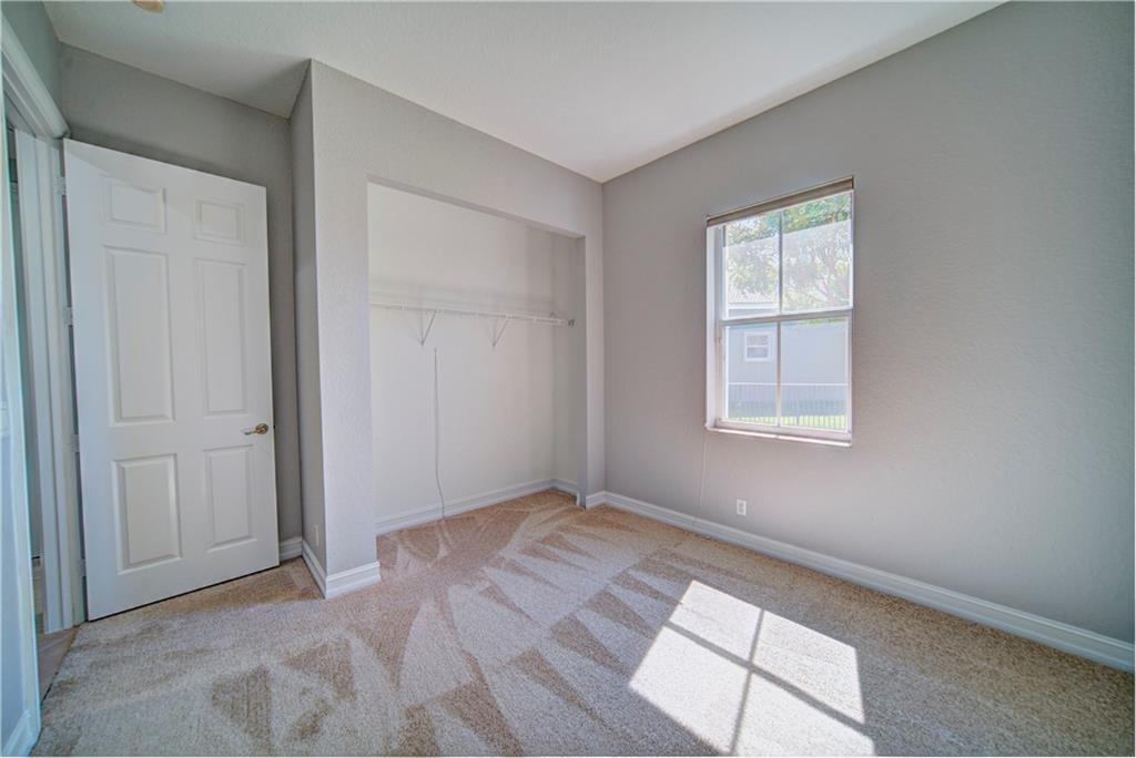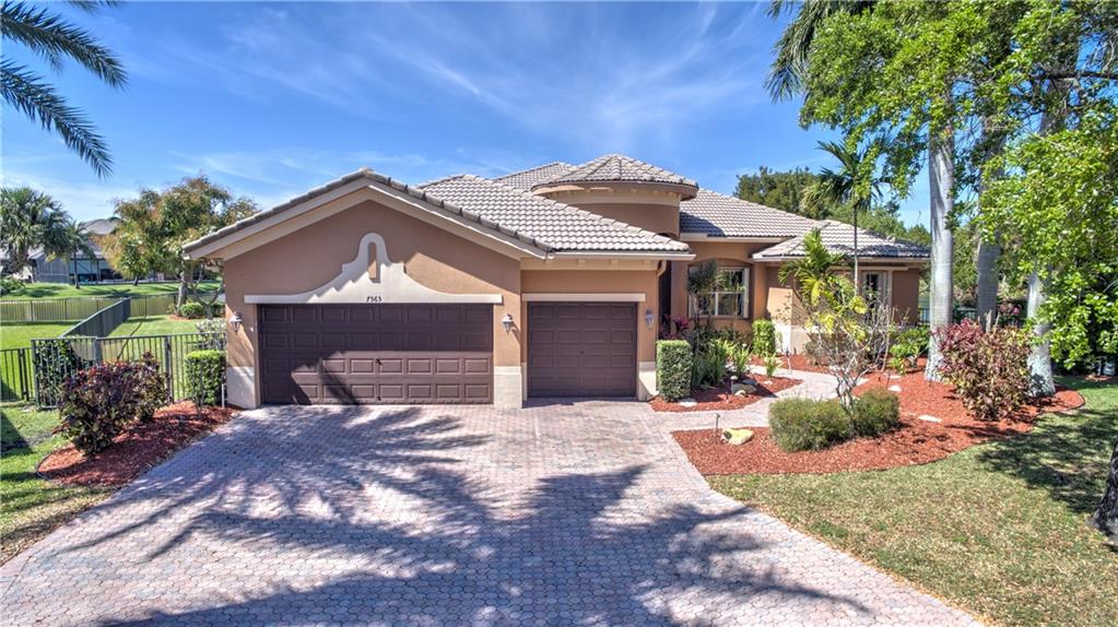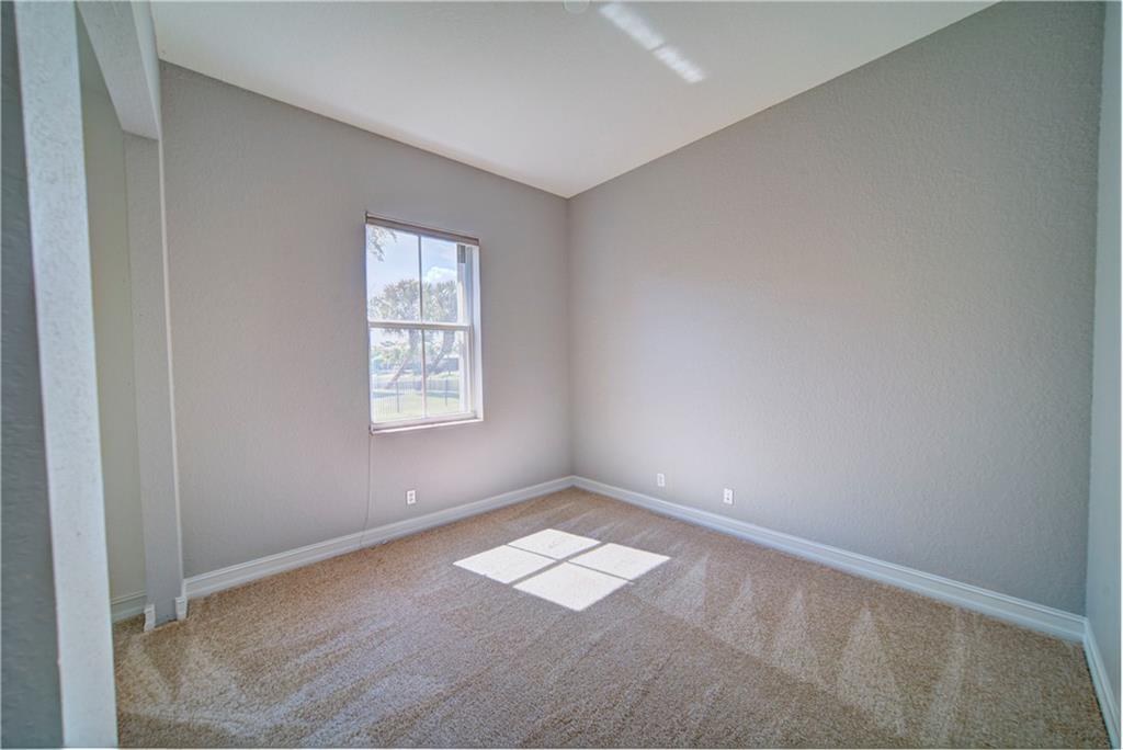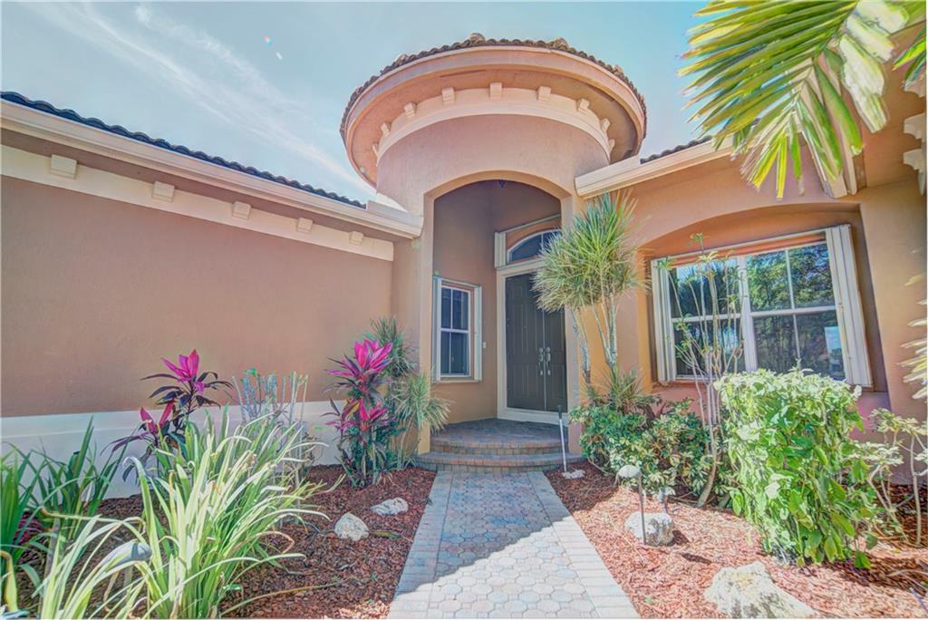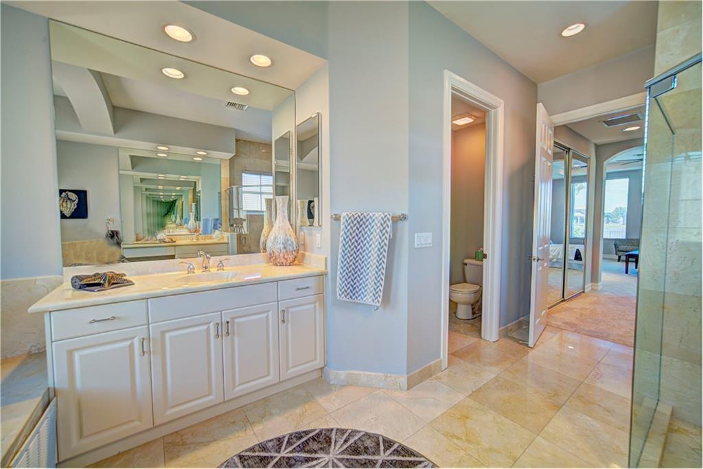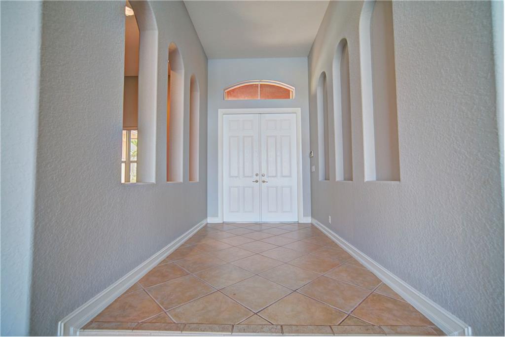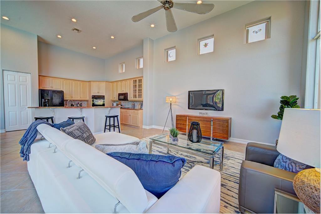 Enjoy sunrise to sunset views from your own backyard in this breathtaking, 175 foot wide waterfront cul-de-sac lot! Freshly painted 4 bedroom, 3 bathroom pool home with neutral tile floor, brand new carpeting in all bedrooms, and accordion shutters throughout. Master suite has amazing views of the pool and lake, in addition to his & hers built-in walk-in closets, bath with dual vanity sinks, glass shower, and whirlpool spa tub. Soaring 15 foot ceilings throughout main living areas. Open kitchen with granite countertops, wood cabinets, and island with bar stool seating. Bonus area perfect for office or game room. Large fenced-in yard for families and pets, screened-in Gazebo on side of house. Live in an exclusive guard gated community with resort style amenities and attend A rated schools!